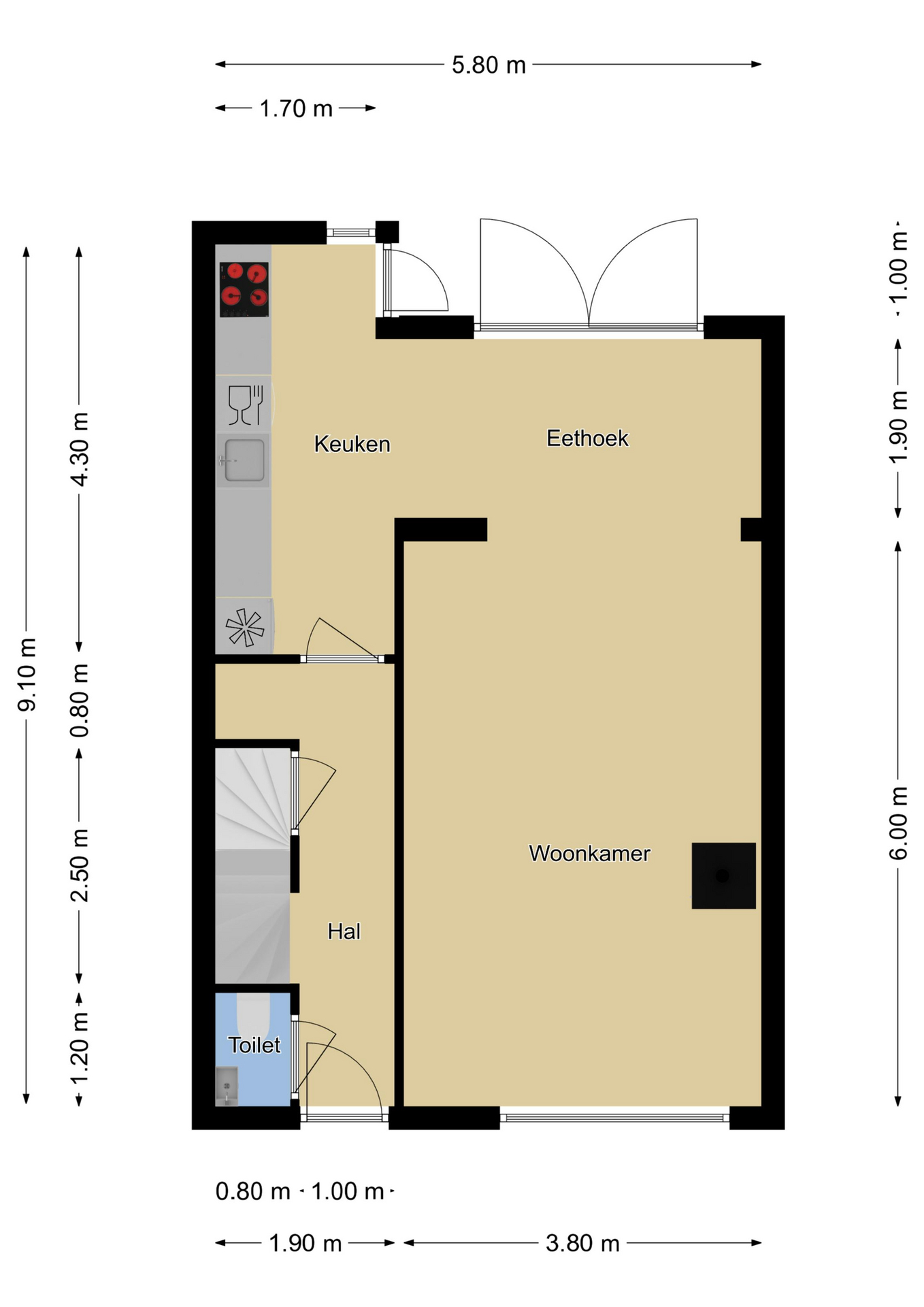 Woonkamer is met 3,8m binnenmaat breder dan gemiddeld