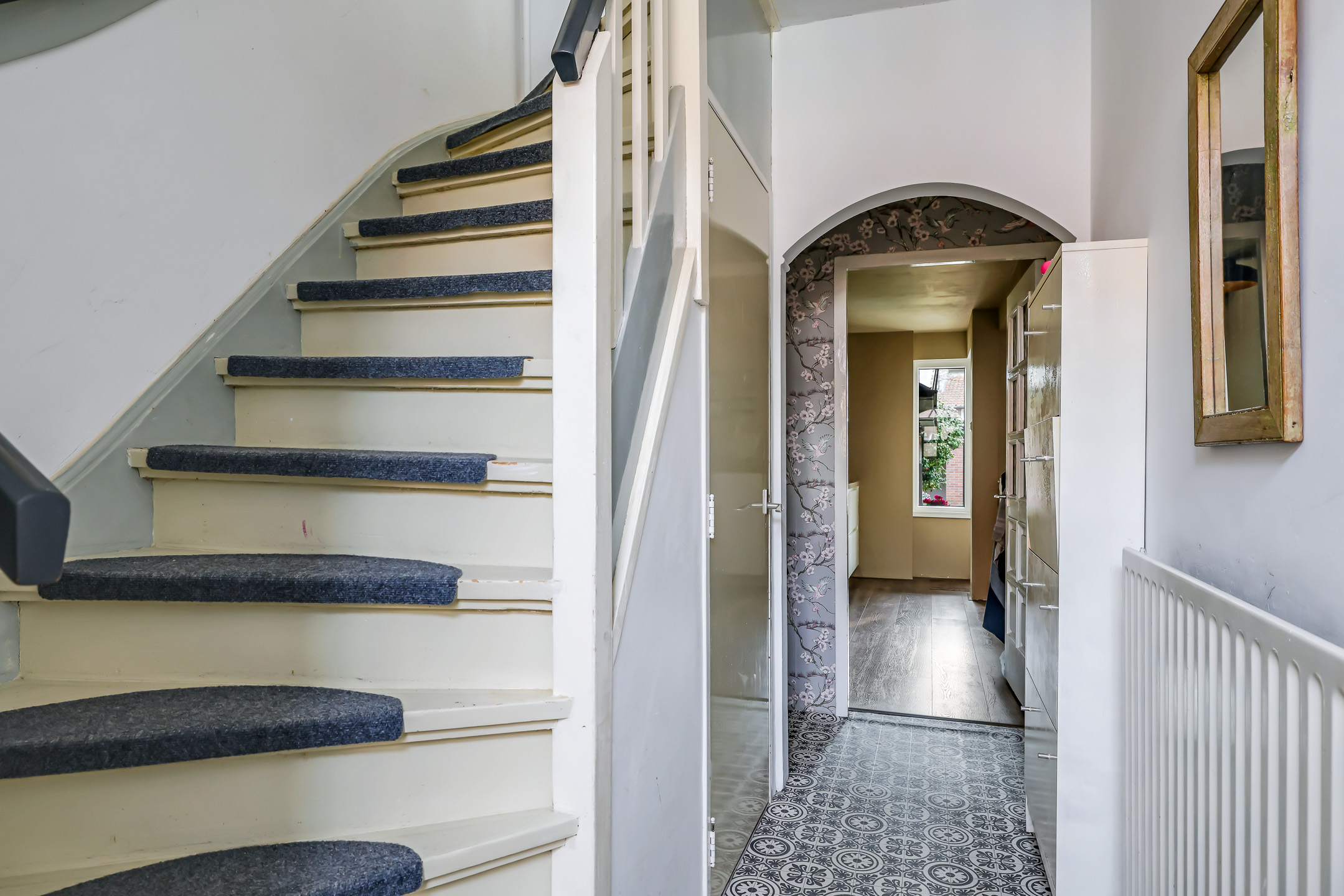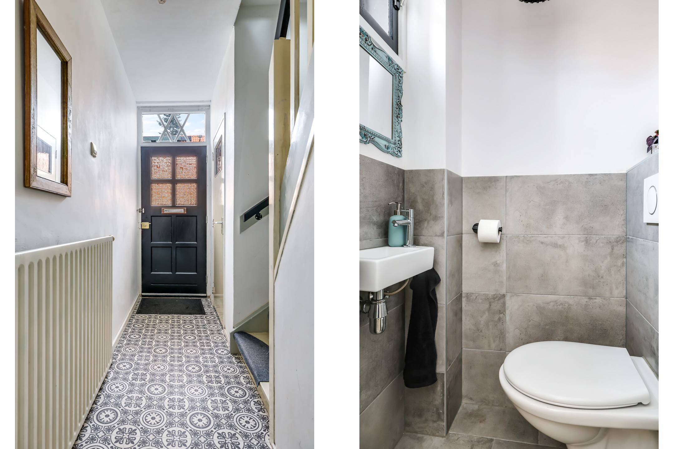 Graag vertellen wij ook wat meer over de hal en de kelder. Je komt hier namelijk binnen door de originele voordeur met karakteristiek ruitje erboven. Hou je van authentieke elementen, dan ga je dit mooi vinden. De hal is bijna 5 meter lang met vooraan het toilet en achterin een garderobenis. Hier kun je een kapstok kwijt. Het toilet is in 2024 vernieuwd en voorzien van een modern, zwevend toilet en een fonteintje.