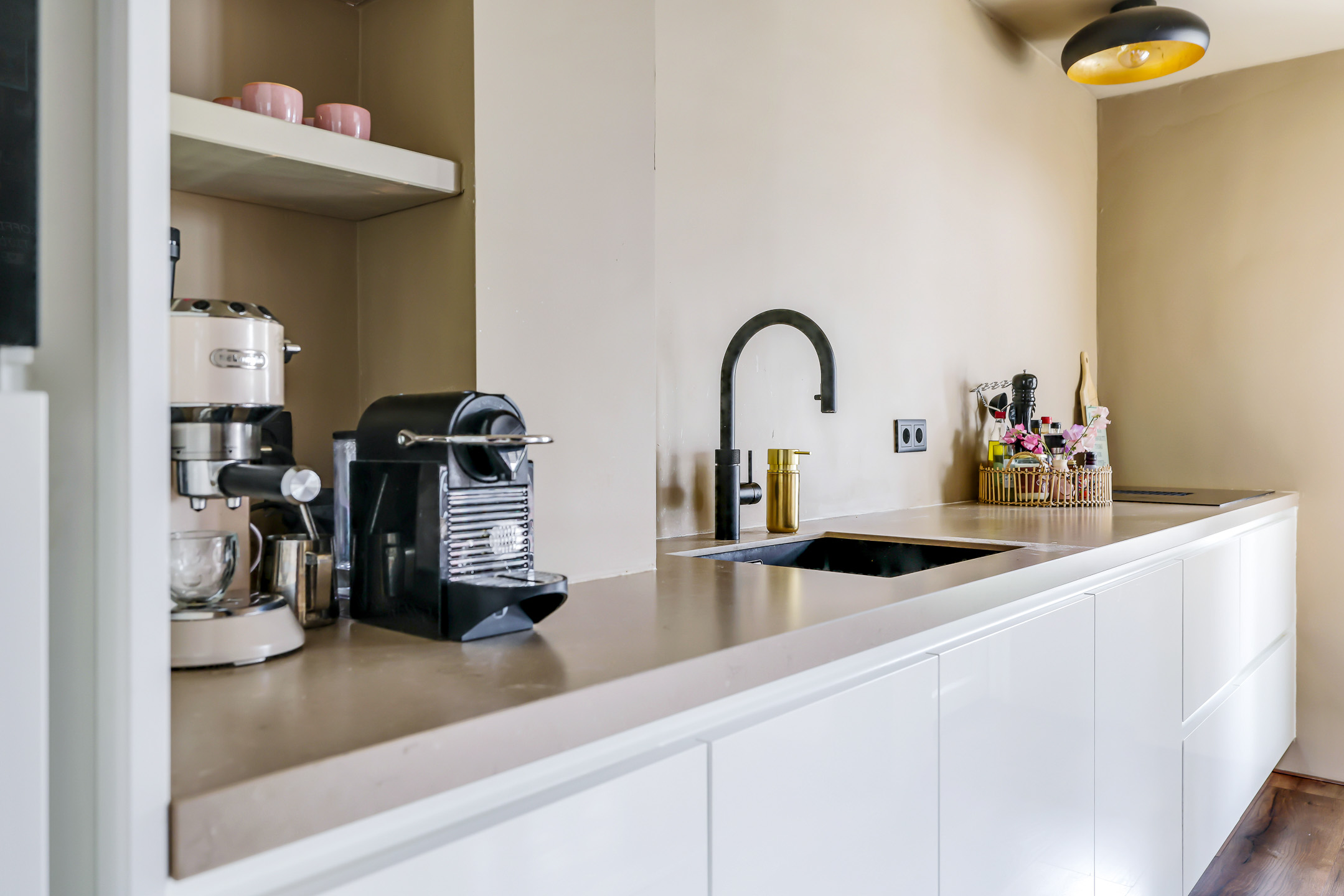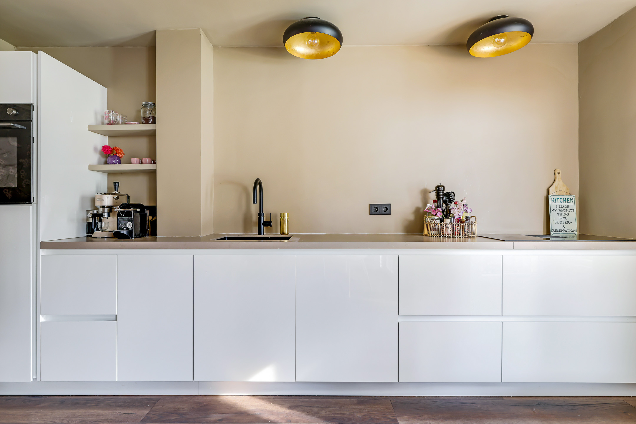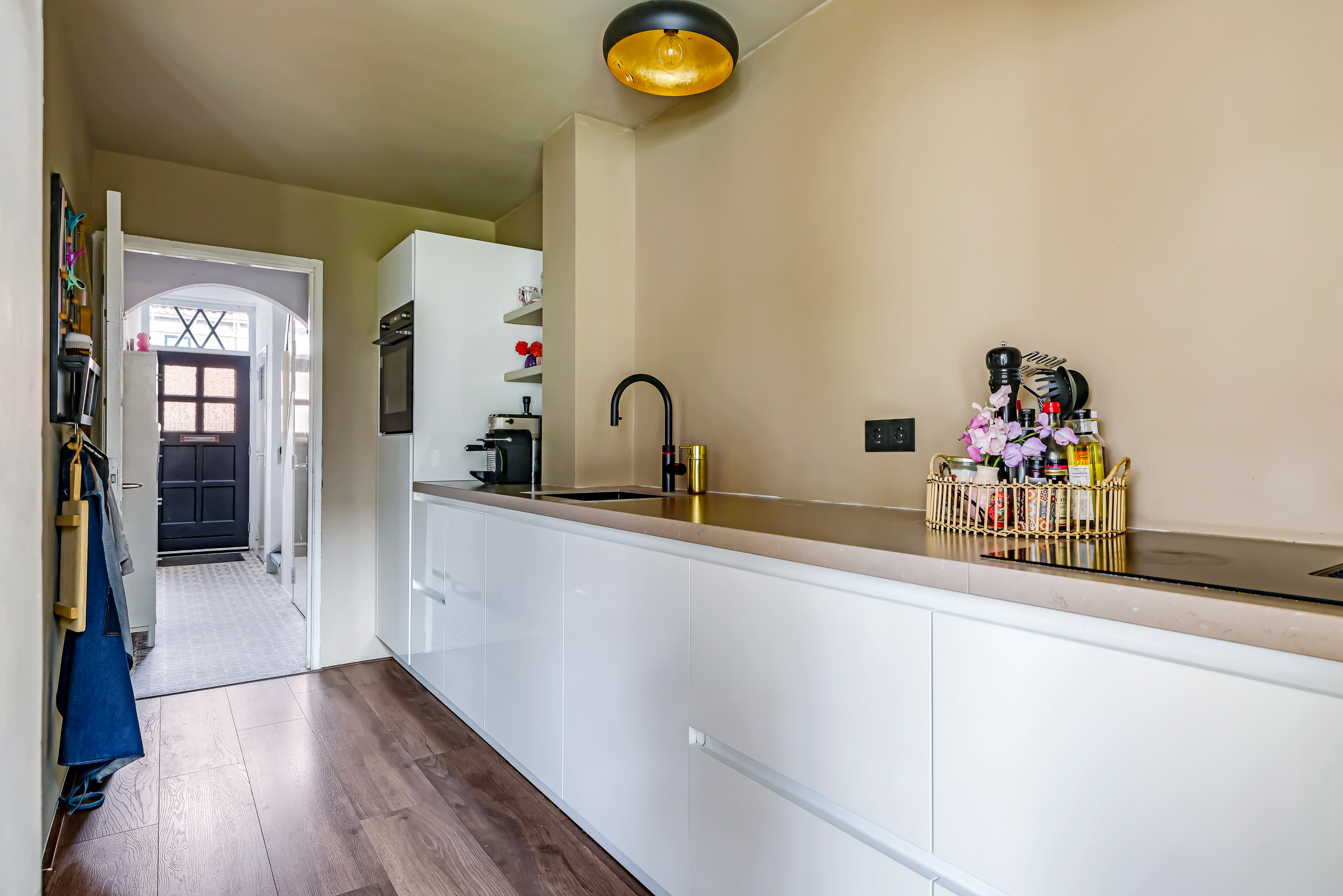 De keuken heeft een open karakter met de woonkamer, maar toch kijk je vanaf de bank niet direct op het aanrecht. Er is gekozen voor een lang keukenblok (4,3m lang) waardoor je tegelijkertijd ook veel aanrecht hebt. Dit zal de keukenprins(es) zeker aanspreken, evenals alle aanwezige inbouwapparatuur. Denk daarbij aan een vaatwasser, een koelkast, een grote combi-oven/magnetron en een brede inductie kookplaat met geïntegreerd afzuigsysteem. Overigens is het aanrecht in natuursteen (composiet) uitgevoerd hetgeen de keuken een luxe uitstraling geeft. Brede ladekorven waaronder een ‘blinde’ besteklade zorgen voor praktische opbergruimte. De witte, greep loze fronten in combinatie met strak gestucte wanden zorgen voor een zeer verzorgd en strak geheel.