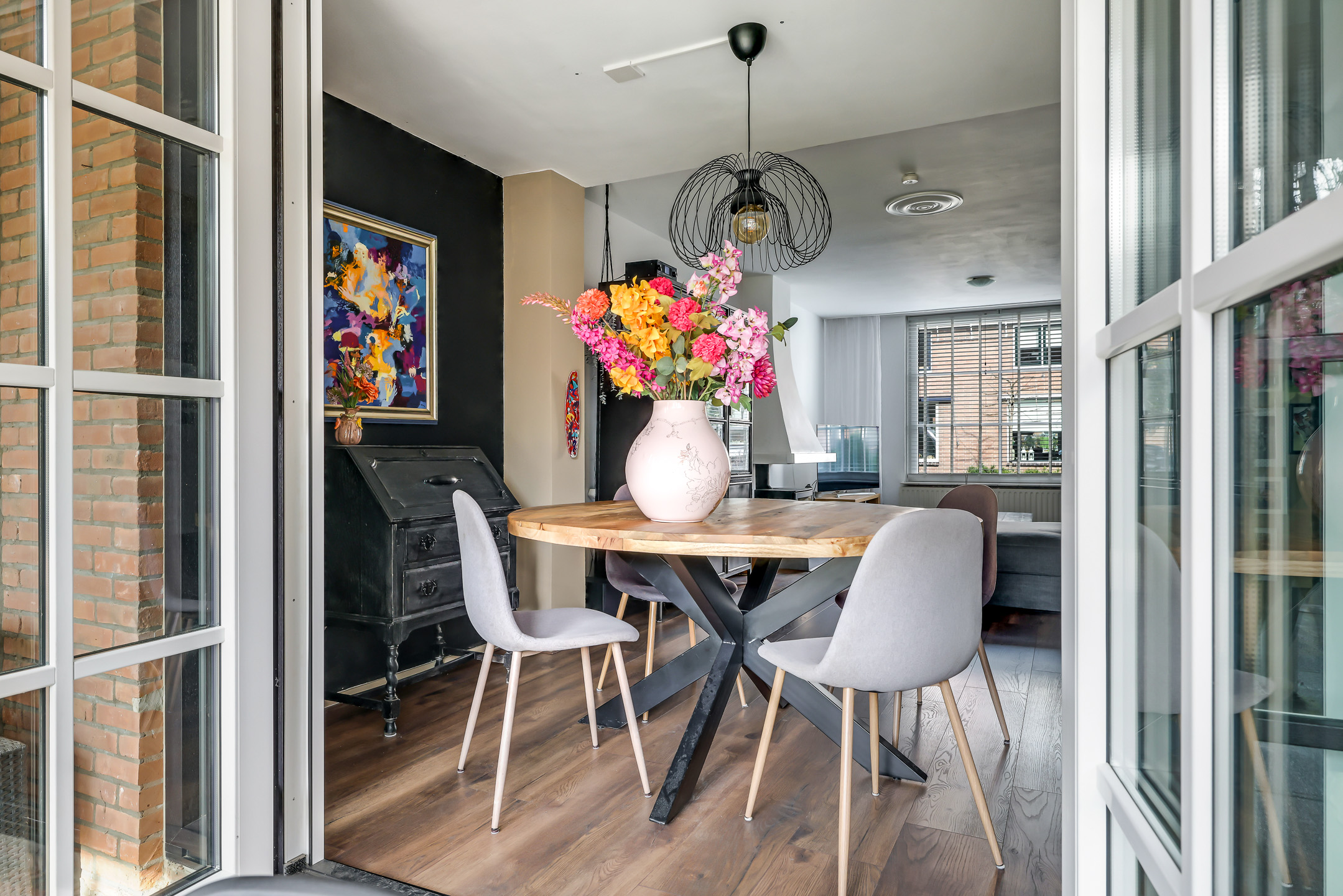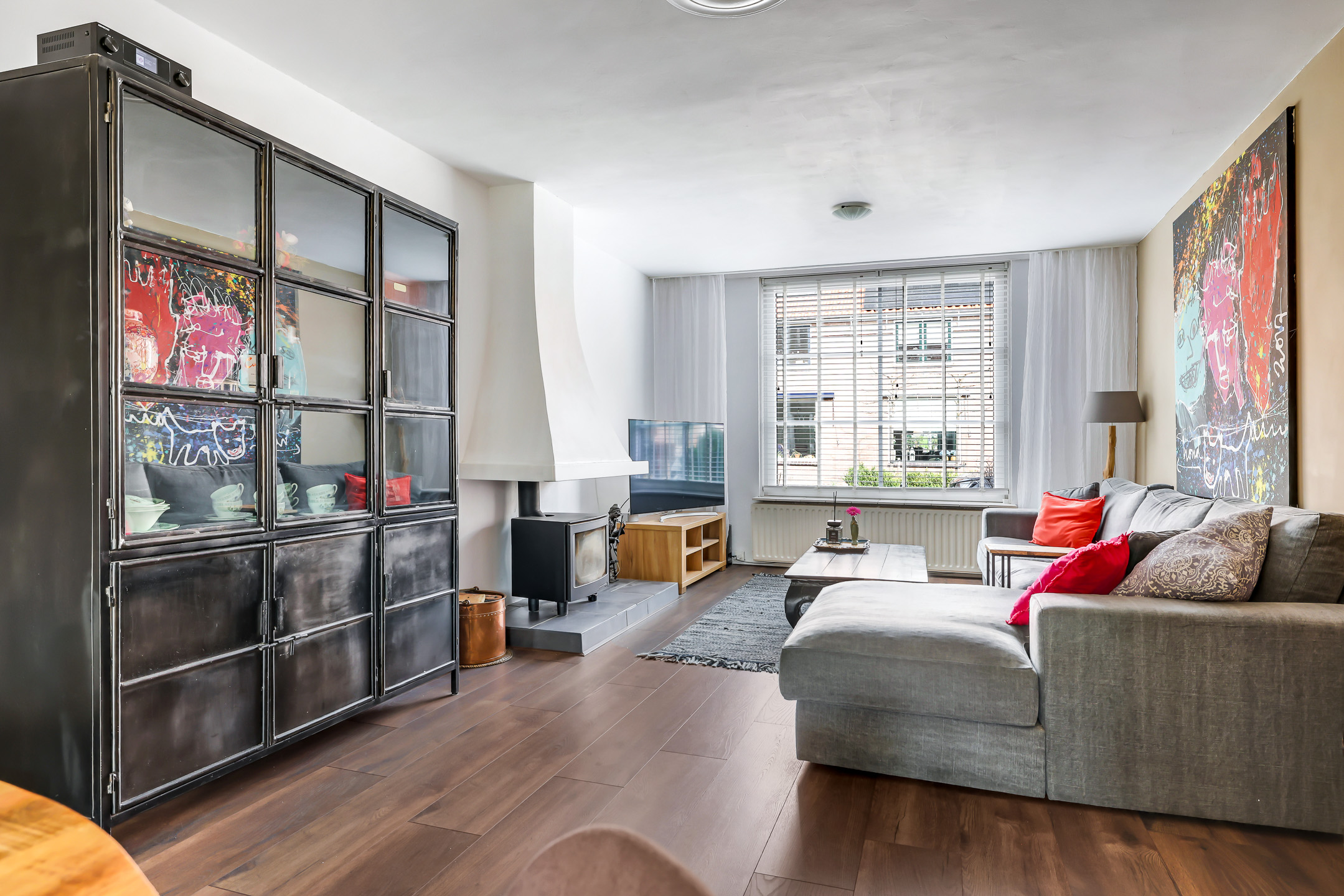 Van oorsprong had deze woning al een opvallend brede woonkamer (3,8m binnenmaat), maar door de aanbouw is de woonkamer nog groter geworden. Hierdoor kun je gezellige zithoeken creëren, bijvoorbeeld bij de schouw met houtkachel. Je kunt hier prima een grote hoekbank kwijt terwijl in het verlengde van de woonkamer ruimte is voor een eettafel. Noemenswaardig zijn de nieuwe, in zwart uitgevoerde kozijnen waarbij is gekozen voor een karaktervolle roedeverdeling. Niet alleen in het grote voorraam, maar ook in de dubbele terrasdeuren naar de veranda. Deze terrasdeuren zijn overigens voorzien van plissé rolhorren waardoor insecten geen kans krijgen.