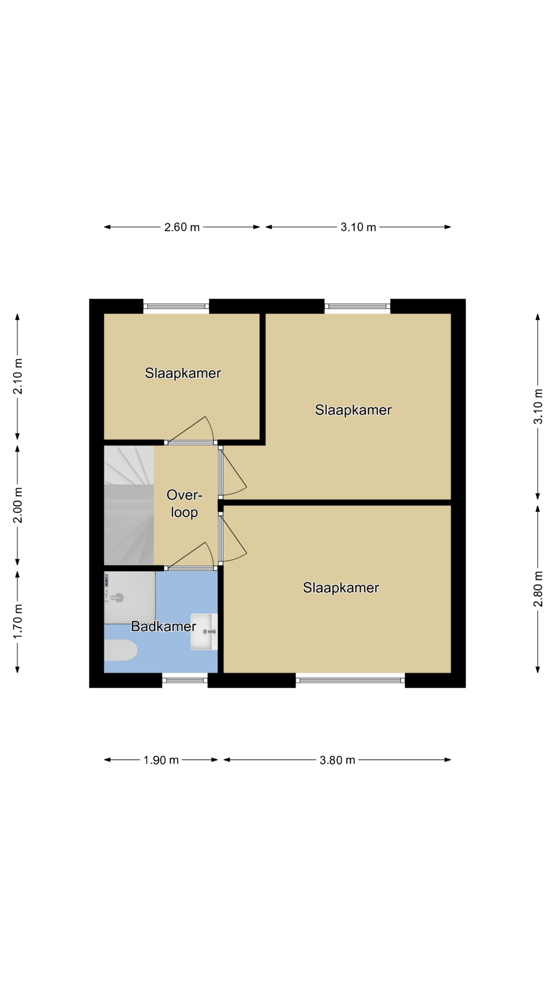 De overloop schakelt 3 slaapkamers en de badkamer aan elkaar. Tevens is er een vaste trap naar de 2e verdieping. De slaapkamers zijn gezellig knus waarbij er op 2 slaapkamers met gemak een 2-persoons bed kan staan. Je zou zelfs kunnen kiezen om aan de voor- of achterzijde van de woning te gaan slapen. Een groot pluspunt zijn ook hier de nieuwe, kunststof kozijnen. Deze zijn niet alleen voorzien van HR++ beglazing maar ook van draai/kiepramen met inzethorren. Hierdoor kun je de slaapkamers praktisch ventileren.