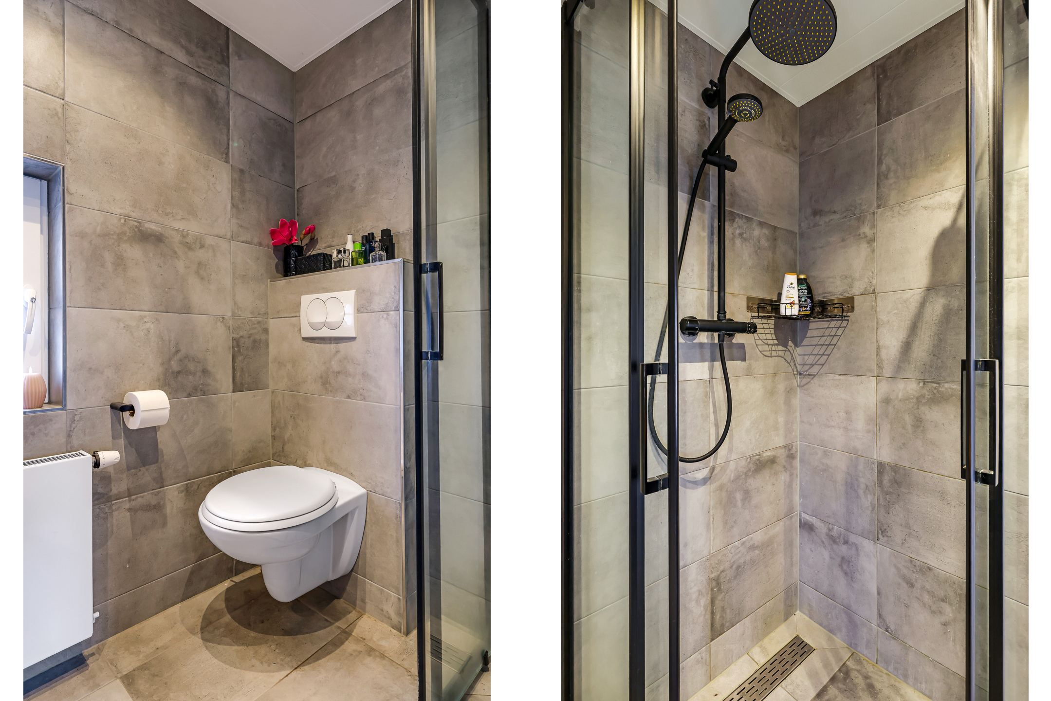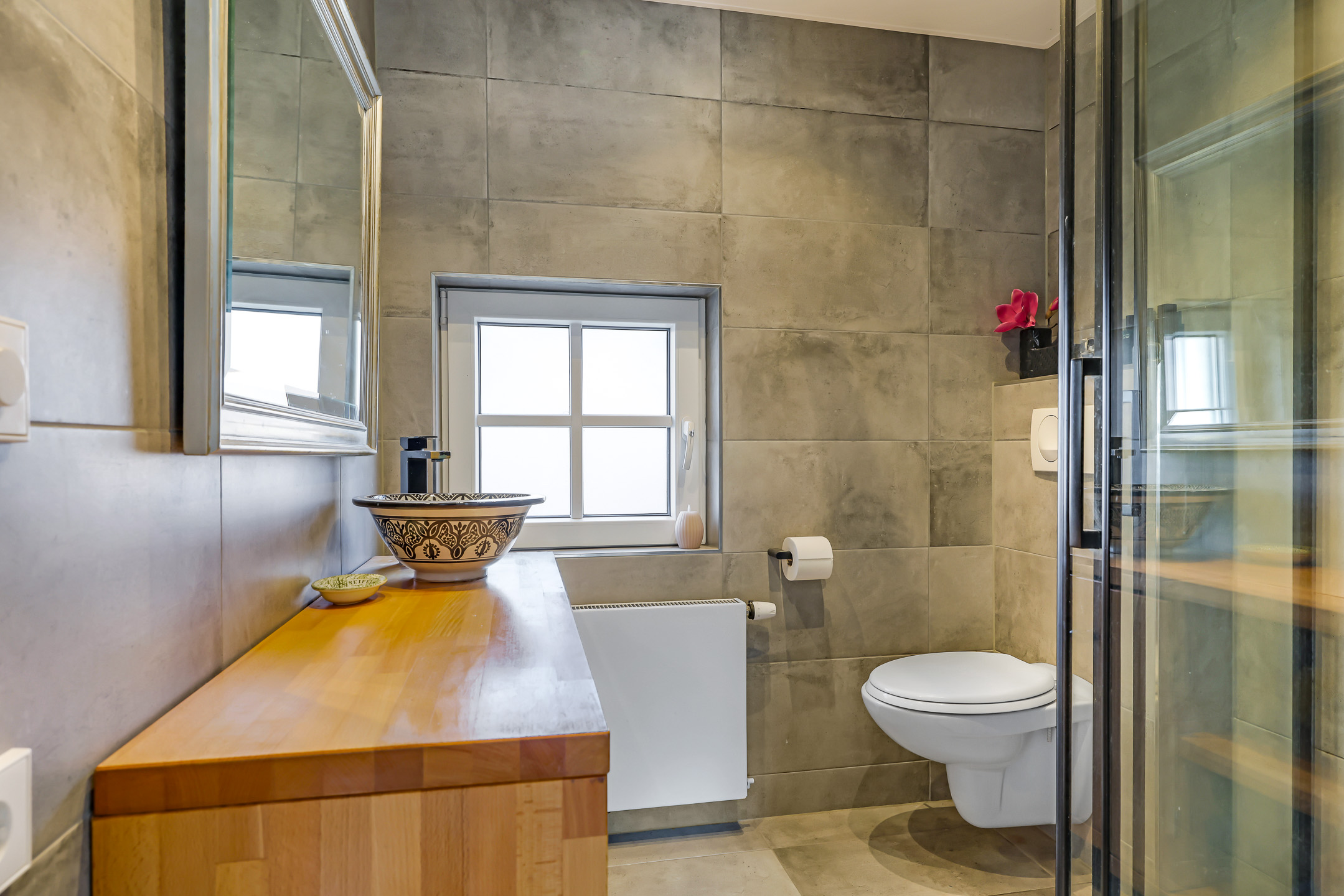 Net als de keuken en het toilet is ook de badkamer pas enkele jaren jong (2023). Dit is zo’n badkamer die velen zal aanspreken omdat er goede en trendy keuzes zijn gemaakt. De ruimte is ingedeeld met een inloopdouche, een wastafelmeubel en een 2e toilet. De douche bestaat uit glaspanelen in een zwart stalen frame, een rainshower en een handdouche. Het wastafelmeubel is een echte eyecatcher. Op een massief houten wasmeubel staat een kleurrijke waskom van mozaïek. Tegelijkertijd kun je naast de waskom veel toiletspullen uitstallen. En uiteraard is ook hier het toilet zwevend als een wandcloset geplaatst. Het tegelwerk is strak en modern te noemen, evenals het stucplafond die is voorzien van inbouwspots. Erg praktisch is het aanwezige draai/kiepraam. Dit zorgt niet alleen voor daglicht, maar ook voor de ideale ventilatiemogelijkheid.
