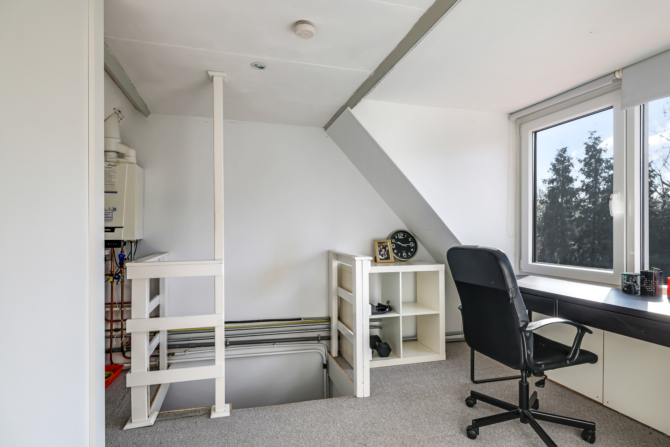 Voorzolder met dakkapel, een studie/werkhoek, een vaste kast en een vlizoluik naar vliering