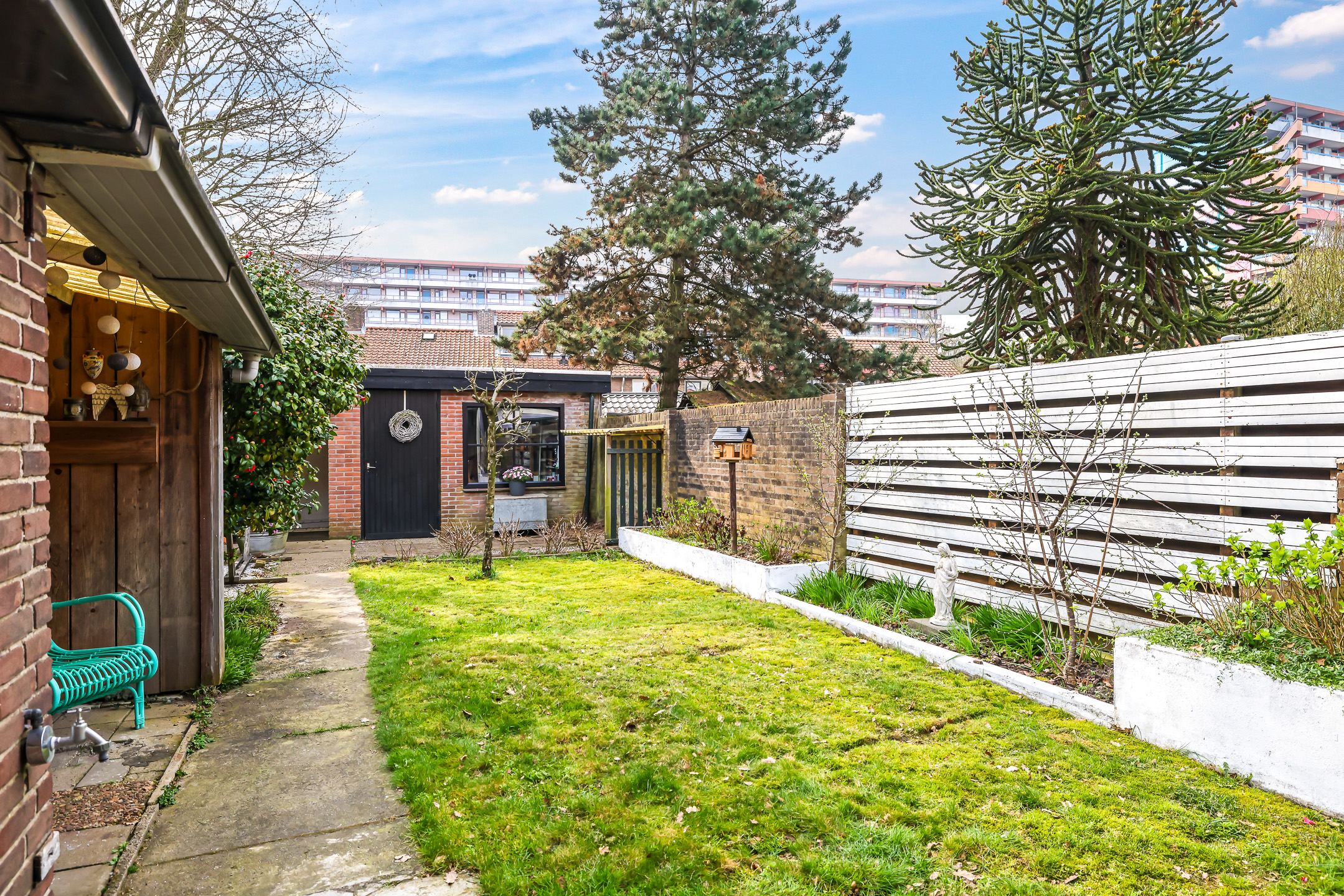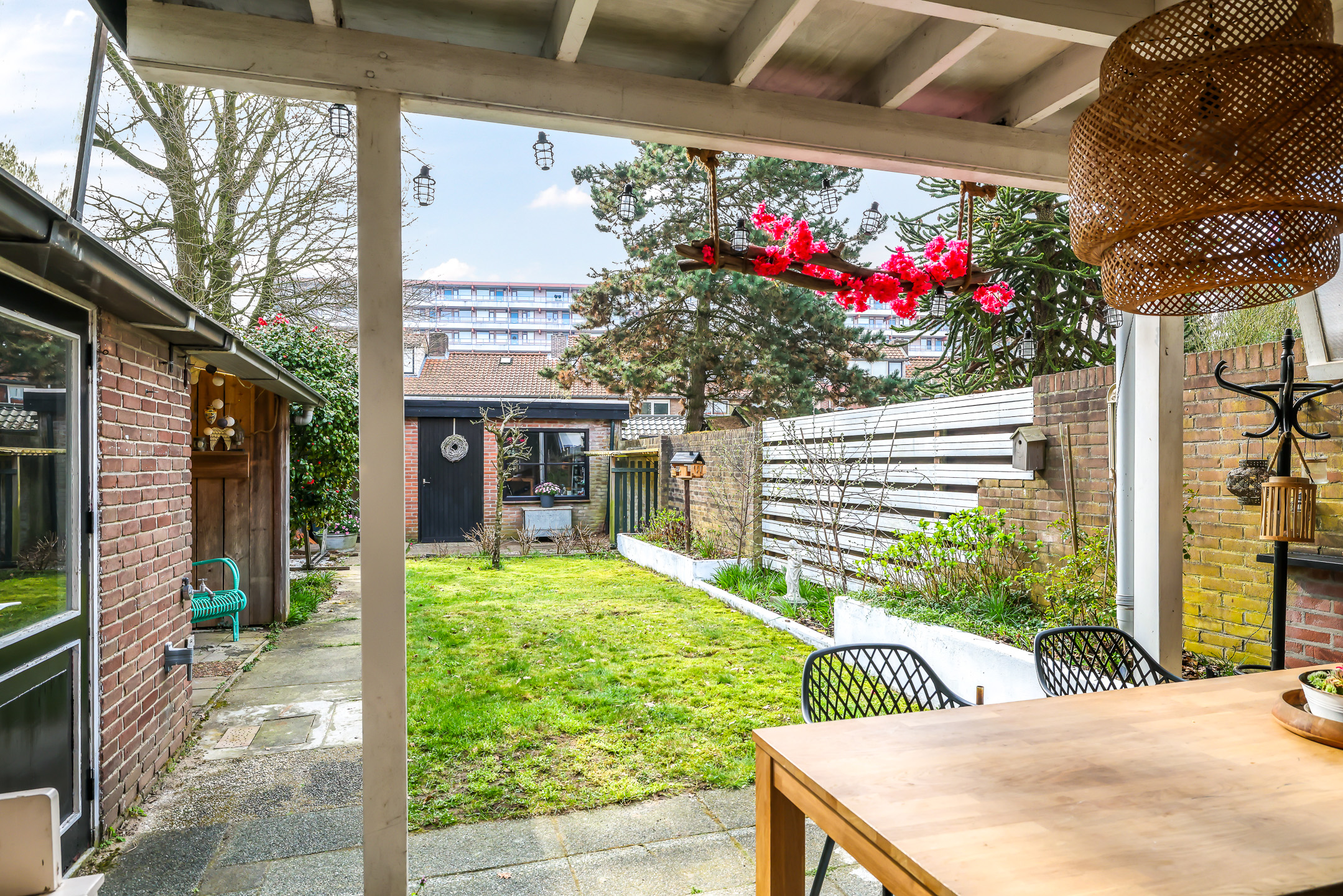 Waar vind je tegenwoordig bij een tussenwoning nog een achtertuin van bijna 20 meter diep? Deze woning is goed bedeeld voor wat betreft het buitenleven. En ben je een zonliefhebber, dan kan je geluk helemaal niet op aangezien deze achtertuin pal op het zuiden is gelegen en daardoor maximaal aantal zonuren geniet. En doordat je tuin zo diep is, wonen de ‘achterburen’ ook veel verder weg waardoor je relatief veel privacy geniet. Deze achtertuin heeft een groen karakter met bloemborders en een gazon. Indien gewenst zou je hier prima een trampoline of een hangmat neer kunnen zetten zonder dat de tuin gelijk vol is.