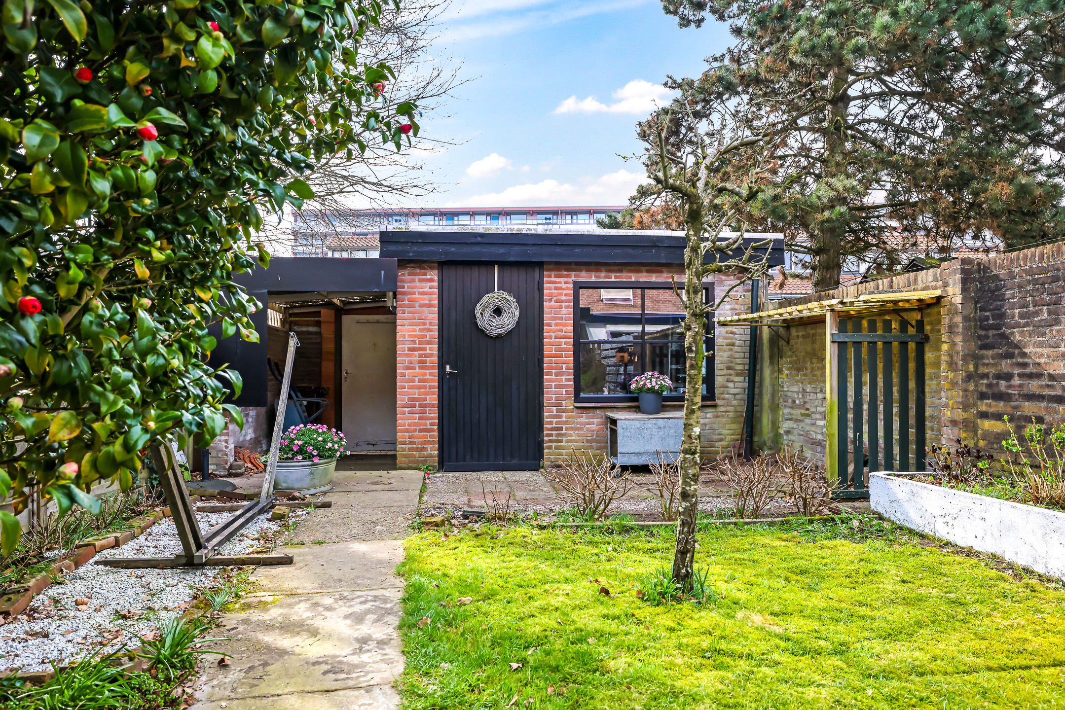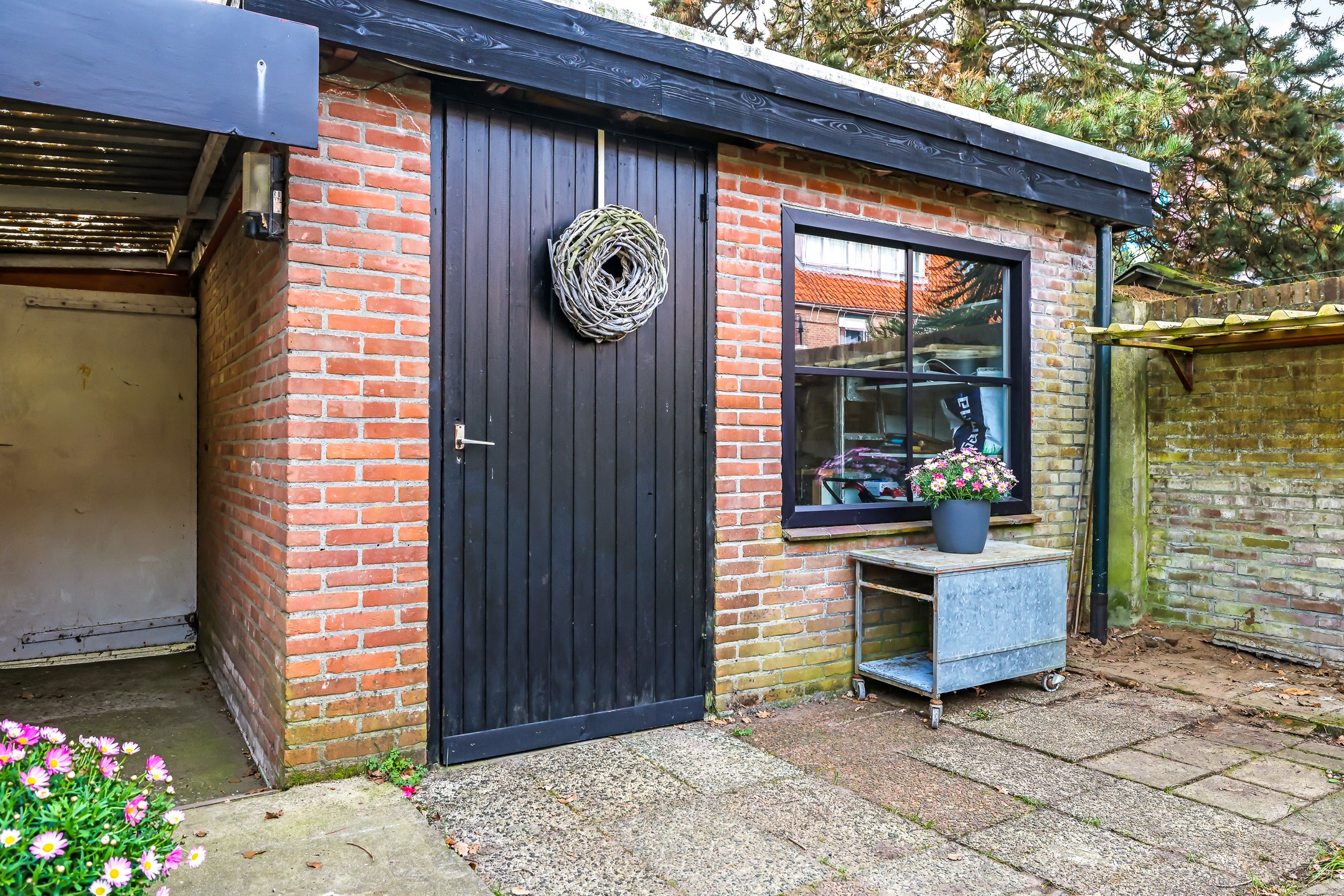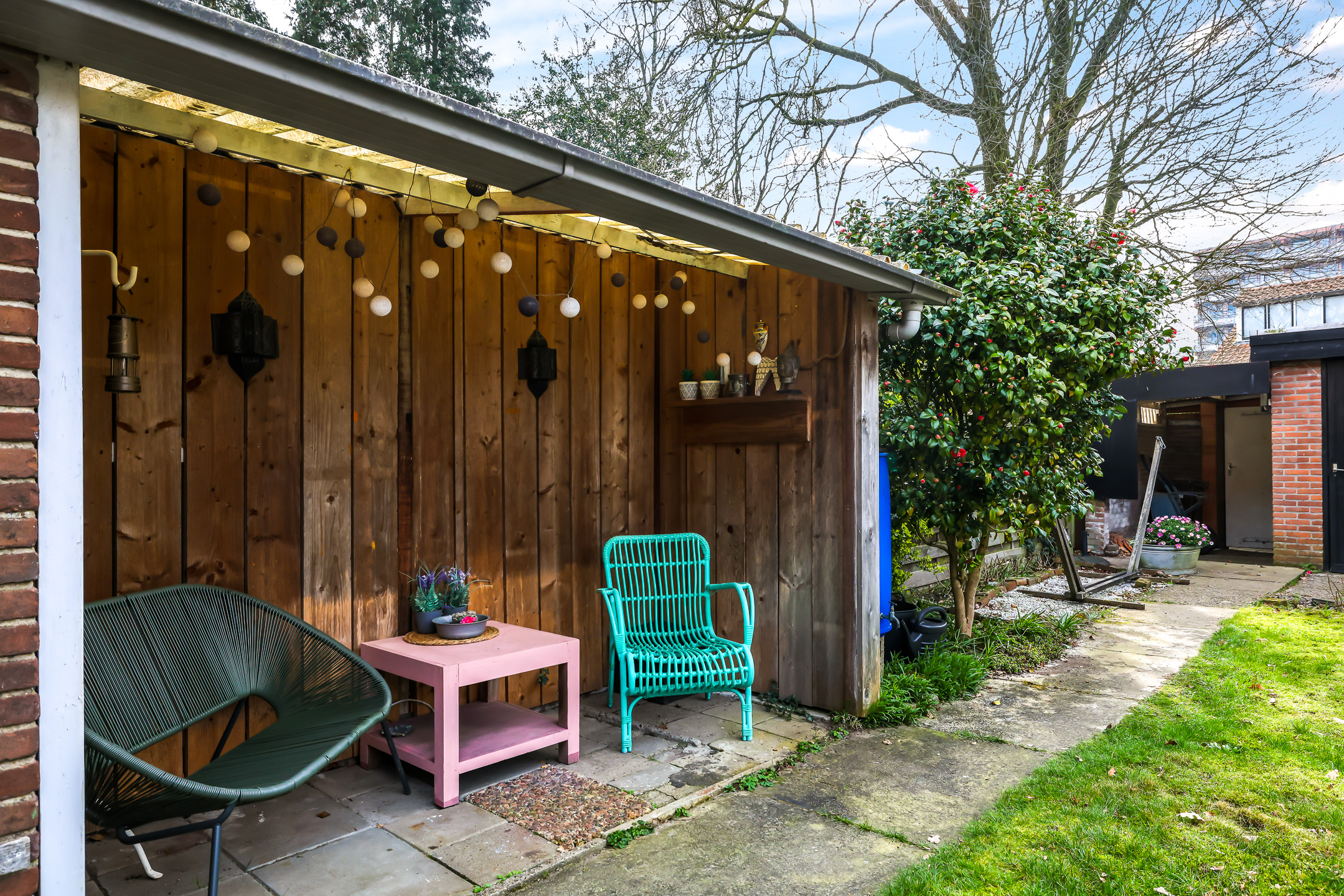 Grote schuur achterin de tuin met overkapping en achterom