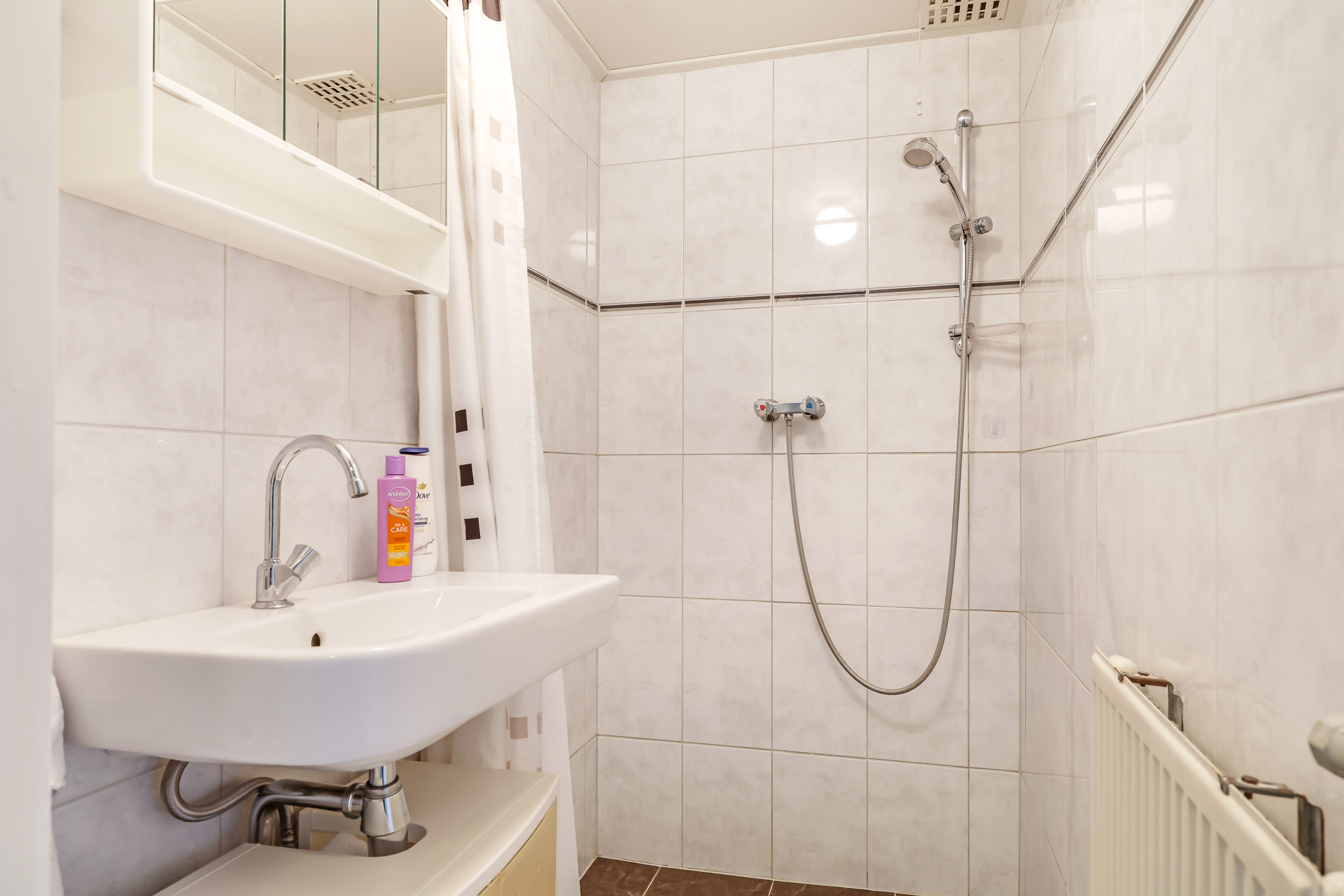 Badkamer met douche en wastafel