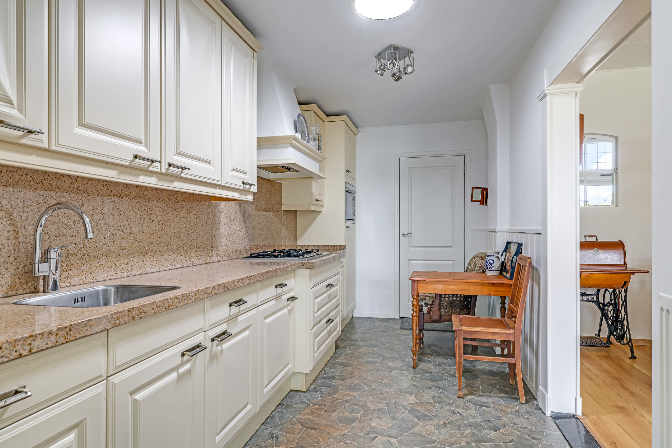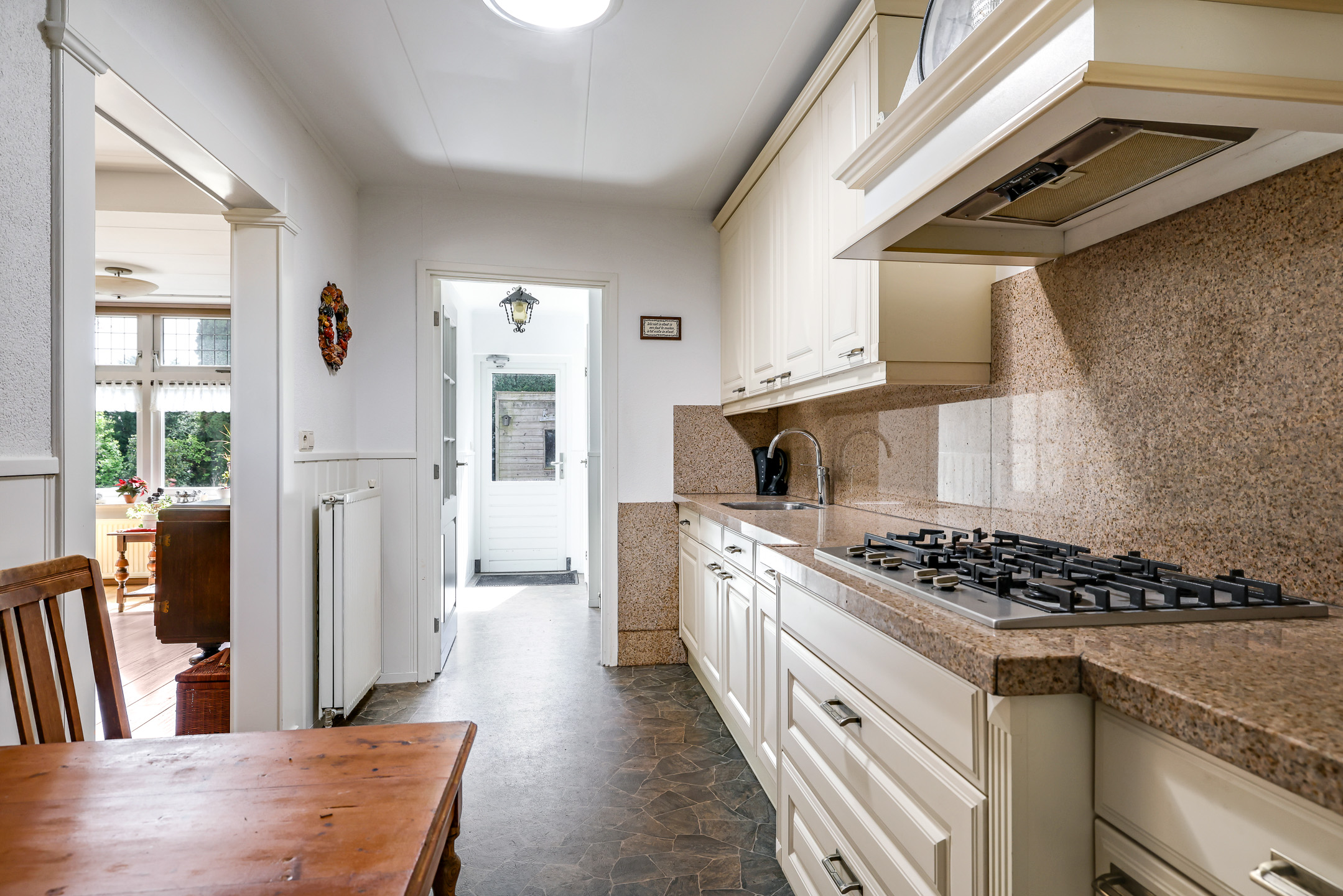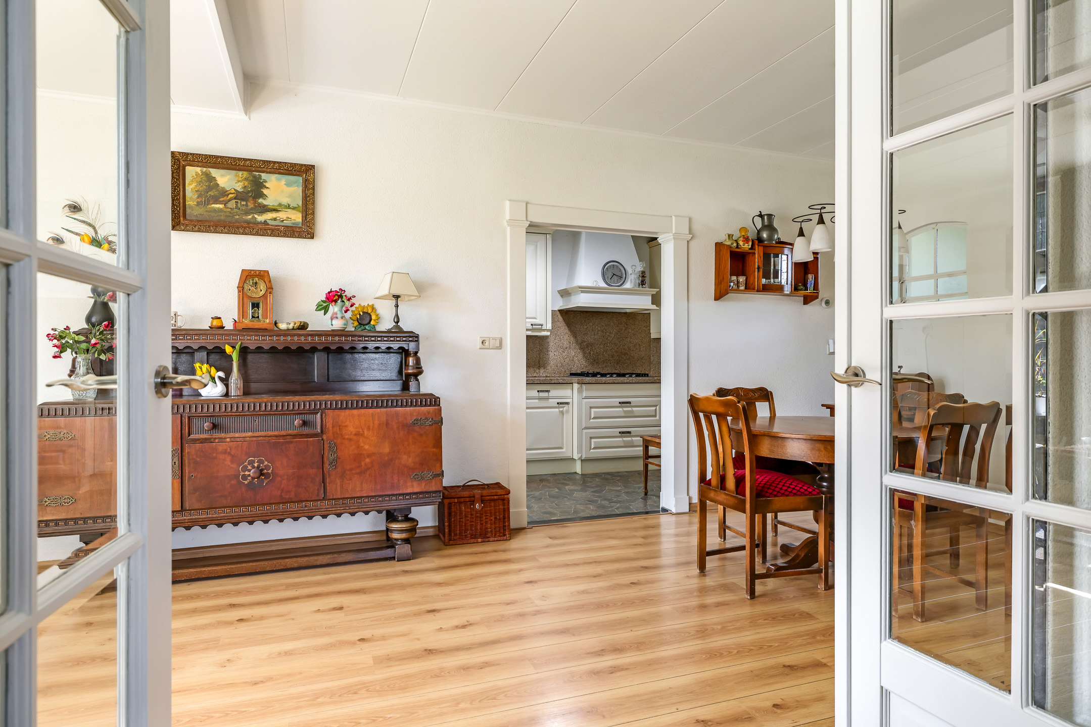 De woonkamer heeft en-suite deuren naar de voorkamer/TV-kamer waardoor je die kunt afsluiten en verschillende zithoeken kunt creëren. De keuken betreft een landelijke keukenopstelling met granieten werkblad en diverse inbouwapparatuur zoals een vaatwasser, een 5-pits gaskookplaat met afzuigschouw, een koelkast en een combi/oven magnetron. De aparte kamer die aan de woonkamer grenst zou een ideale werk/studiekamer kunnen zijn, maar zou ook als slaapkamer op de begane grond ingericht kunnen worden. Naast de keuken is een 2e hal te vinden met toilet en tuindeur. Hier zou je eventueel ook een (2e) badkamer of douchegelegenheid kunnen creëren zodat de woning (indien gewenst) levensloopbestendig te bewonen is.