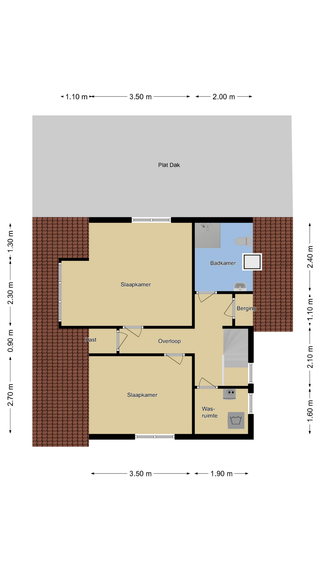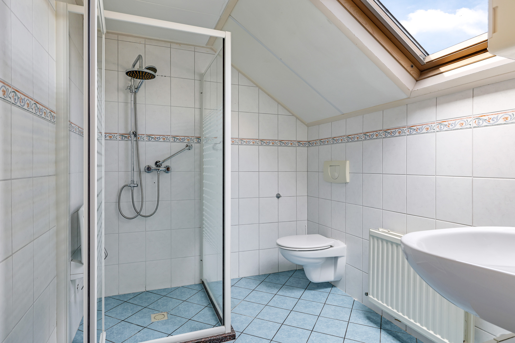 Op de verdieping schakelt de overloop 2 slaapkamers, de badkamer en de wasruimte aan elkaar. De hoofdslaapkamer is met 15m2 lekker ruim en heeft een bijzondere beleving door de dakkapel en de 3,5 meter hoge nok. De 2e slaapkamer betreft met meer dan 9m2 ook een volwaardige slaapkamer. De badkamer is degelijk en verzorgd afgewerkt met douchecel, wastafel en 2e (zwevend) toilet. Een dakvenster zorgt voor daglicht en de ideale ventilatiemogelijkheid. Verder is het erg prettig dat je de wasmachine in een aparte ruimte kunt plaatsen.