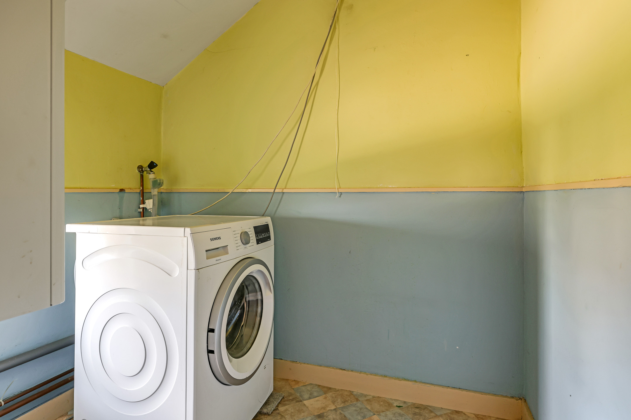 Wasruimte met wasmachine-aansluiting en CV-ketelopstelling.