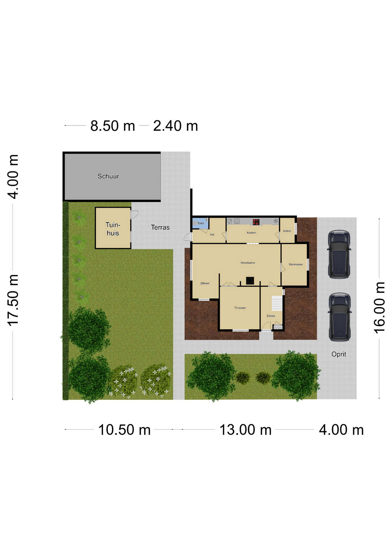 Aan de rechterzijde van de woning ligt een diepe oprit van 16 (!) meter lang en ca. 4 meter breed. Hier kun je met gemak 3 auto’s op eigen terrein parkeren. Indien gewenst zou je de oprit aan de voorzijde zelfs nog iets kunnen verbreden zodat je 2 auto’s naast elkaar kunt parkeren en elkaar niet in de weg hoeft te staan. Deze oprit is ook ideaal voor wanneer je een camper of caravan (tijdelijk) bij huis wil stallen.