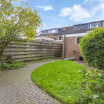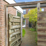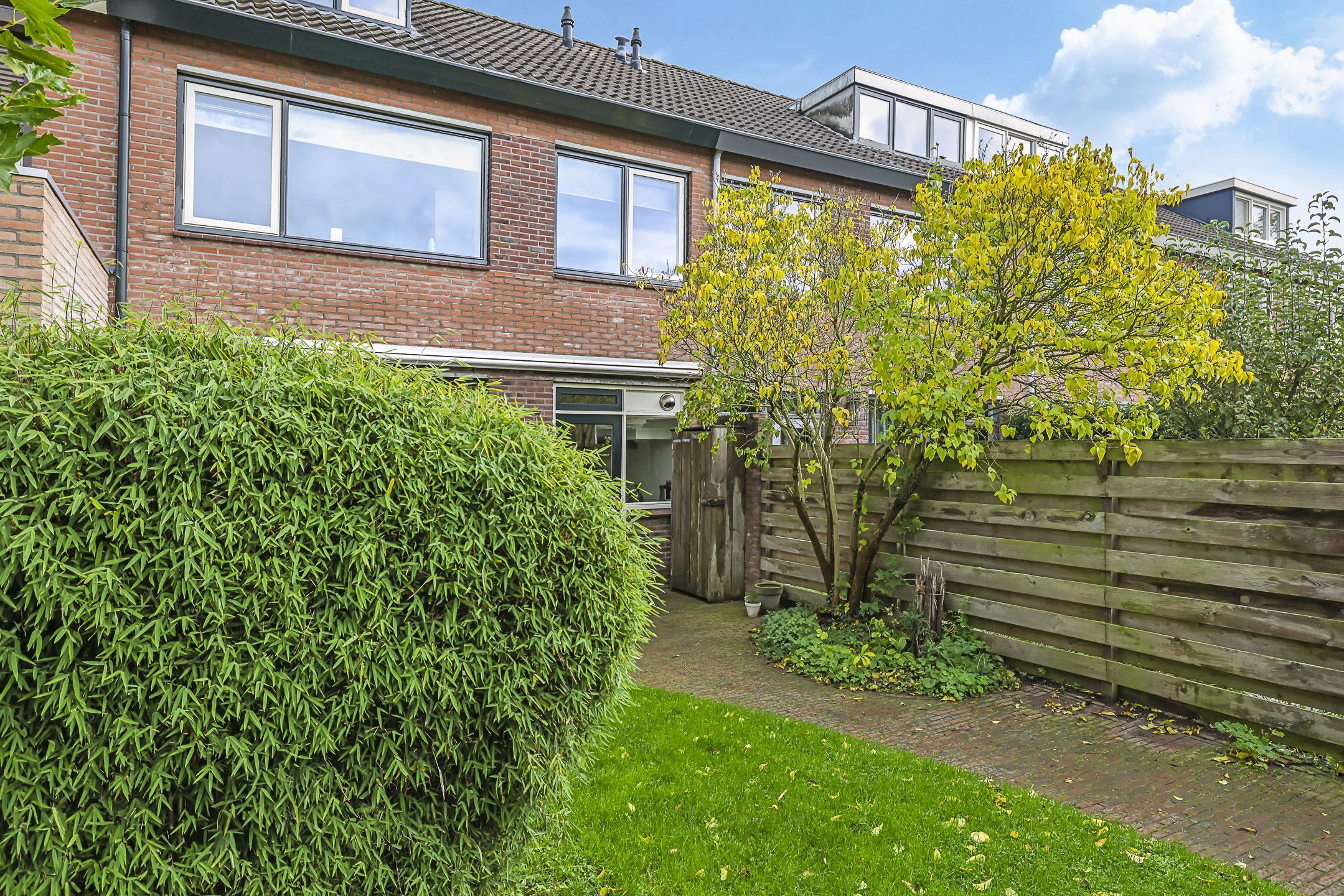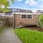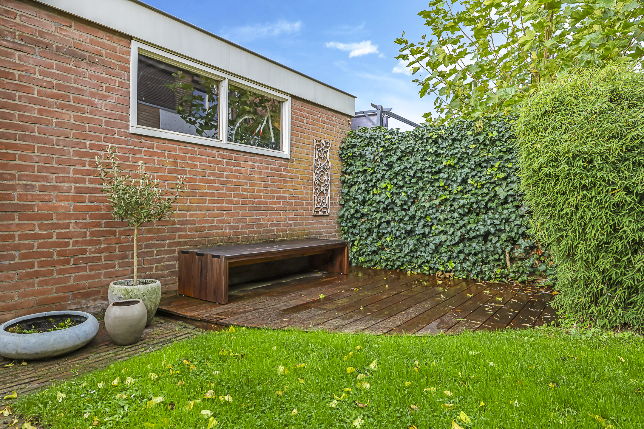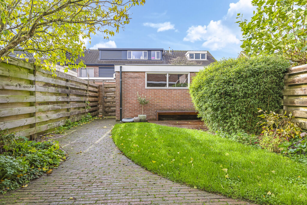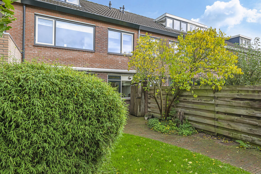 De achtertuin is verzorgd aangelegd. Dankzij de ligging vol op het westen geniet je hier volop van de middag en avondzon. Om op de warme zomerdag de zon te kunnen weren is er zonwering aan de achtergevel geplaatst. De combinatie van gebakken klinkers, gras en vlonders zorgen voor een speelse, groene tuin met meerdere zithoeken. Achter in de tuin staat een stenen berging welke is voorzien van daglicht en elektra. Naast de nodige bergruimte heb je hier ook nog ruimte voor bijvoorbeeld een werkbank waaraan je kan klussen.