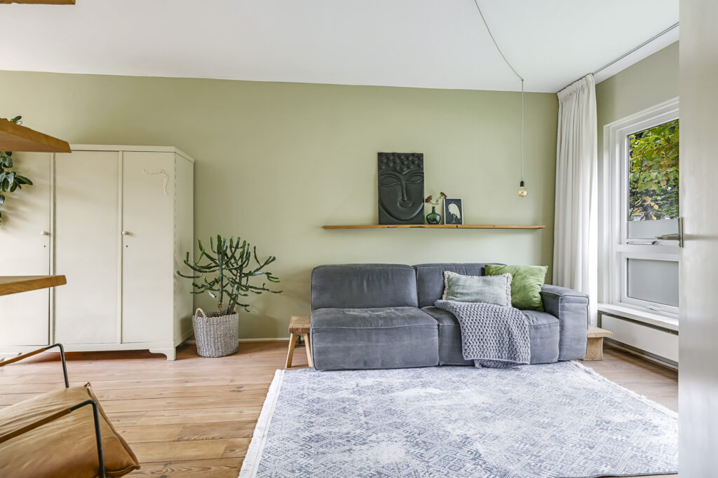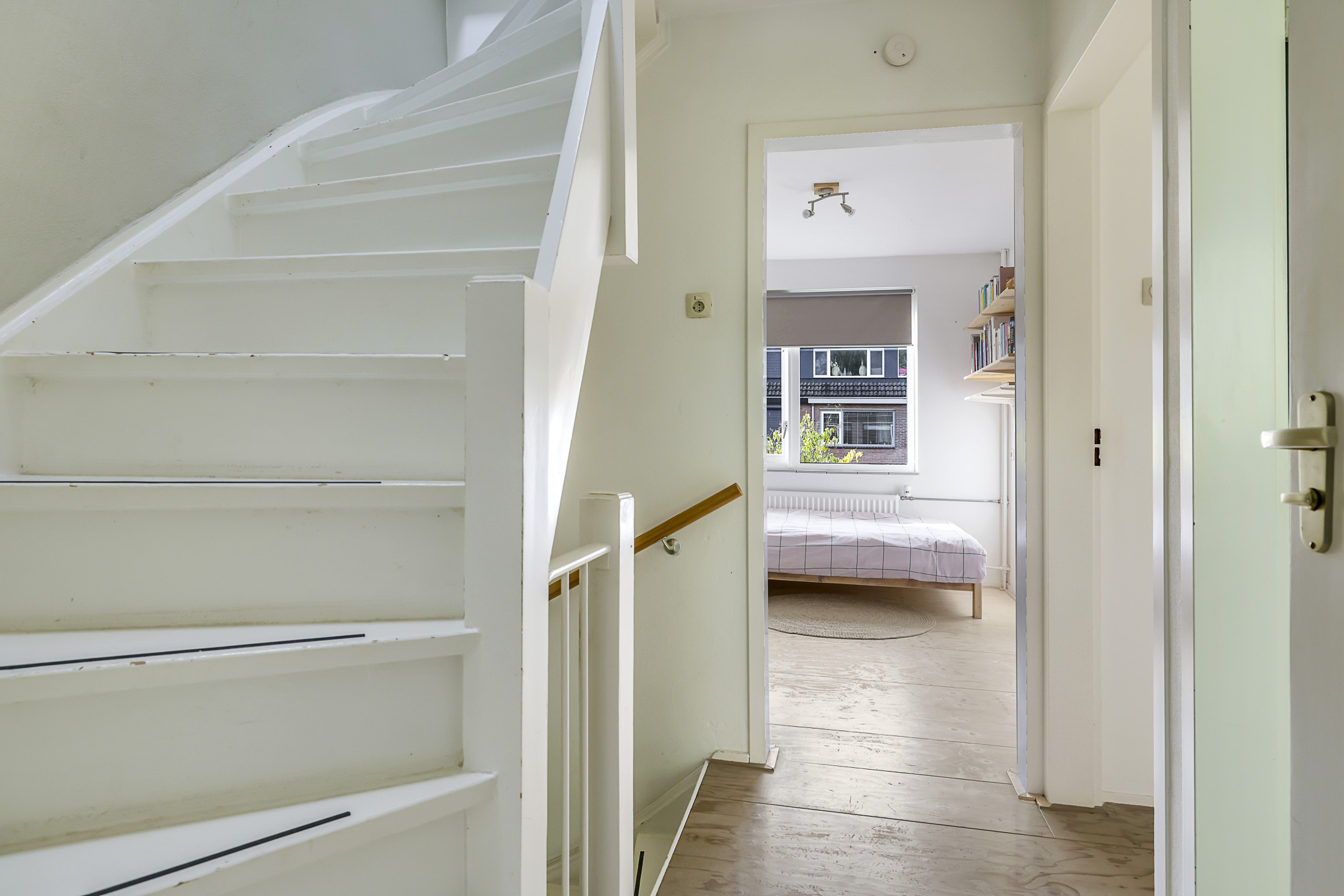 De woonkamer voelt direct aangenaam door de hoeveelheid licht die binnenvalt via de grote raampartijen aan zowel de voor- als achterzijde. Dankzij de open verbinding met de keuken heeft de begane grond een ruimtelijke en eigentijdse uitstraling. De massief grenen vloer zorgt voor warmte en karakter, terwijl de rechthoekige indeling uitnodigt tot een logische opstelling van zithoek en eethoek. Vanuit de woonkamer is er een prettig zicht op de achtertuin. De wanden en het plafond zijn gestuct wat zorgt voor een strakke uitstraling. De houten wandschappen blijven achter. De hal bevindt zich centraal in de woning en biedt toegang tot de meterkast, het toilet en de trapopgang naar de verdieping.