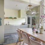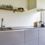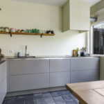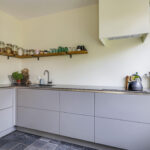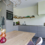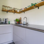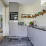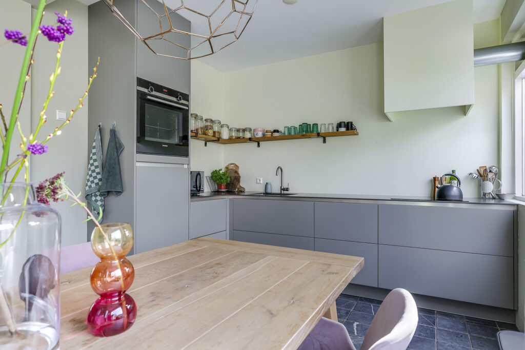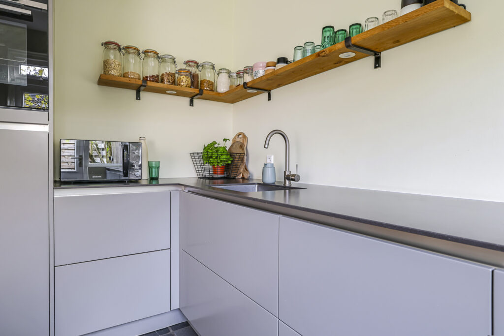 De keuken is aan de achterzijde gelegen en vormt één geheel met de woonkamer doordat de tussenmuur is opengebroken. De moderne hoekopstelling is uitgevoerd met dunne composiet werkbladen, greeploze fronten en strakke lijnen. Qua apparatuur is de keuken voorzien van een vaatwasser, een 4-pits inductiekookplaat, een grote oven, een koel-vriescombinatie en een afzuigkap. Brede ladekorven met verdekte besteklades zorgen voor veel opbergruimte. De afwerking is luxe maar neutraal, waardoor het goed combineert met uiteenlopende woonstijlen. Een deur geeft directe toegang tot de achtertuin.