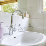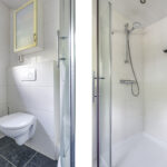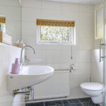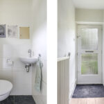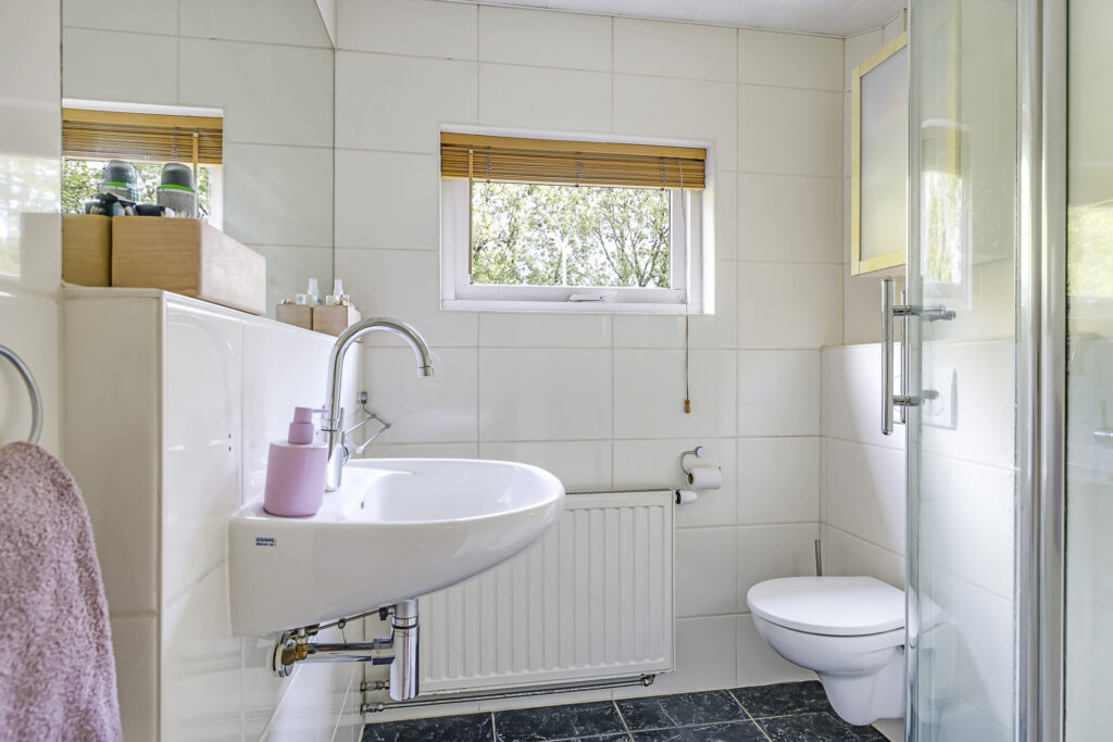 De badkamer is eenvoudig maar netjes uitgevoerd in een neutrale kleurstelling. De indeling bestaat uit een douchecabine, een zwevend toilet en wastafel met grote spiegel. Grote tegels zorgen voor een rustige uitstraling. Een raam zorgt voor daglicht en ventilatiemogelijkheid.