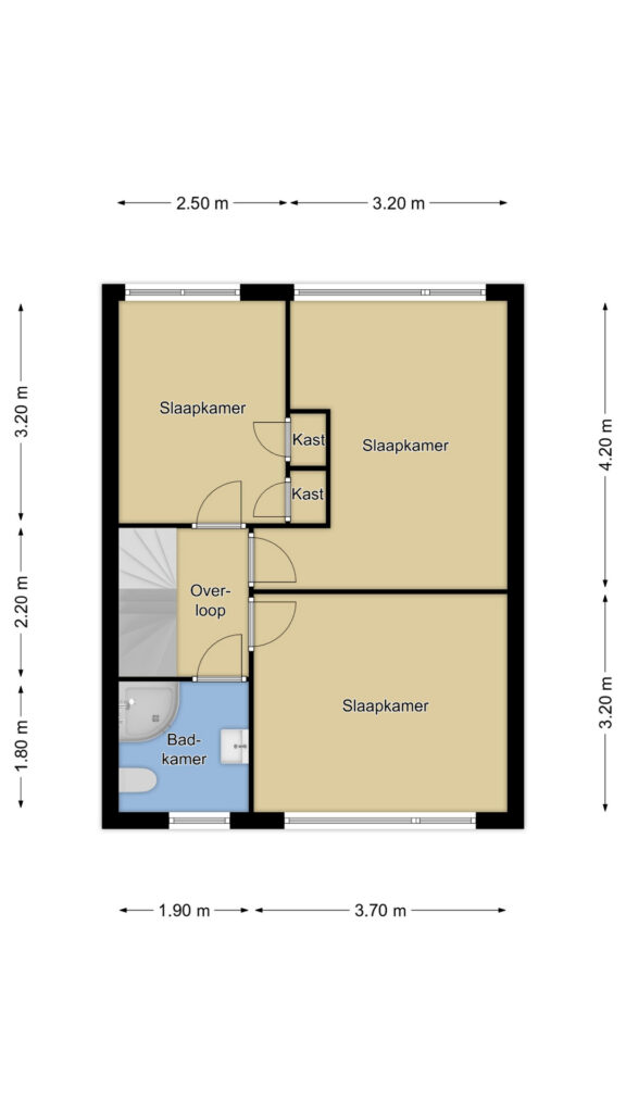 De eerste verdieping telt drie slaapkamers en een badkamer. De kamers zijn allemaal goed bemeten en respectievelijk 14m², 12m² en 8m² groot. De kleinste kamer heeft daarbij nog 2 vaste inbouwkasten voor praktische bergruimte. Opvallend grote ramen zorgen voor veel lichtinval. De vloeren zijn neutraal afgewerkt en de wanden gestuct, wat het geheel fris en verzorgd doet aanvoelen. Rolhorren houden de ongewenste insecten buiten.