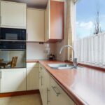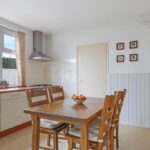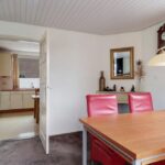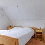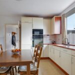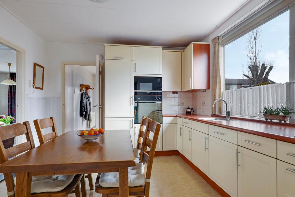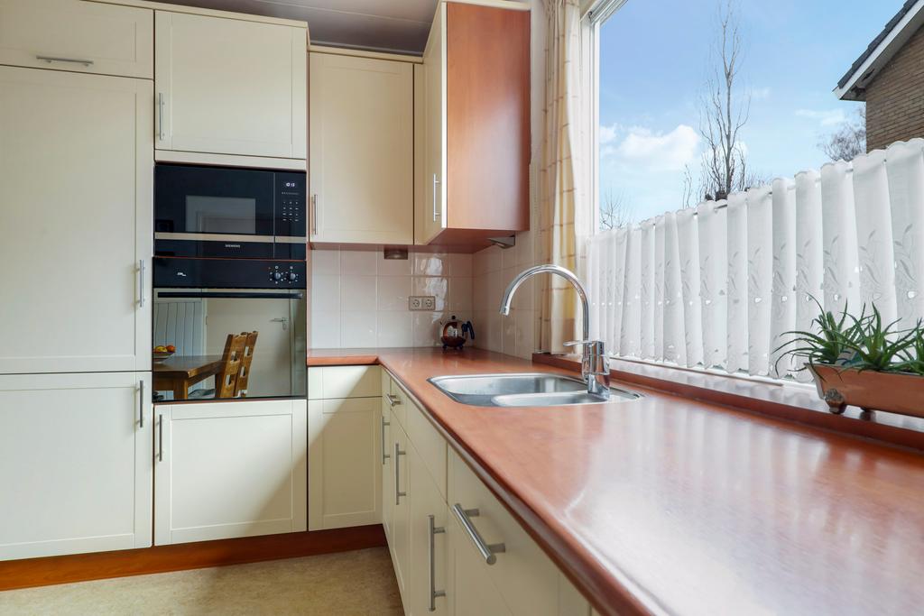 De keuken is eveneens ruim van opzet en is voorzien van een hoekopstelling. Je zou er eventueel nog een ontbijttafel bij kunnen plaatsen. De inbouwapparatuur bestaat uit een vaatwasser, een 4-pits gaskookplaat, een afzuigschouw, een koel/vriescombi, een oven en een magnetron. Een complete keuken zouden we kunnen zeggen. Er is voldoende kastruimte aanwezig. Overigens kun je de voorraad beneden in de kelder kwijt.