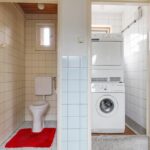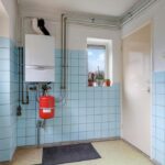 Bijkeuken met CV-ketelopstelling, toilet, wasruimte en deur naar oprit.