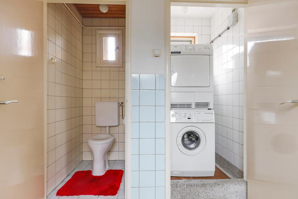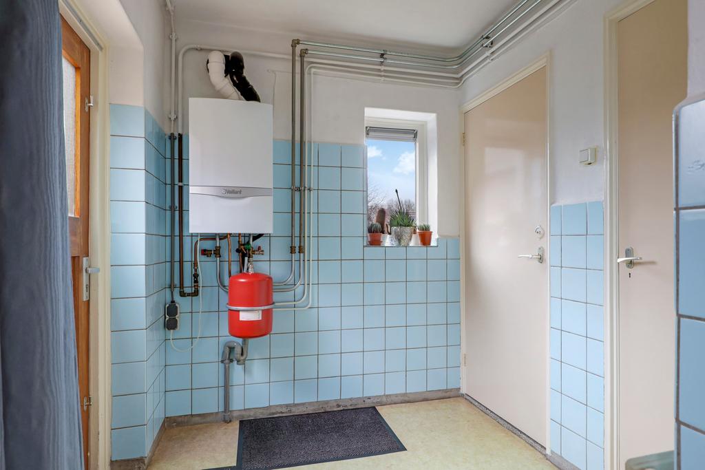 Vanuit de keuken loop je eveneens naar de bijkeuken aan de achterzijde. Dit is een praktische ruimte voor wanneer je vanuit de tuin komt. Veel mensen zullen via deze deur, ‘de achterom’ naar binnen komen aangezien het aansluit op de oprit. Deze 2e hal geeft toegang tot het toilet en een inbouwkast met de witgoedaansluitingen (voormalige badkamer). Ook is hier de CV-ketel geïnstalleerd.