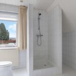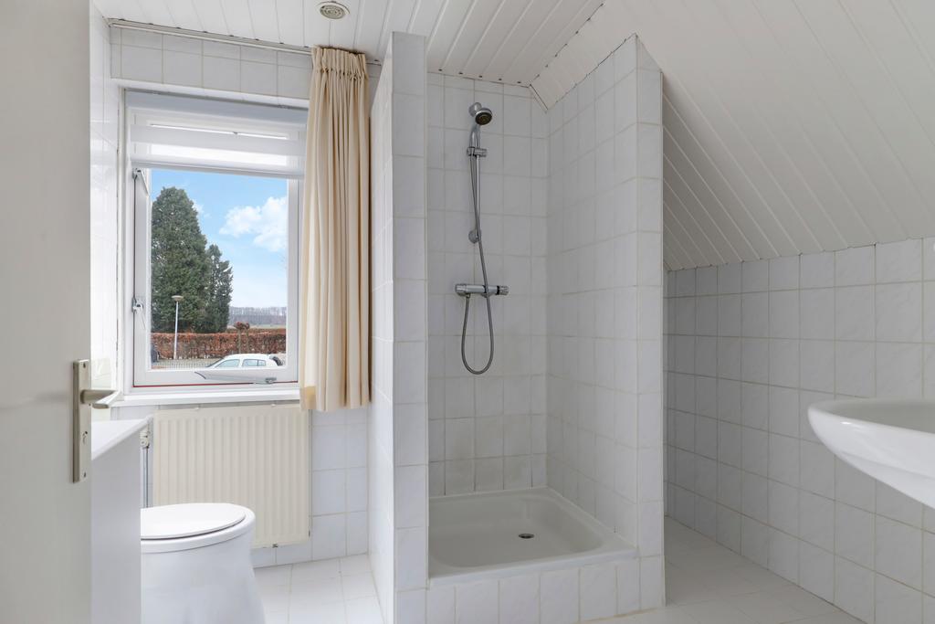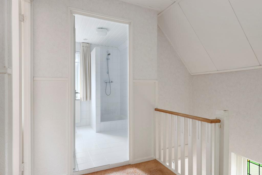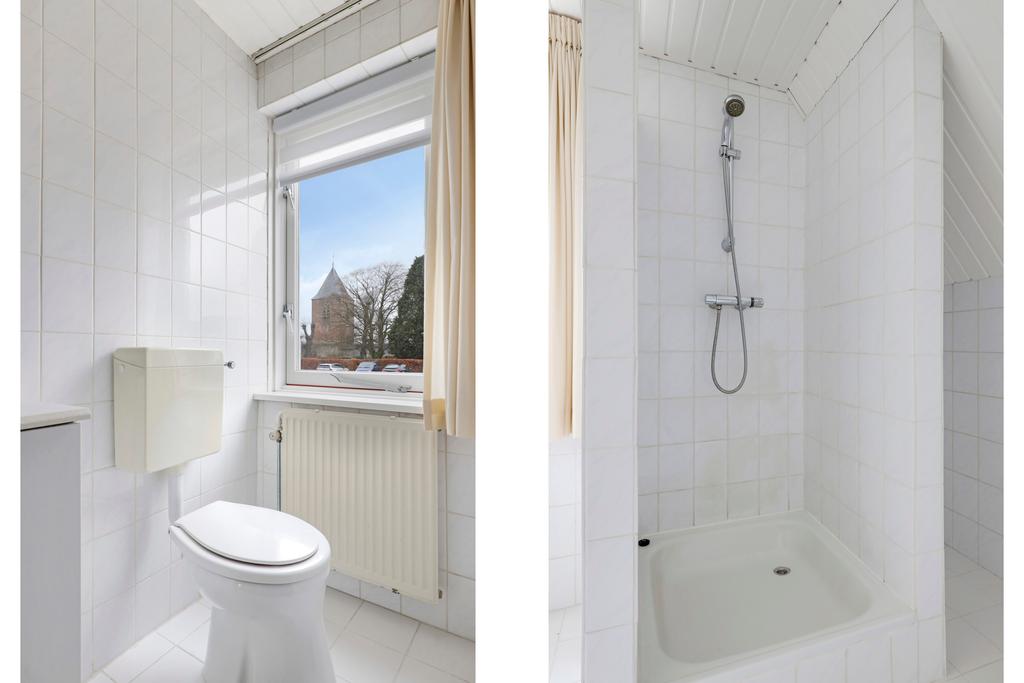 Oorspronkelijk had de woning maar een zeer kleine badkamer (in de bijkeuken), maar na verloop van tijd is één van de slaapkamers op de verdieping opgeofferd voor een volwaardige badkamer. Deze is ingedeeld met een douche, een wastafel en een 2e toilet. Wanneer je de badkamer opnieuw zou indelen, zou er ruimte kunnen zijn voor een extra ligbad. Het tegelwerk is tijdloos en neutraal te noemen. Erg prettig is het aanwezige raam waardoor er een prettige lichtinval is. Ook is hierdoor de badkamer goed te ventileren.