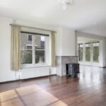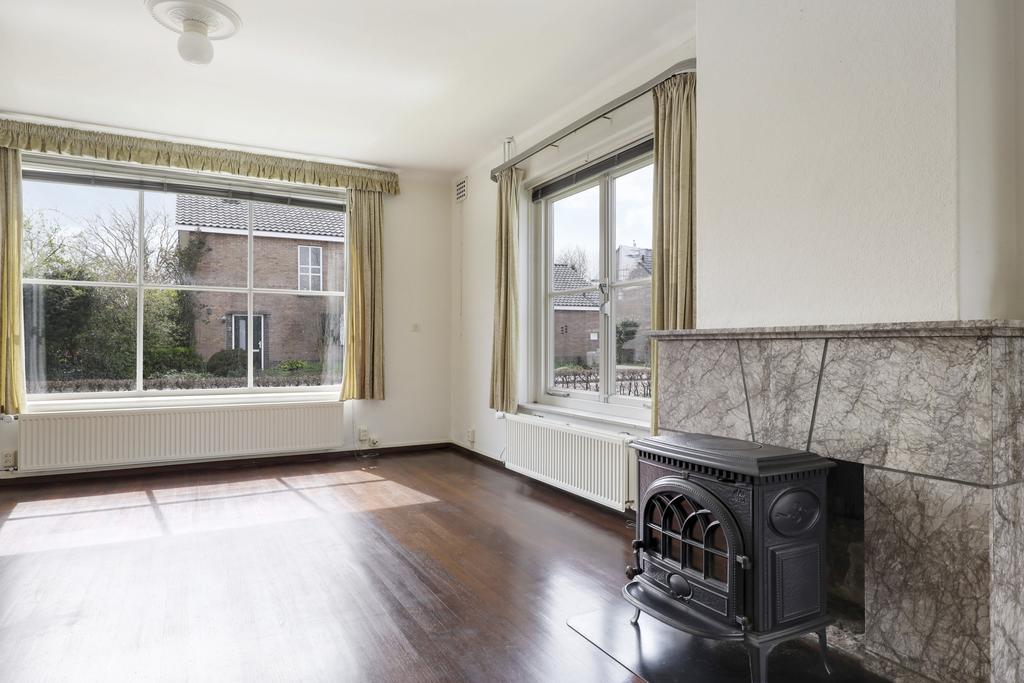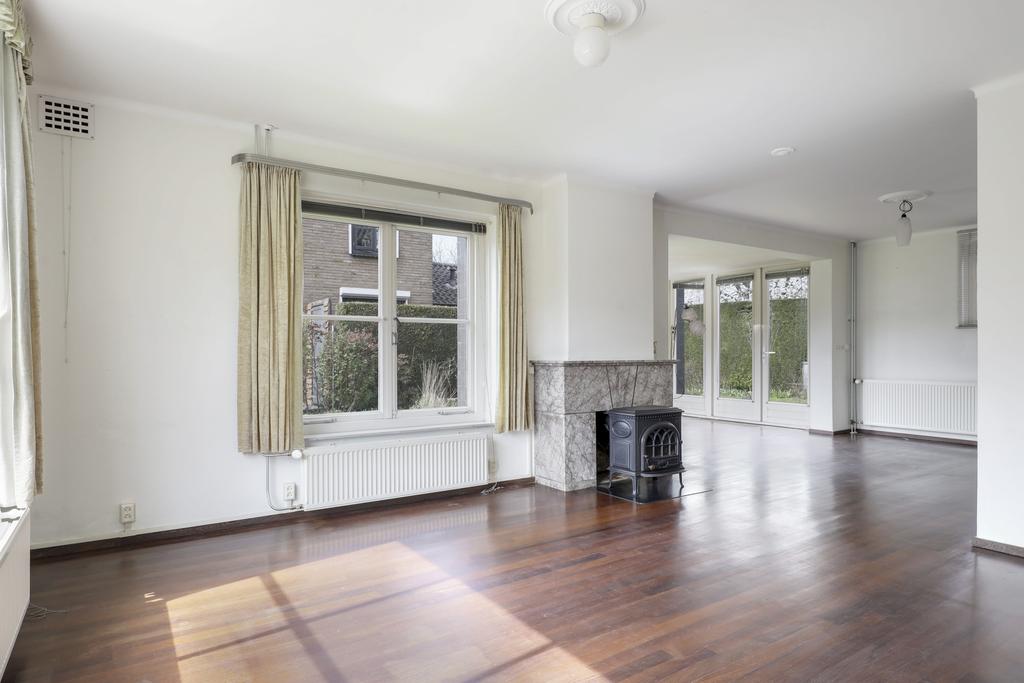 De woonkamer voelt lekker ruim aan door de grote raampartijen en de zij-aanbouw die de leefruimte aanzienlijk vergroot. In totaal telt de woonkamer ca. 43 (!) vierkante meters en kun je verschillende zithoeken creëren. Centraal in de woonkamer is een met natuursteen beklede schouw met rookkanaal te vinden waarbij de vrijstaande houtkachel ter overname wordt aangeboden. Op de vloer ligt een mooie parketvloer die voor een warme woonsfeer zorgt. Opvallend is dat de ramen weer opnieuw zijn voorzien van een roedeverdeling waardoor het authentieke karakter weer terug komt. De zij-aanbouw heeft daarentegen weer een moderne uitstraling met dubbele tuindeuren naar het buitenterras.