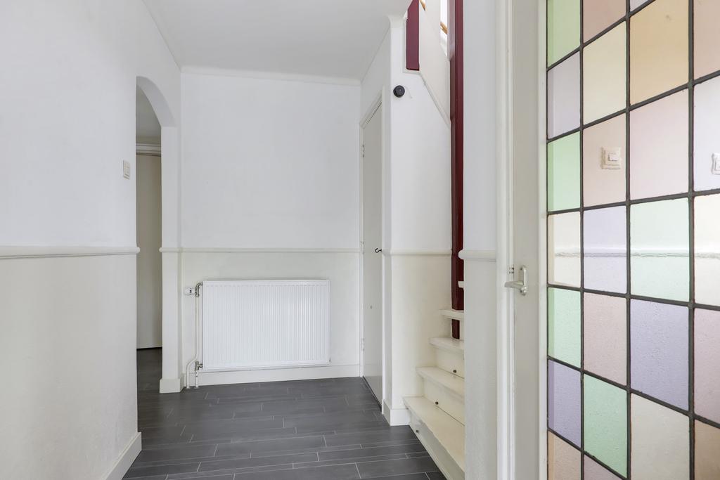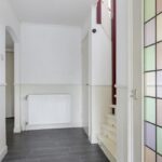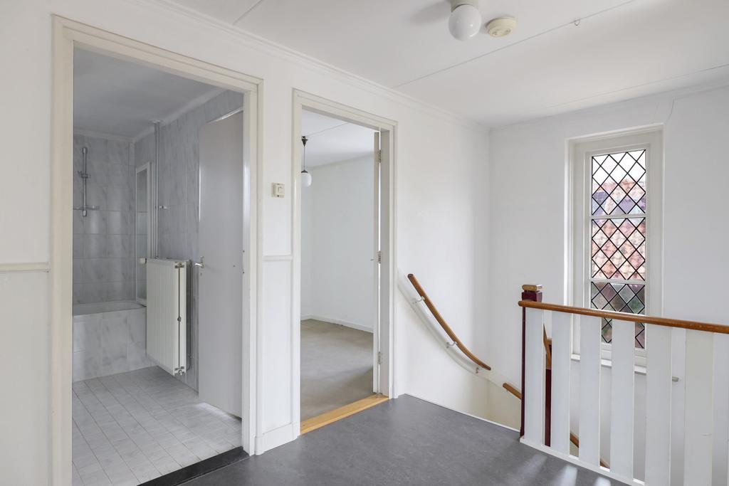 De ruime opzet van de begane grond zien we ook terug op de 1e verdieping (met betonvloer). De woning is immers 7,3 meter breed (inpandig) wat je met name terug ziet op de grootste slaapkamer. Deze ouderslaapkamer is maar liefst 17m2 groot waardoor je er met gemak een groot 2-persoons bed en een linnenkast kwijt kunt. Overigens heeft deze kamer al wel 2 inbouwkasten. De overige 3 slaapkamers zijn respectievelijk 12m2, 11m2 en 6m2 groot waarbij 2 van de 3 kamers eveneens een eigen inbouwkast heeft. Opvallend is dat 3 van de 4 slaapkamers ook nog een eigen wastafel heeft. Dit kan erg handig zijn bij een gezin met tieners. Op de overloop zorgt een authentiek glas-in-lood raam voor een prettige lichtinval.