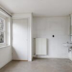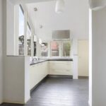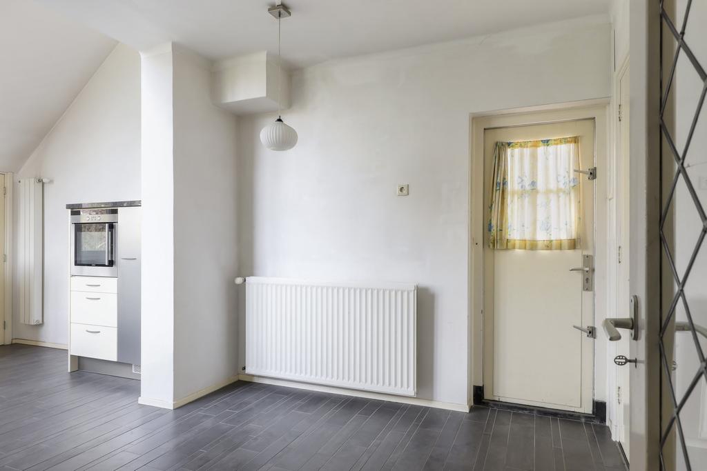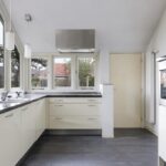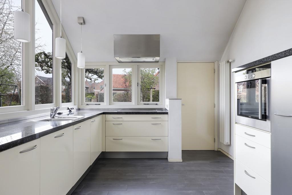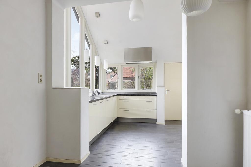 De keuken heeft een geheel eigen karakter en is door de aanbouw aan de achterzijde eveneens vergroot. Het betreft niet zomaar een aanbouw aangezien het schuine dak, met een nokhoogte van meer dan 4 meter hoog, voor een zeer ruimtelijke en speelse beleving zorgt. De brede glaspui met hoekraam zorgt voor enorm veel lichtinval wat het ruimtelijke gevoel versterkt. Bovendien geeft dit brede hoekraam een panoramisch gezichtsveld in de achtertuin.