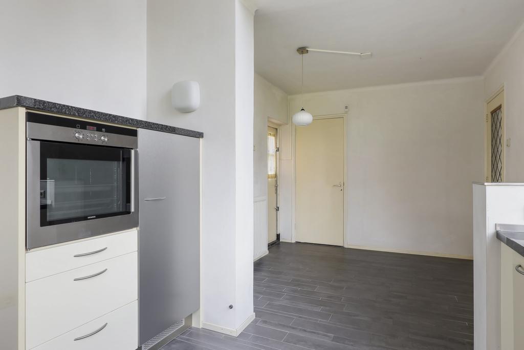 De keuken is in een hoekopstelling geplaatst en is v.v. diverse inbouwapparatuur waaronder een vaatwasser, een brede inductie kookplaat, een afzuiger, een koelkast en een grote oven. De apparatuur is van het merk Siemens en Atag. Het granieten werkblad, dat dieper is dan normaal, geeft de keuken een luxe-uitstraling. De vloer is (deels) voorzien van vloerverwarming. Erg praktisch is de deur naar de oprit waardoor je de boodschappen rechtstreeks naar de keuken (en de kelder) kunt brengen. Ook is er een doorloop naar de achtergelegen hobbyruimte.