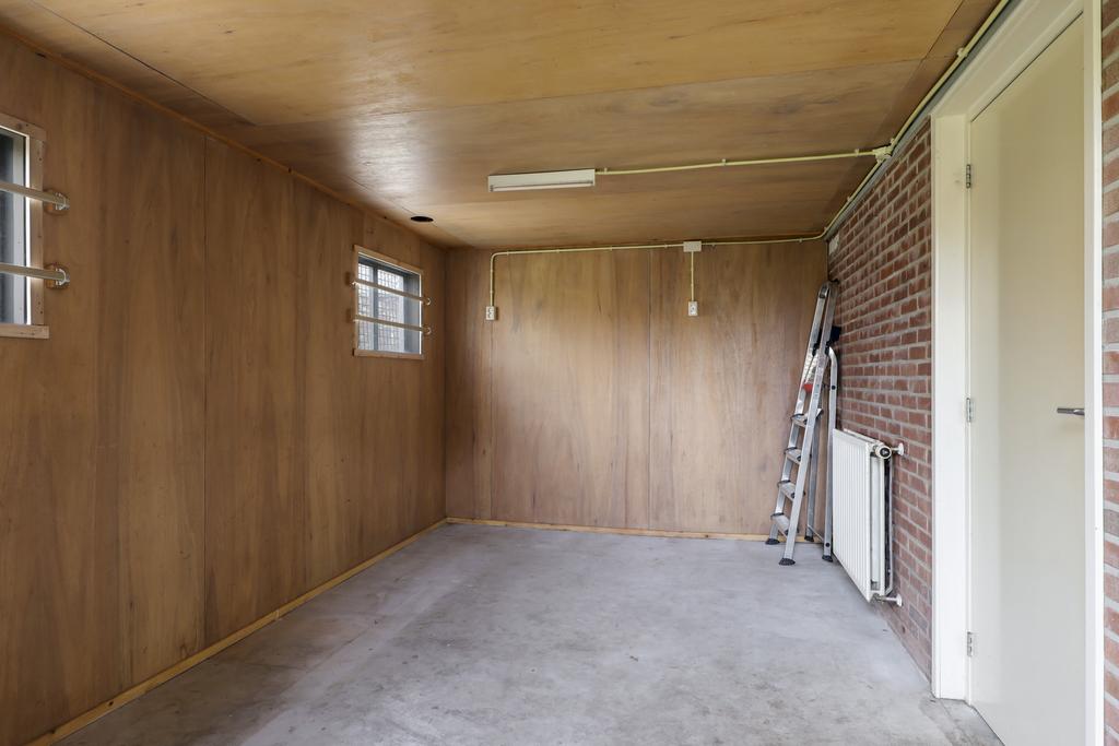 Grenzend aan de keuken (aan de achterzijde) loop je een andere, verrassende ruimte binnen. Wij hebben het een hobbyruimte genoemd (ca. 13m2 groot) omdat je het verschillende bestemmingen kunt geven, maar je zou het ook een bijkeuken kunnen noemen. Doordat er ramen aanwezig zijn, de ruimte is verwarmd en is geïsoleerd, zou je er met een beetje creativiteit een speelkamer van kunnen maken. Een handige klusser zal er maar al te graag een werkbank willen plaatsen. Vanuit deze hobbyruimte is er een doorloop naar de ‘inpandige’ garage met zolder.