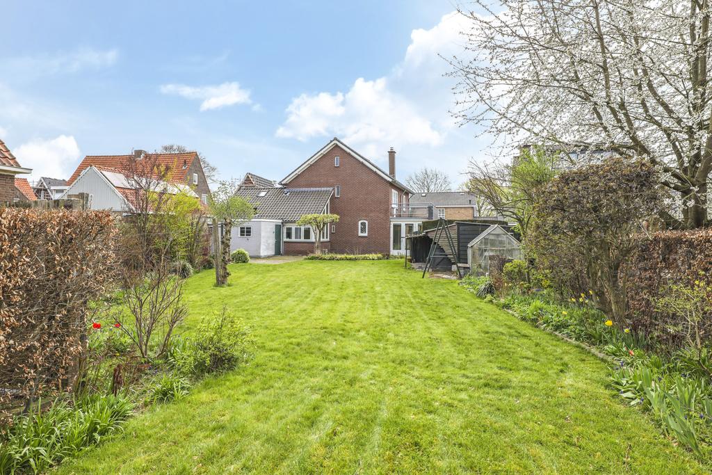 De achtertuin is verzorgd en overzichtelijk aangelegd met een groot terras en een grasgazon. Er staat een houten schuur (ca. 5m2) waar je bijvoorbeeld tuingereedschap kunt opbergen. Ook kachelhout zou je hier kunnen opslaan. Achter de schuur staat nog een (verouderde) hobbykas waar je wellicht nog nieuw leven in kunt blazen. Doordat de achtergelegen woning ook zo’n diepe achtertuin heeft, geniet je veel vrijheid in de tuin. Je kijkt zeker niet zomaar even bij de achterburen naar binnen. De tuin heeft daarentegen een open karakter wat ook voor veel lucht zorgt. En doordat de achtertuin zo groot is, kun je er de gehele dag in de zon zitten.