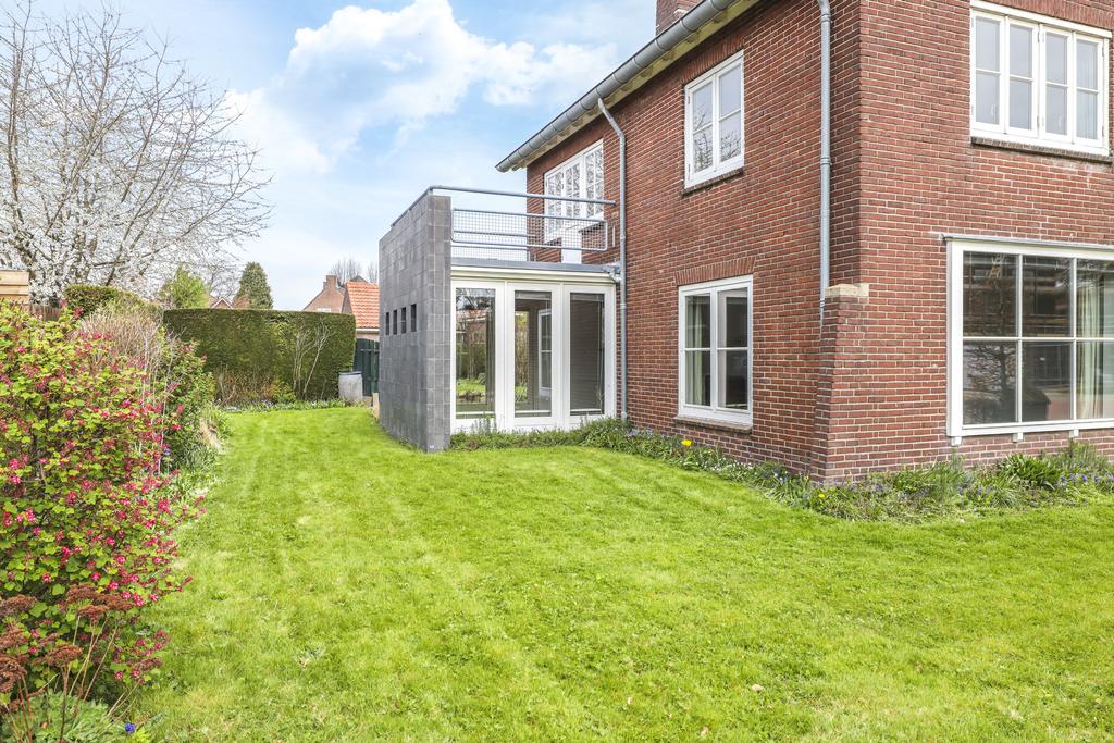 Noemenswaardig is de brede poort aan de zijkant van het perceel. Je kunt vanaf de voortuin aan de linkerzijde van het perceel in de achtertuin komen, maar (indien gewenst) is de achtertuin ook via de naastgelegen oprit te bereiken (via een erfdienstbaarheid, recht van uitweg/overpad).
