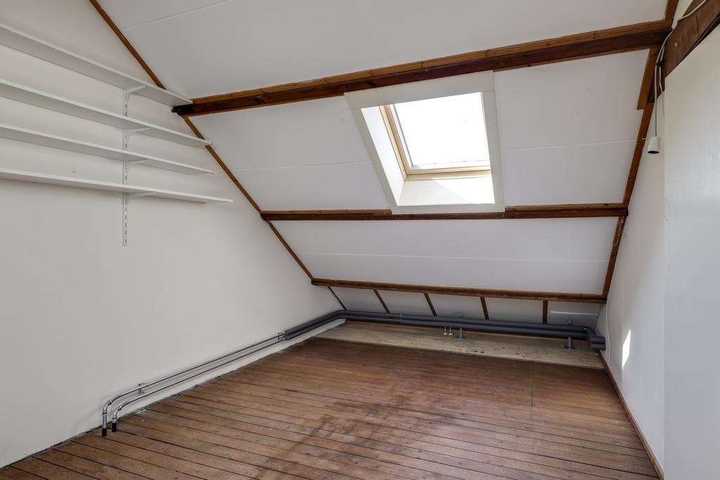 In de huidige situatie is de 2e verdieping te bereiken middels een vlizotrap. Hier zou meer uit te halen zijn, bijvoorbeeld door het plaatsen van een vaste trap, aangezien de 2e verdieping een volwaardige woonlaag betreft. Met een nokhoogte van 2,7 meter kun je er goed staan en is er in totaal meer dan 30m2 aan leefruimte te vinden (gemeten vanaf 1,5m hoogte). Je zou er zelfs één of twee extra (slaap)kamers kunnen creëren. De kamer die er al aanwezig is, heeft 2 relatief jonge Velux dakvensters waardoor het meer dan voldoende lichtinval heeft. Doordat de ramen tegenover elkaar zijn geplaatst, zou je het er op een warme zomerdag ook lekker door kunnen laten waaien. Overigens is de dakconstructie geïsoleerd en afgewerkt.