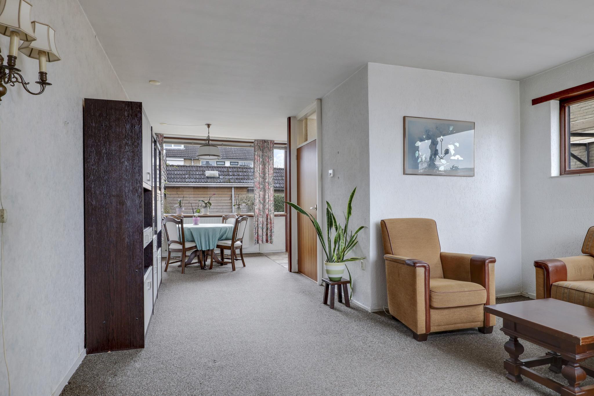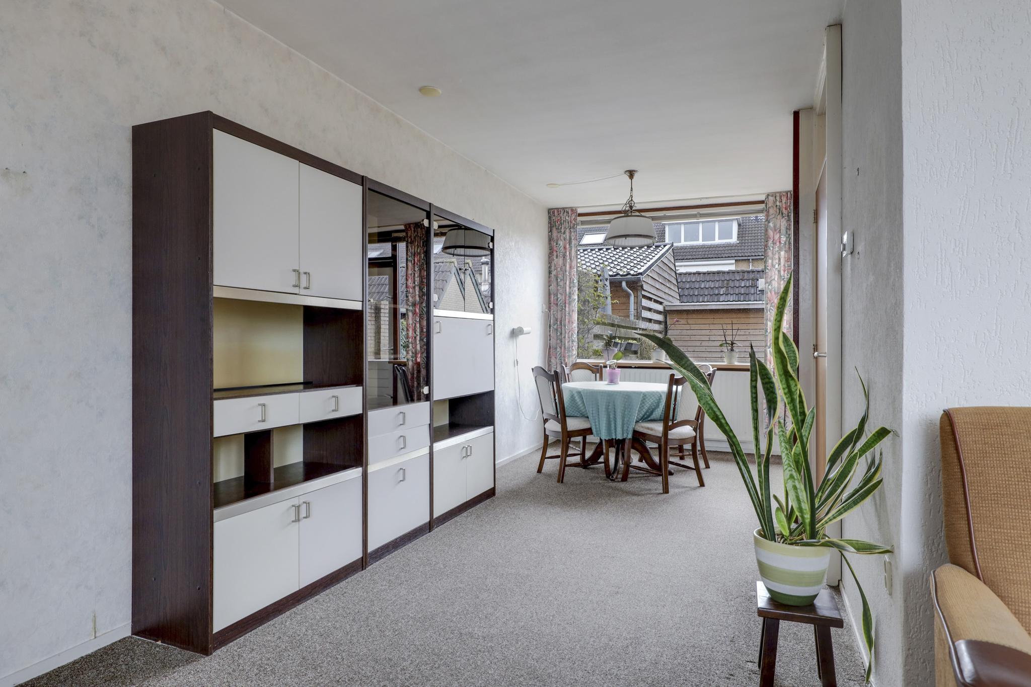 De woonkamer is aan de voorzijde gelegen en heeft een L-vormige indeling. De grote raampartijen aan weerszijde van de maken dit een ware doorzonkamer. Door de hoekligging heb je tevens een extra zijgevelraam. De ruimte is speels ingericht doordat er een entree én een hal aanwezig is. Aan de voorzijde tref je een tochtportaal met de meterkast. In het midden van de woning is de 2e hal gelegen met de trapopgang en het toilet. De woonkamer heeft een prettig formaat waardoor je hier met gemak een grote hoekbank en een 6-persoons eettafel kwijt kunt.