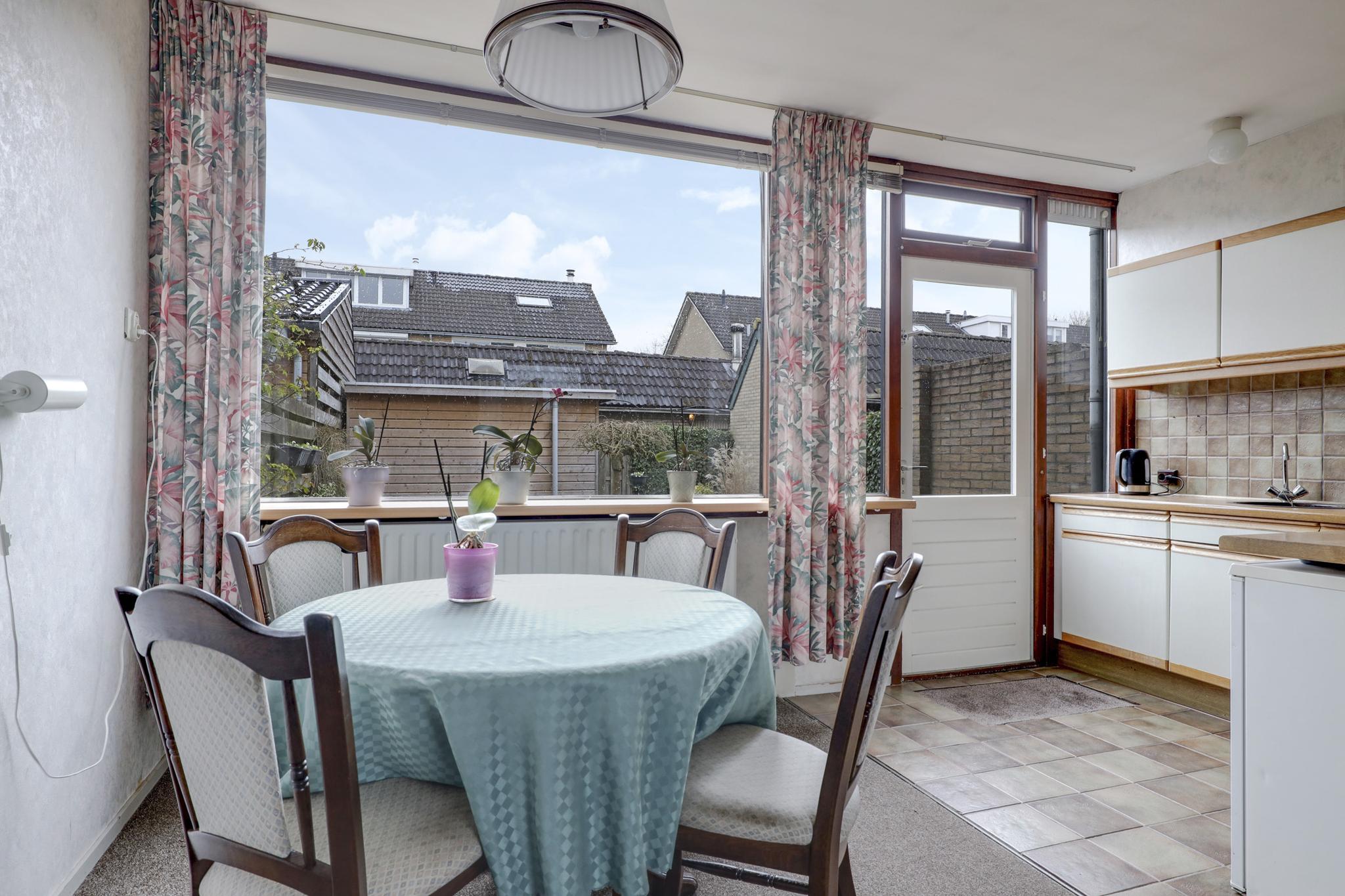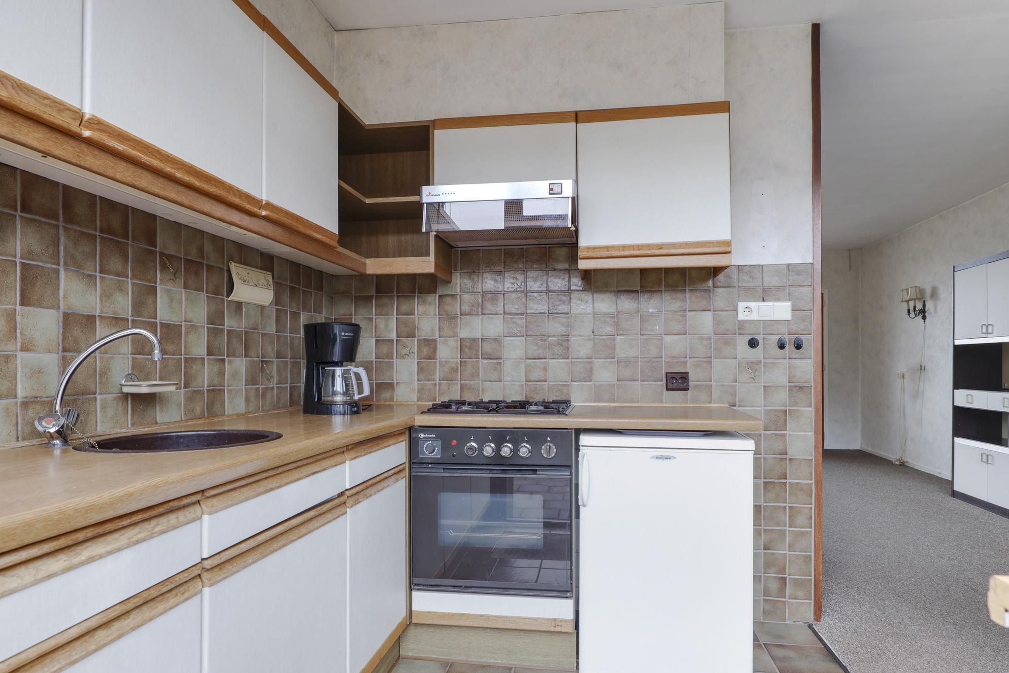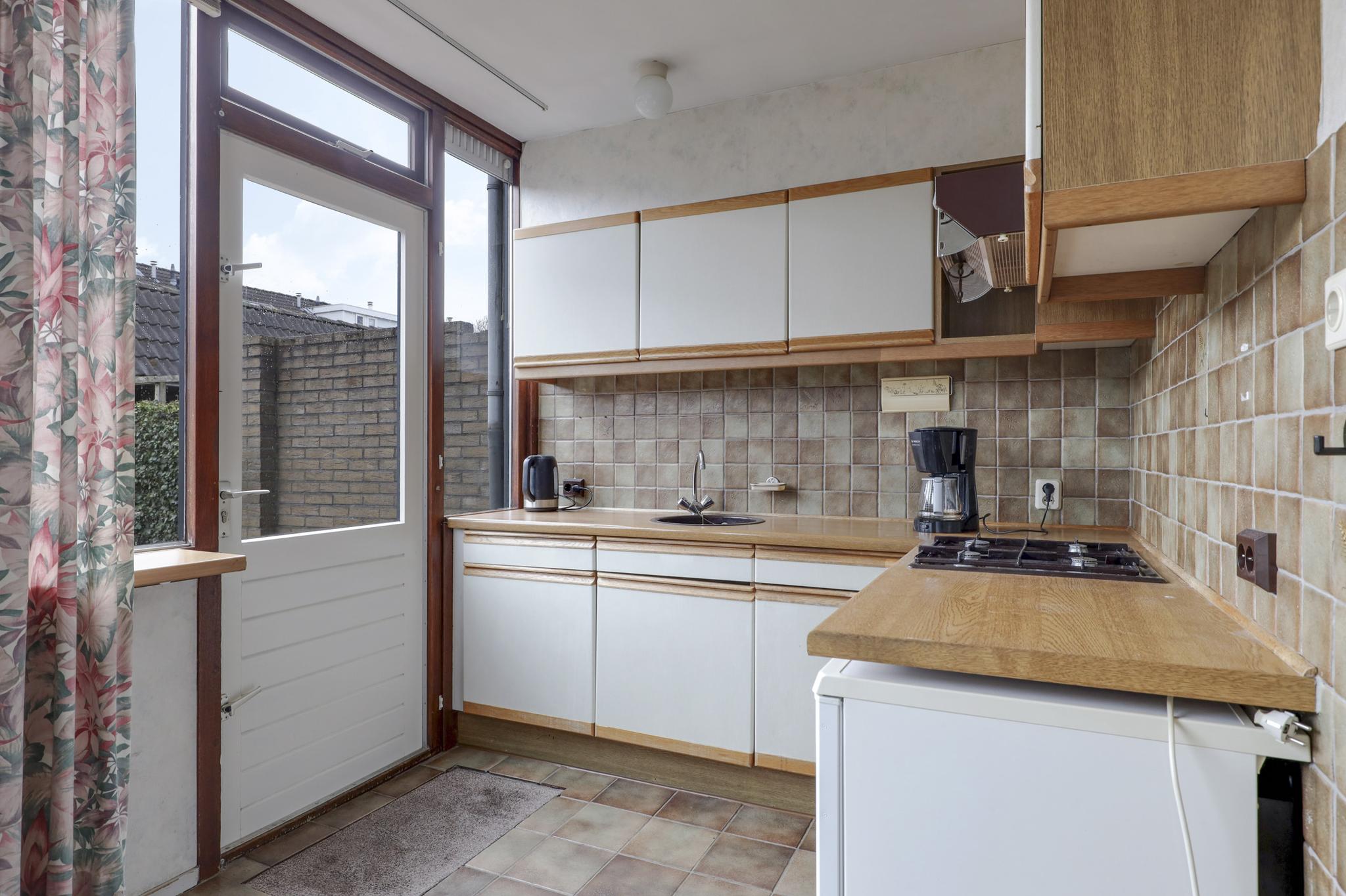 De keuken is aan de achterzijde van de woning gelegen en is wat gedateerd. Vanuit de keuken is de tuin bereikbaar, ook hier is veel lichtinval aanwezig. Het keukenblok is in een hoekopstelling geplaatst en is eenvoudig te noemen. Diverse onder en bovenkastjes bieden veel opbergruimte. De inbouwapparatuur bestaat uit een 4-pits gaskookplaat en een oven. De ‘losse’ koelkast blijft achter bij de woning.