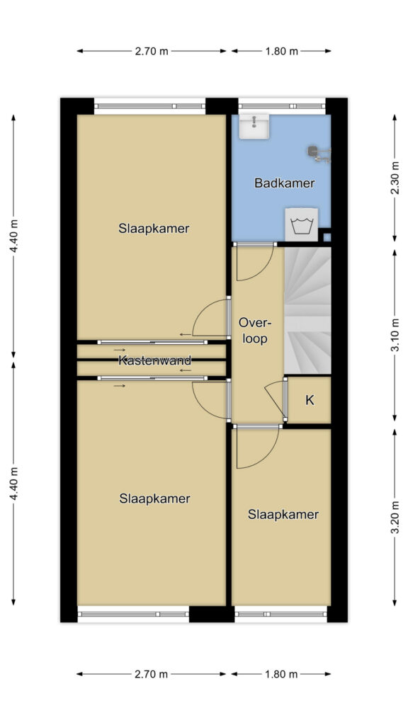 Via de hal in het midden van de woning bereik je de 1e verdieping. Hier schakelt de overloop de 3 slaapkamers en de badkamer aan elkaar. Erg praktisch is de vaste kast op de overloop welke extra opbergruimte biedt. De kamers zijn allen voorzien van grote raampartijen waardoor ze ruimtes licht aanvoelen. De 2 grootste kamers zijn ca. 12m2 groot en de 3e kamer is ca. 6m groot. De grootste 2 kamers hebben beide een brede kastenwand.
