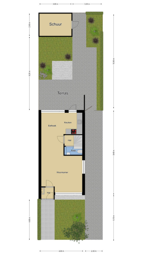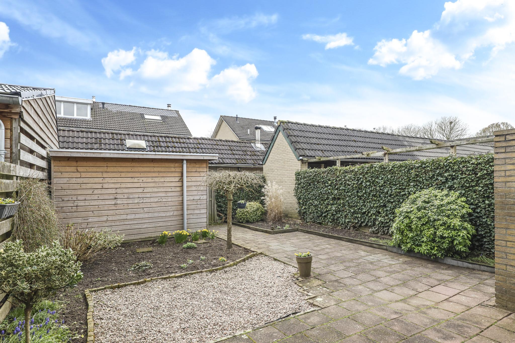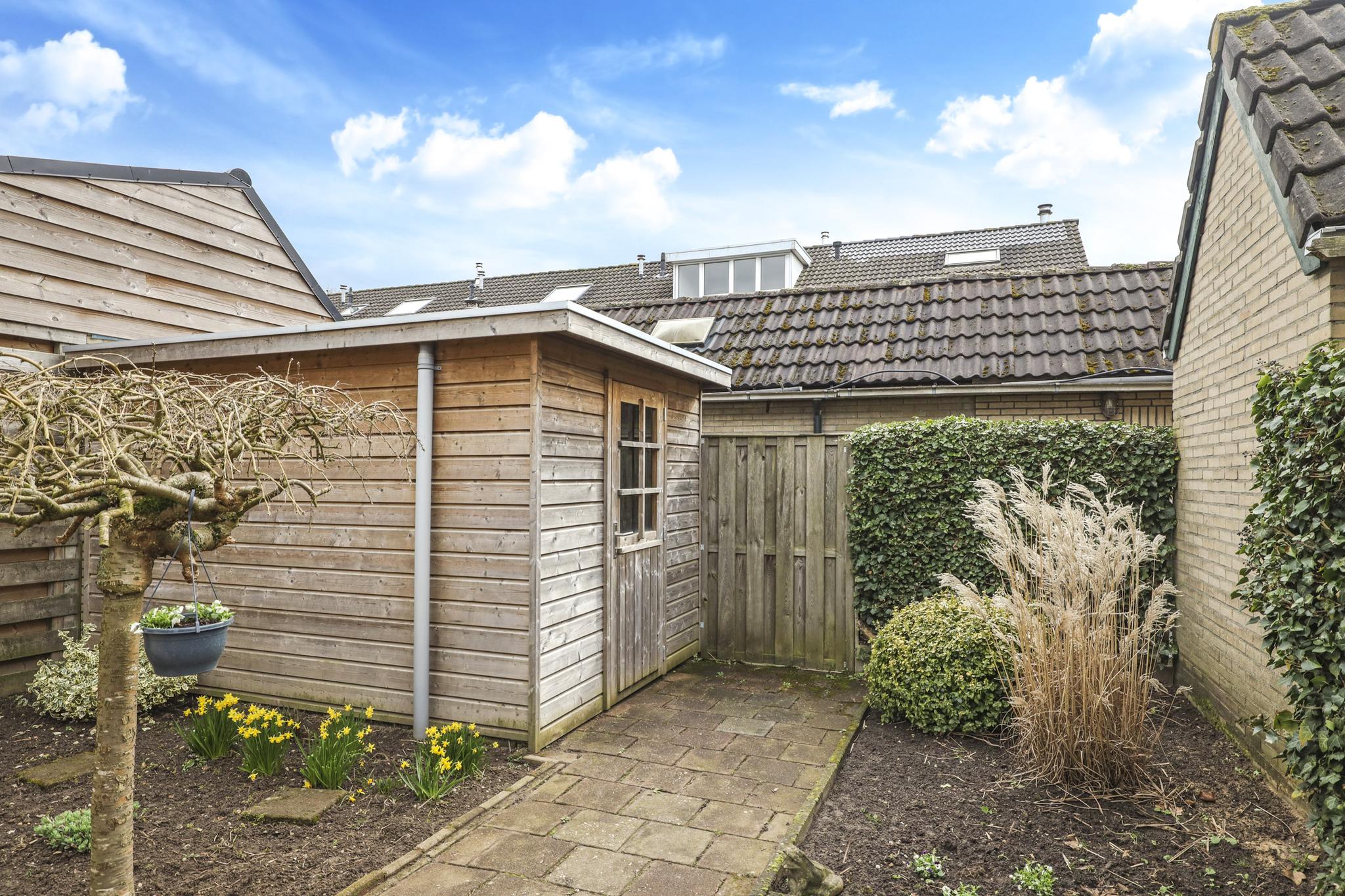 Door de hoekligging van de woning is de achtertuin bijna 7 meter breed. De achtertuin is daarbij vol op het zuiden gelegen waardoor je van veel zon kunt genieten. Achter in de tuin staat een houten schuur. De tuin is aangekleed met plantenborders voor een groene uitstraling en een terras aan het huis. Je kan hier met gemak meerdere zithoeken creëren. De tuin is via een poort aan de zijkant van de woning bereikbaar.