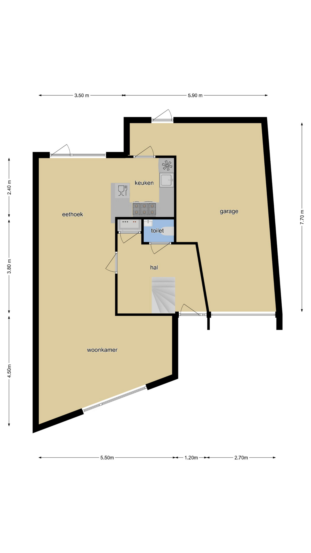 De woonkamer ligt aan de voorzijde van de woning. Door de schuin lopende voorgevel heb je hier een unieke ruimte. Desondanks is de kamer goed in te richten met bijvoorbeeld een grote hoekbank. In de lengte van de woning is voldoende ruimte voor een 6-persoons eettafel. De eethoek staat hierbij in contact met de open keuken. Met een grote raampartij geniet je hier van veel lichtinval. Op de vloer ligt een houten parketvloer welke de ruimte een warme uitstraling geeft.