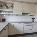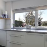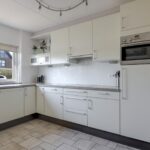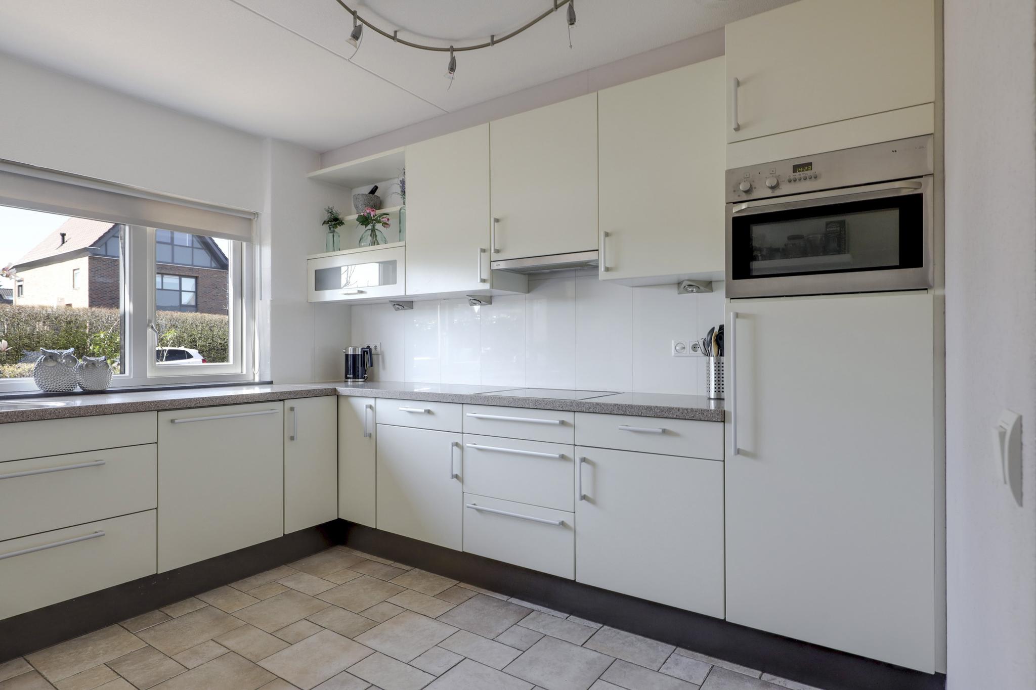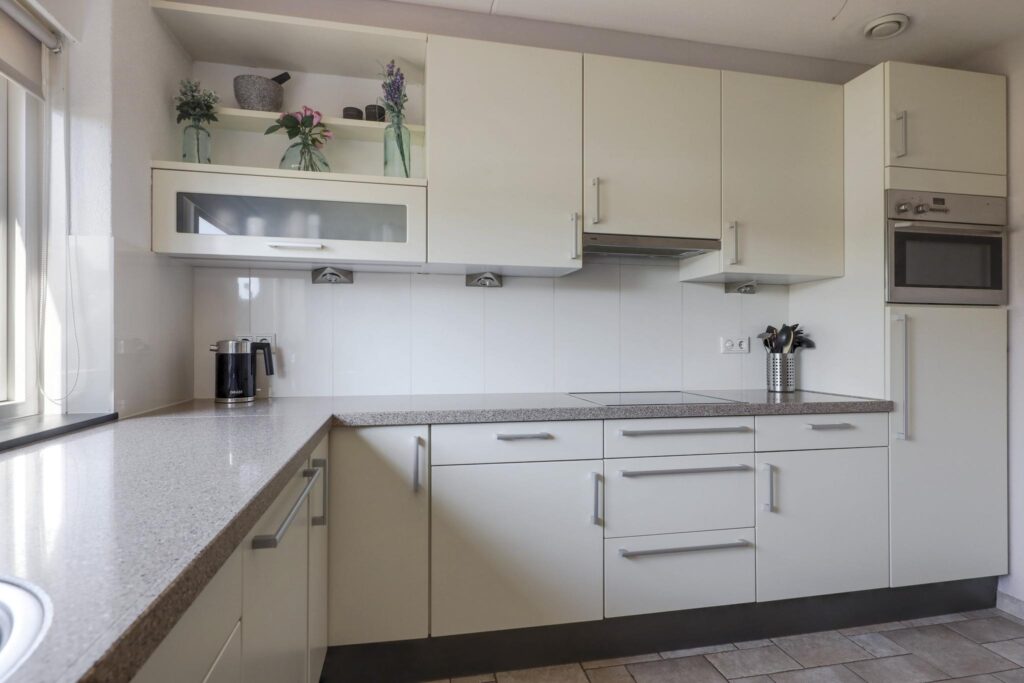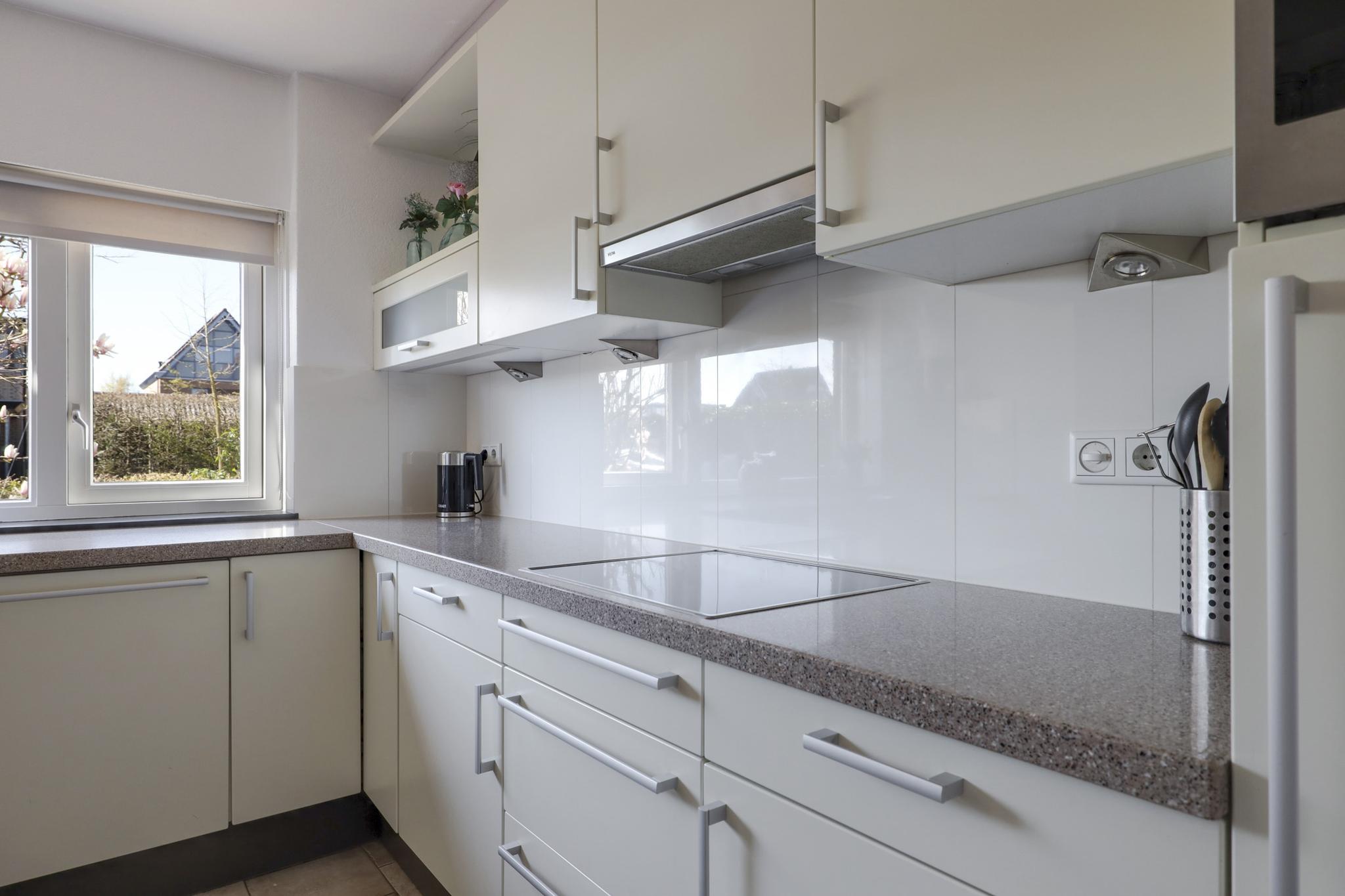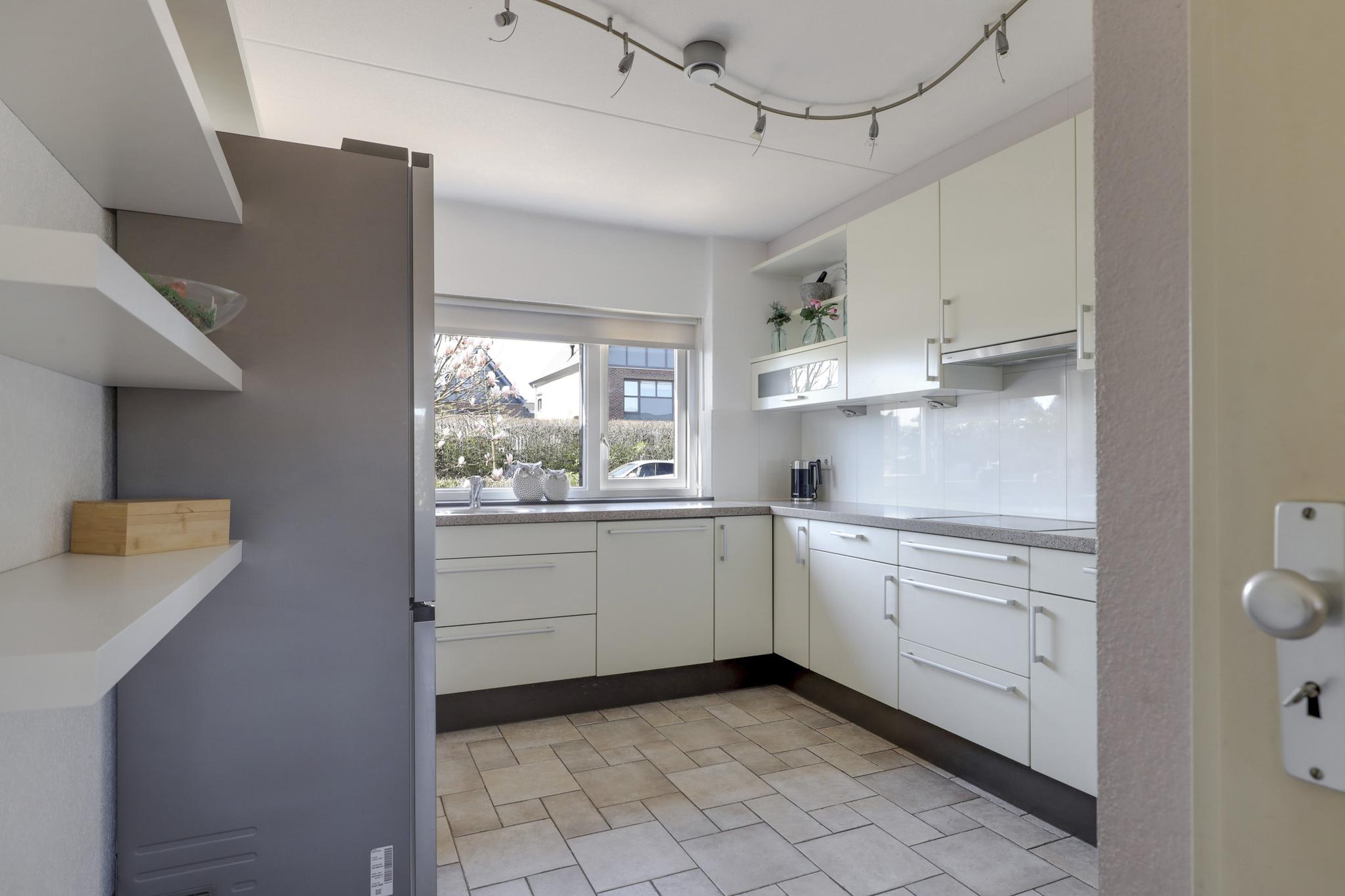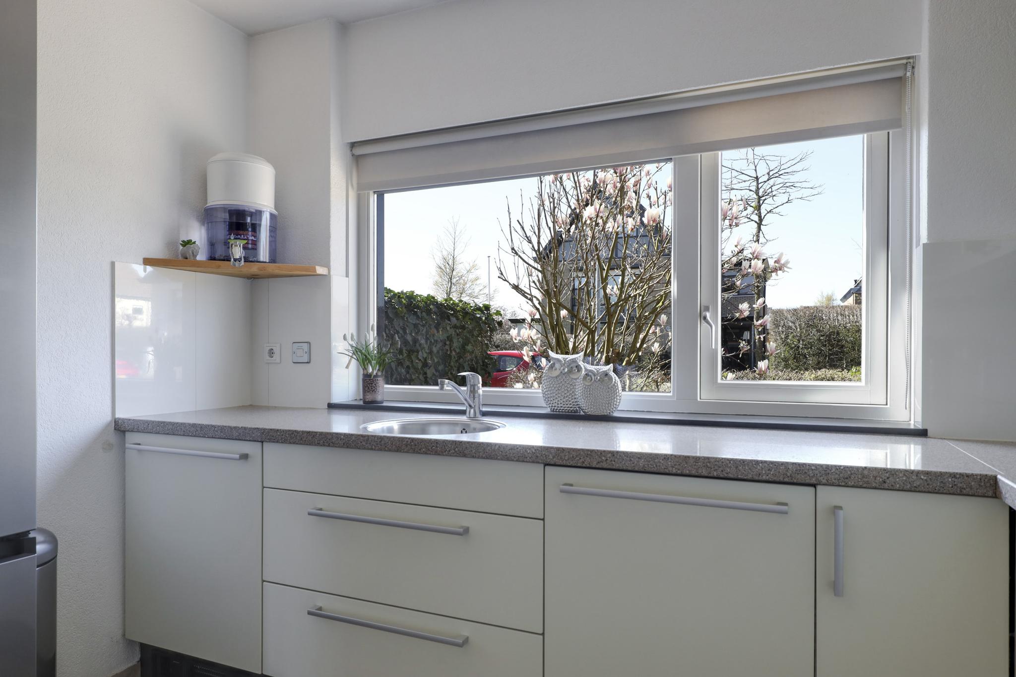 De keuken is aan de voorzijde gelegen en heeft een half-open verbinding met de woonkamer. Het keukenblok is in hoekopstelling geplaatst en voorzien van alle luxe en comfort. Het aanrecht is van natuursteen (composiet) en de inbouwapparatuur bestaat uit een vaatwasser, een koelkast, een 4-pits keramische kookplaat met afzuiger en een combi-oven/magnetron. Er is veel praktische opbergruimte aanwezig, waaronder diepe, brede lades en bovenkastjes. Onder deze kastjes is spotverlichting aangebracht. De keuken heeft een moderne uitstraling en neutrale kleurstellingen. De opzet van de keuken is ruim genoeg om er nog een ontbijttafel kwijt te kunnen. En nog een laatste puntje: het uitzicht aan de voorzijde is erg prettig, mede door de brede opzet van de straat en de tegenover gelegen, vrijstaande woningen.