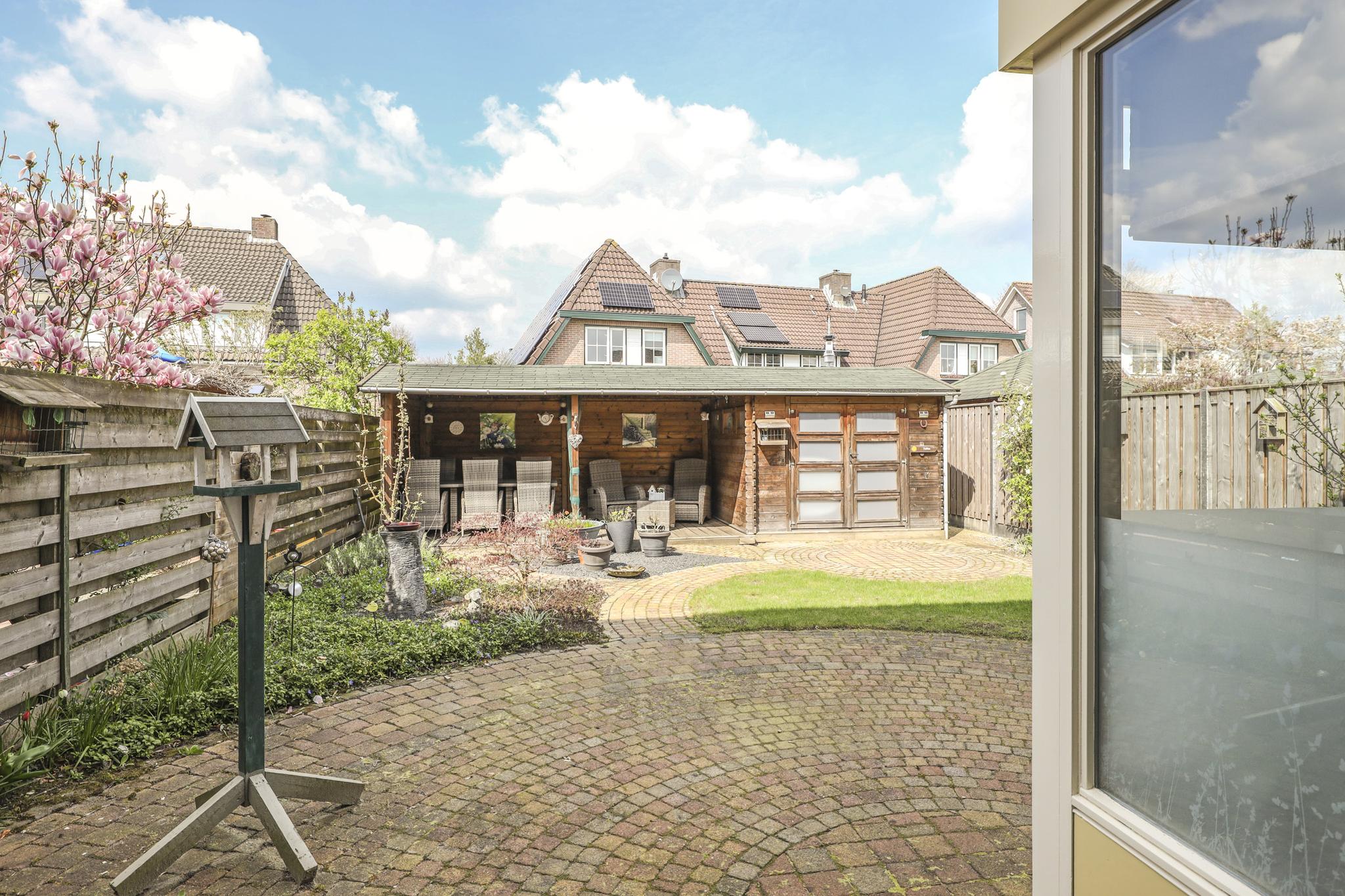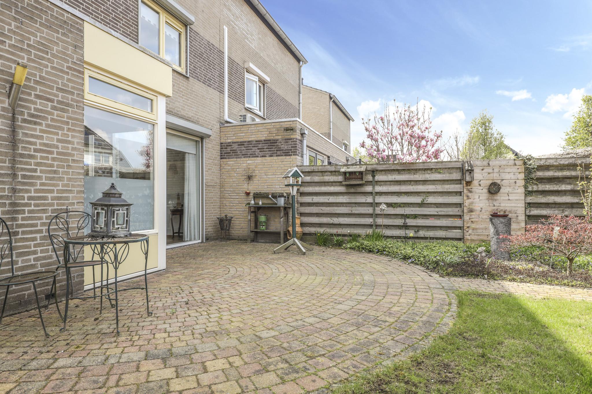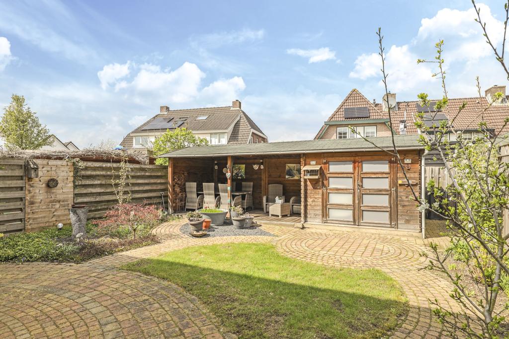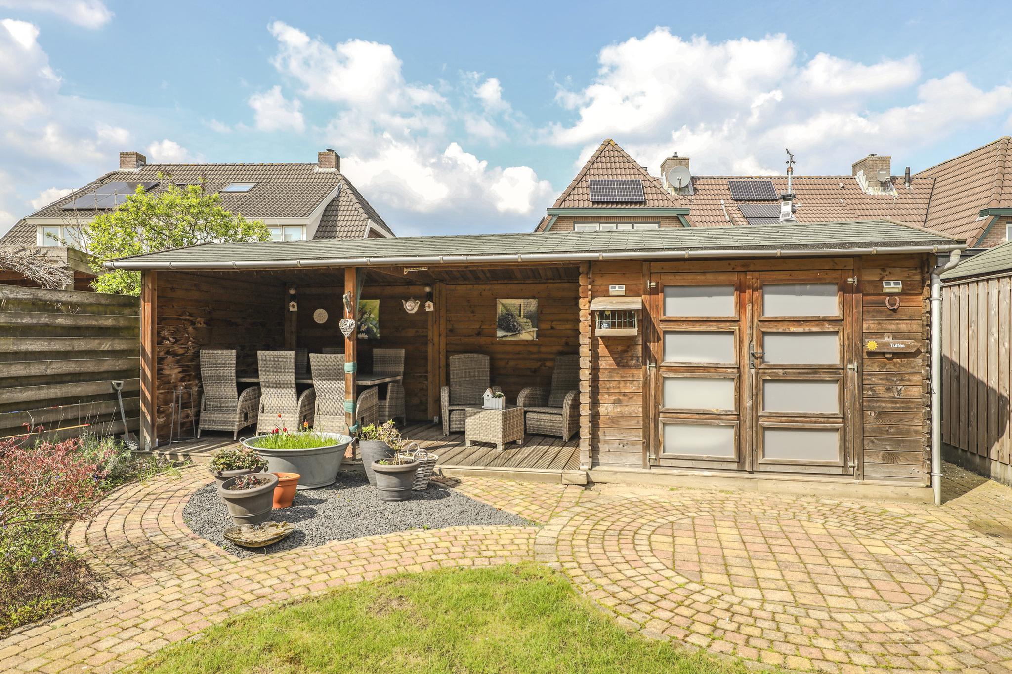 Bij deze woning hoort een comfortabele achtertuin. De tuin is ingericht met meerdere terrassen waardoor er altijd een plekje in de zon of schaduw is. Diverse planten en gras geven de tuin een groene onderbreking. Achter in de tuin staat een houten schuur met aangebouwde veranda. De veranda is ruim opgezet waardoor je hier meerdere zithoeken kunt creëren. De schuur is aan de voorzijde voorzien van openslaande deuren waardoor je eenvoudig spullen kunt opbergen. De schutting aan de rechterzijde is vervangen voor een solide exemplaar met betonpalen.