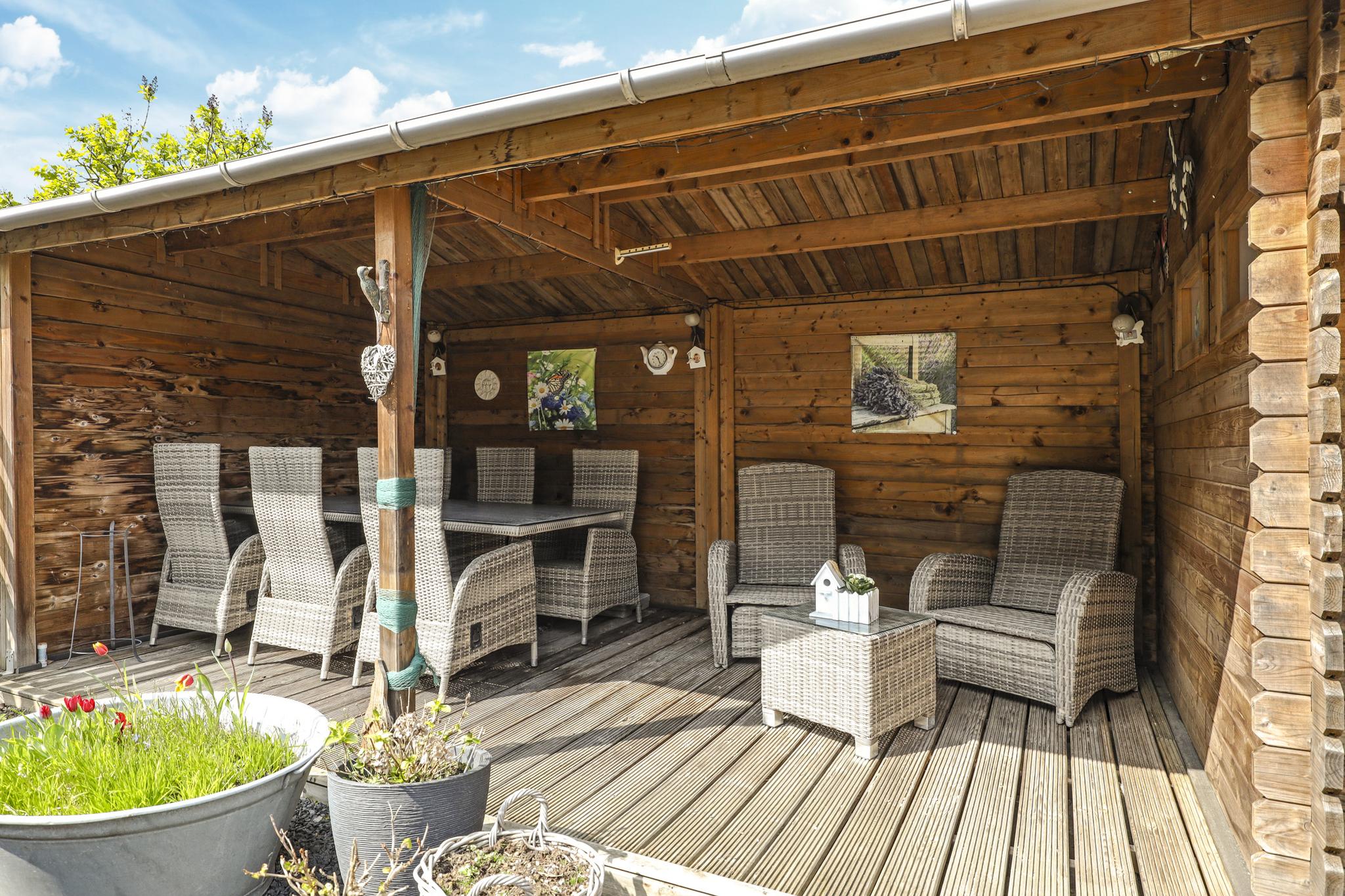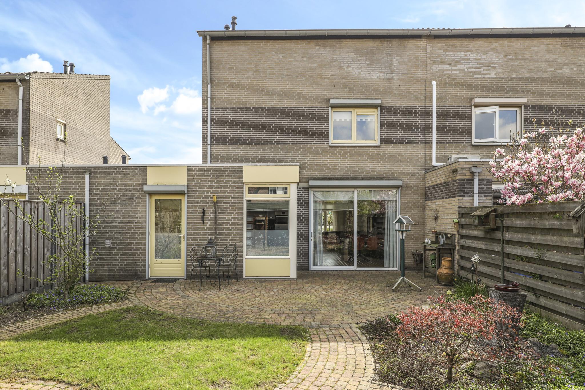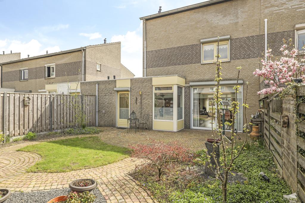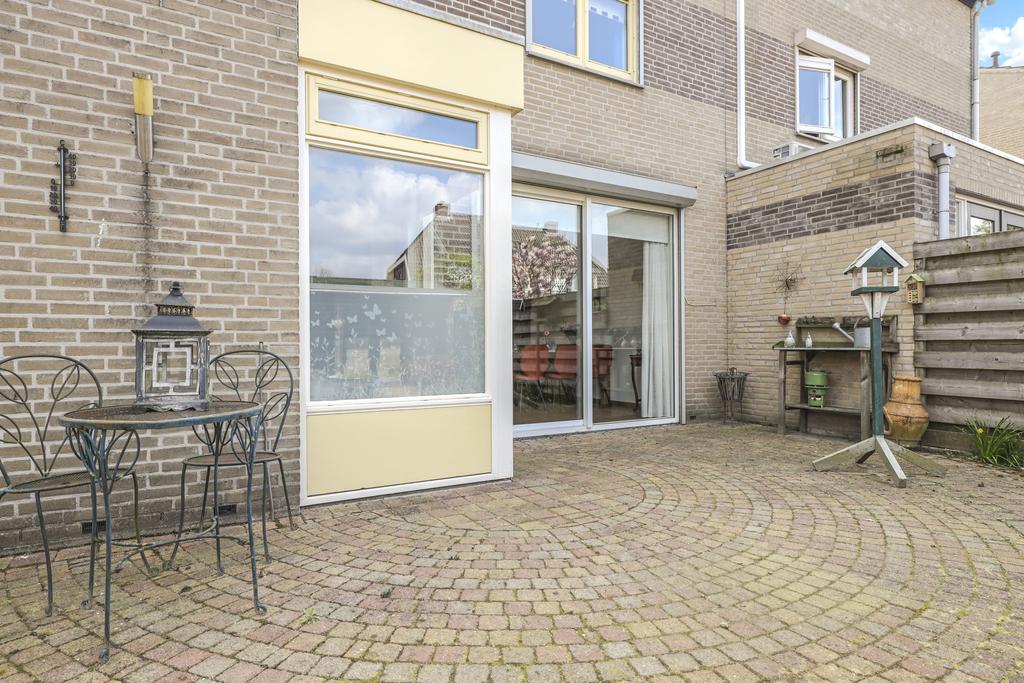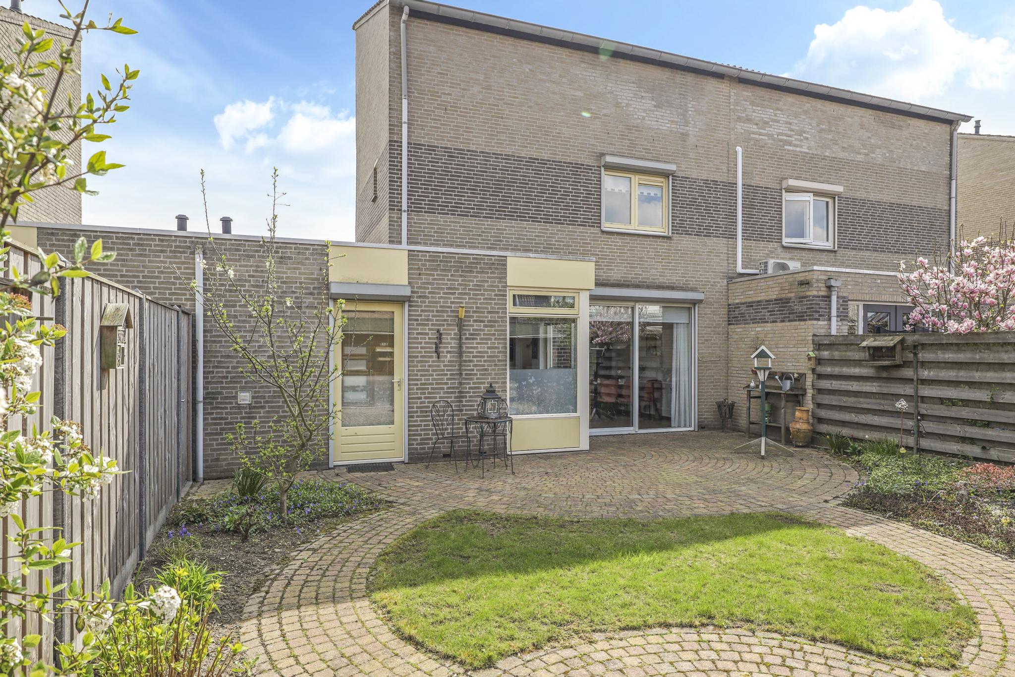 Bij deze woning hoort een comfortabele achtertuin. De tuin is ingericht met meerdere terrassen waardoor er altijd een plekje in de zon of schaduw is. Diverse planten en gras geven de tuin een groene onderbreking. Achter in de tuin staat een houten schuur met aangebouwde veranda. De veranda is ruim opgezet waardoor je hier meerdere zithoeken kunt creëren. De schuur is aan de voorzijde voorzien van openslaande deuren waardoor je eenvoudig spullen kunt opbergen. De schutting aan de rechterzijde is vervangen voor een solide exemplaar met betonpalen.