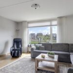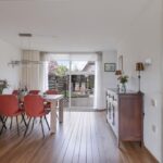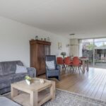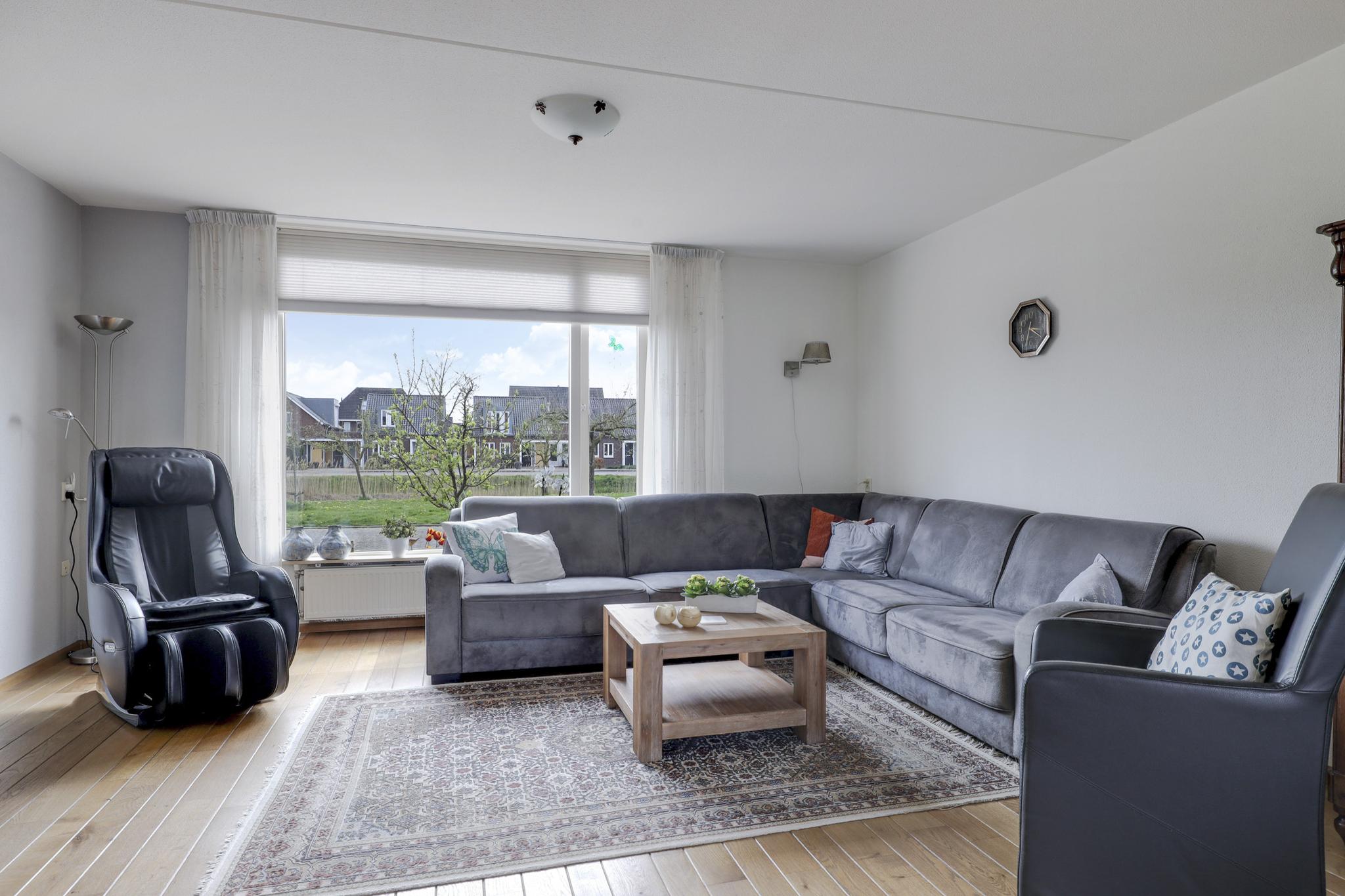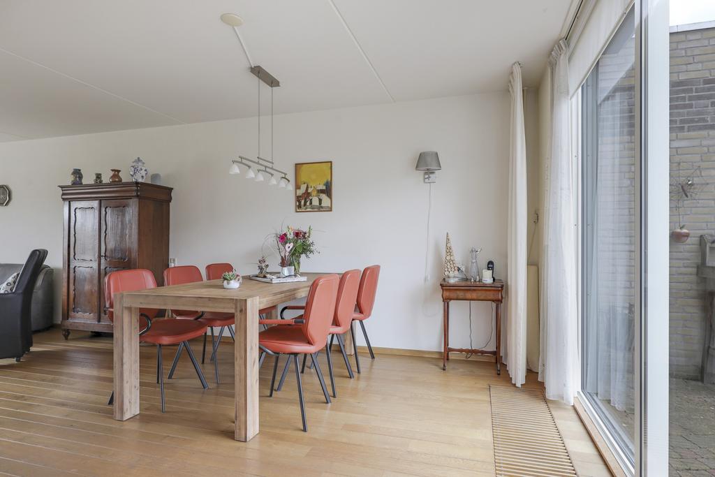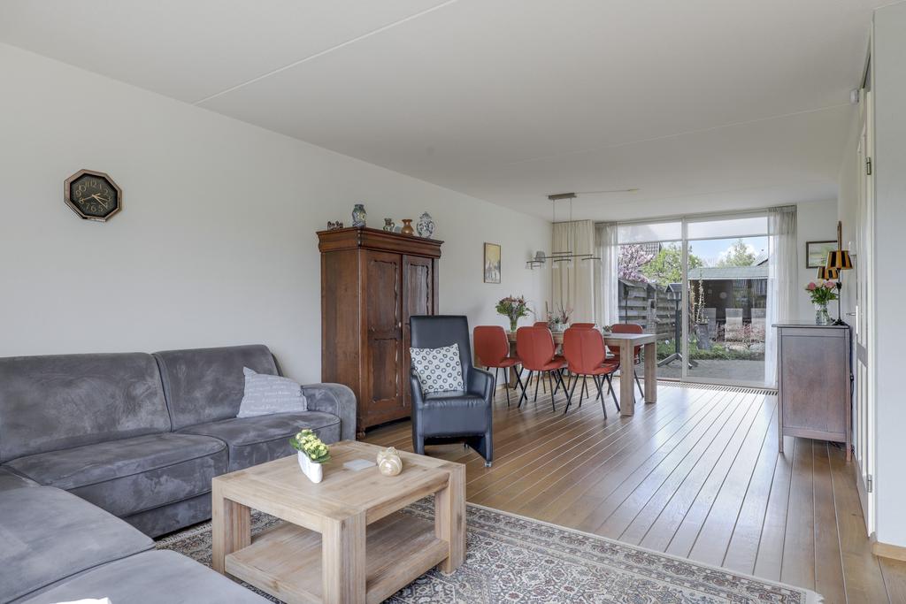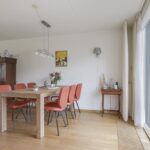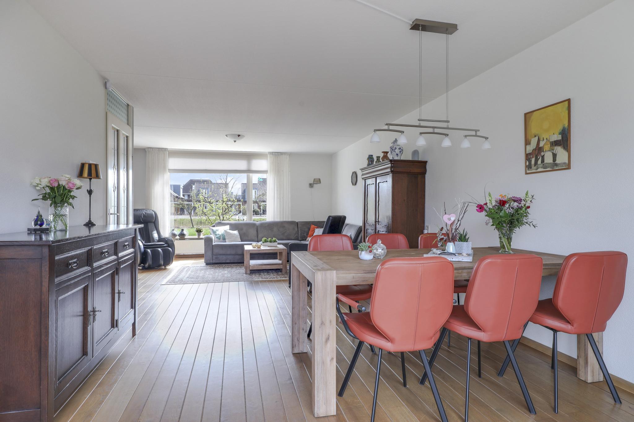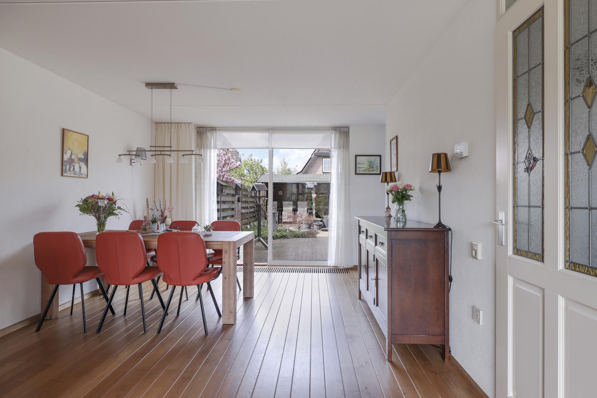 Deze woning heeft een klassieke doorzonwoonkamer met grote raampartijen in zowel de voor- als achtergevel. Aan de voorzijde van de woning is een brede groenstrook gelegen waardoor je hier fijn van je af kijkt. Aan de achterzijde zit een schuifpui waardoor je in de zomerdag zo de achtertuin in loopt. Op de vloer ligt een verzorgde houten vloer die de lengte van de kamer accentueert. Stijlvol is de deur naar de hal welke is voorzien van glas-in-lood ramen.