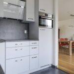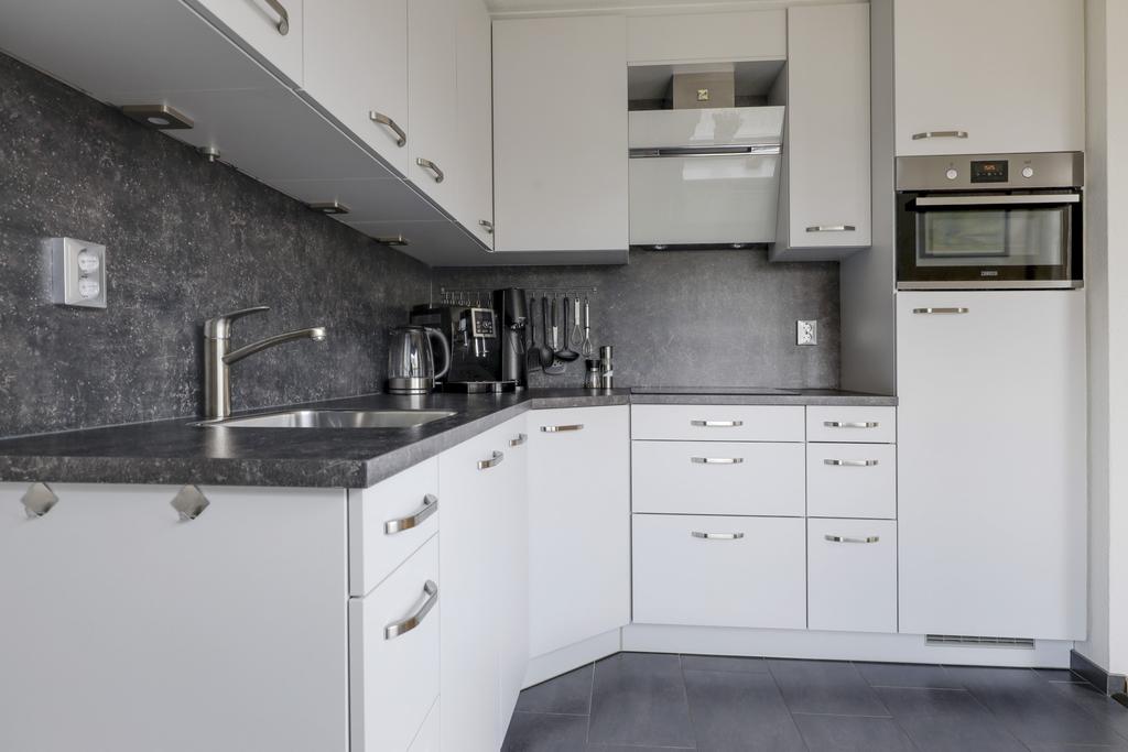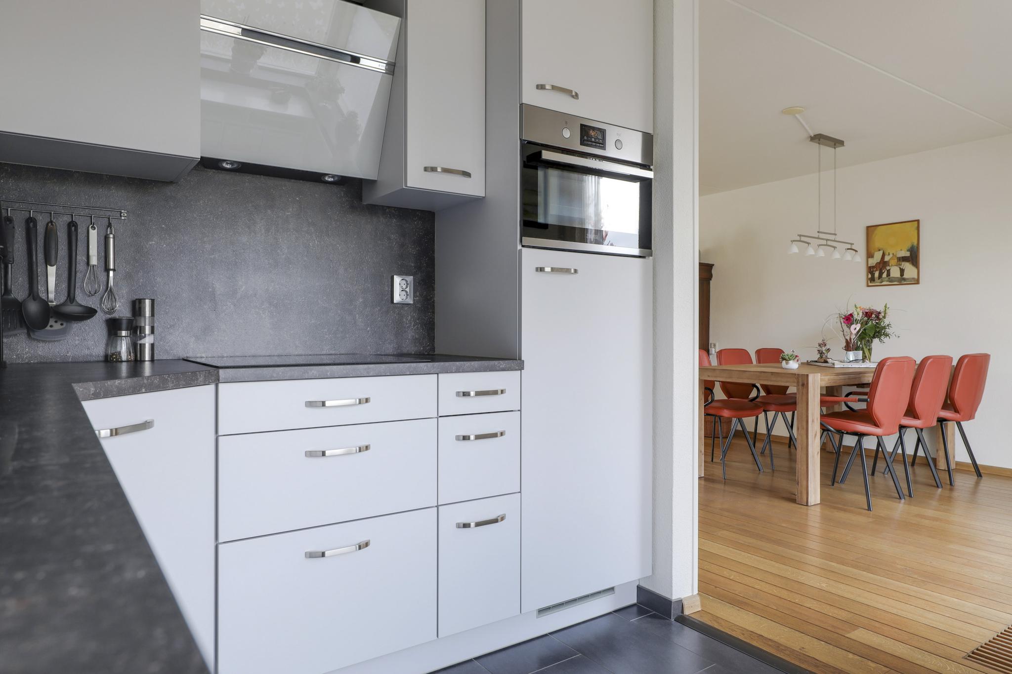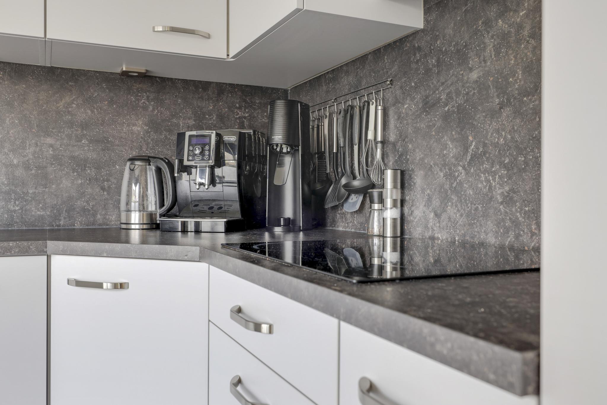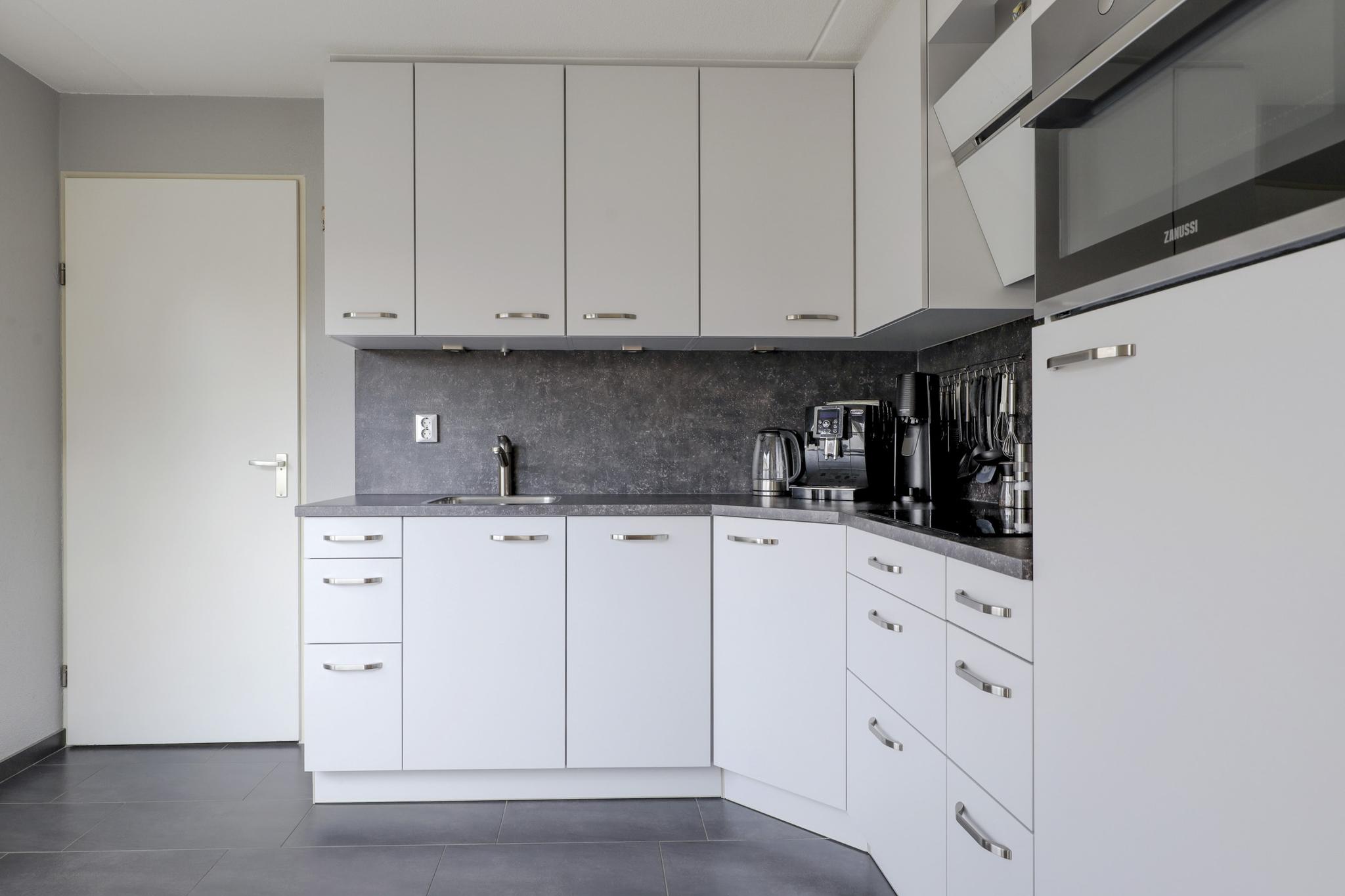 De keuken is aan de achterzijde van de woning. Ook hier tref je grote raampartijen waardoor de keuken licht en ruimtelijk aanvoelt. Het keukenblok is slechts 5 jaar oud en in een hoekopstelling geplaatst. Bovenkasten bieden hierbij extra opbergruimte en deze zijn tevens voorzien van spotverlichting. De kleurstelling is klassiek met witte fronten en een donker werkblad. De aanwezige inbouwapparatuur bestaat uit een inductiekookplaat, een afzuigkap, combi-oven/magnetron, een koelkast en een vaatwasser.