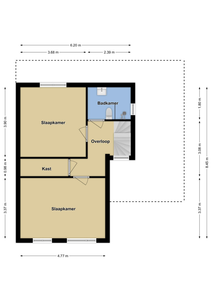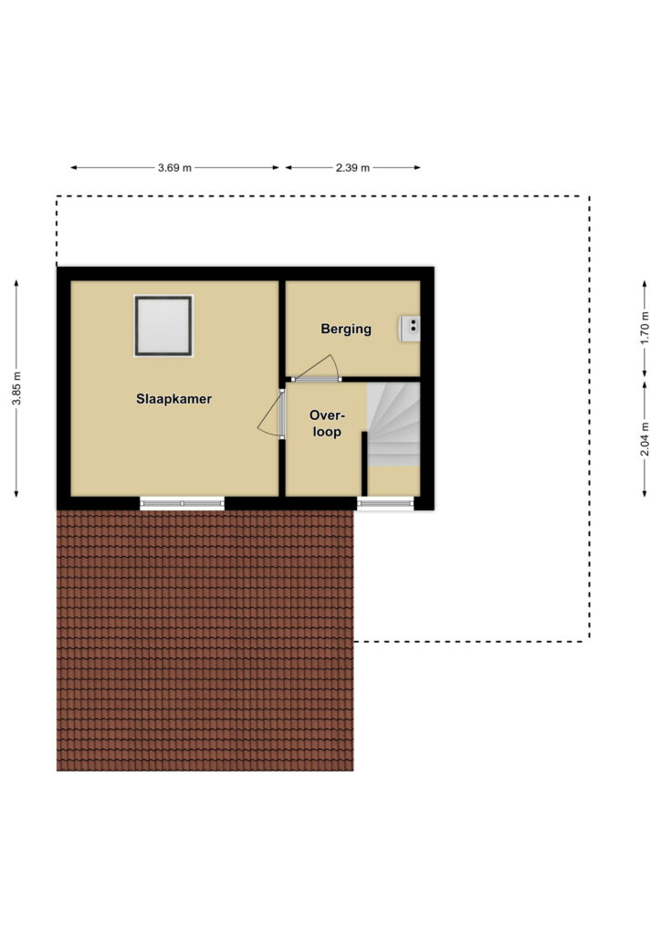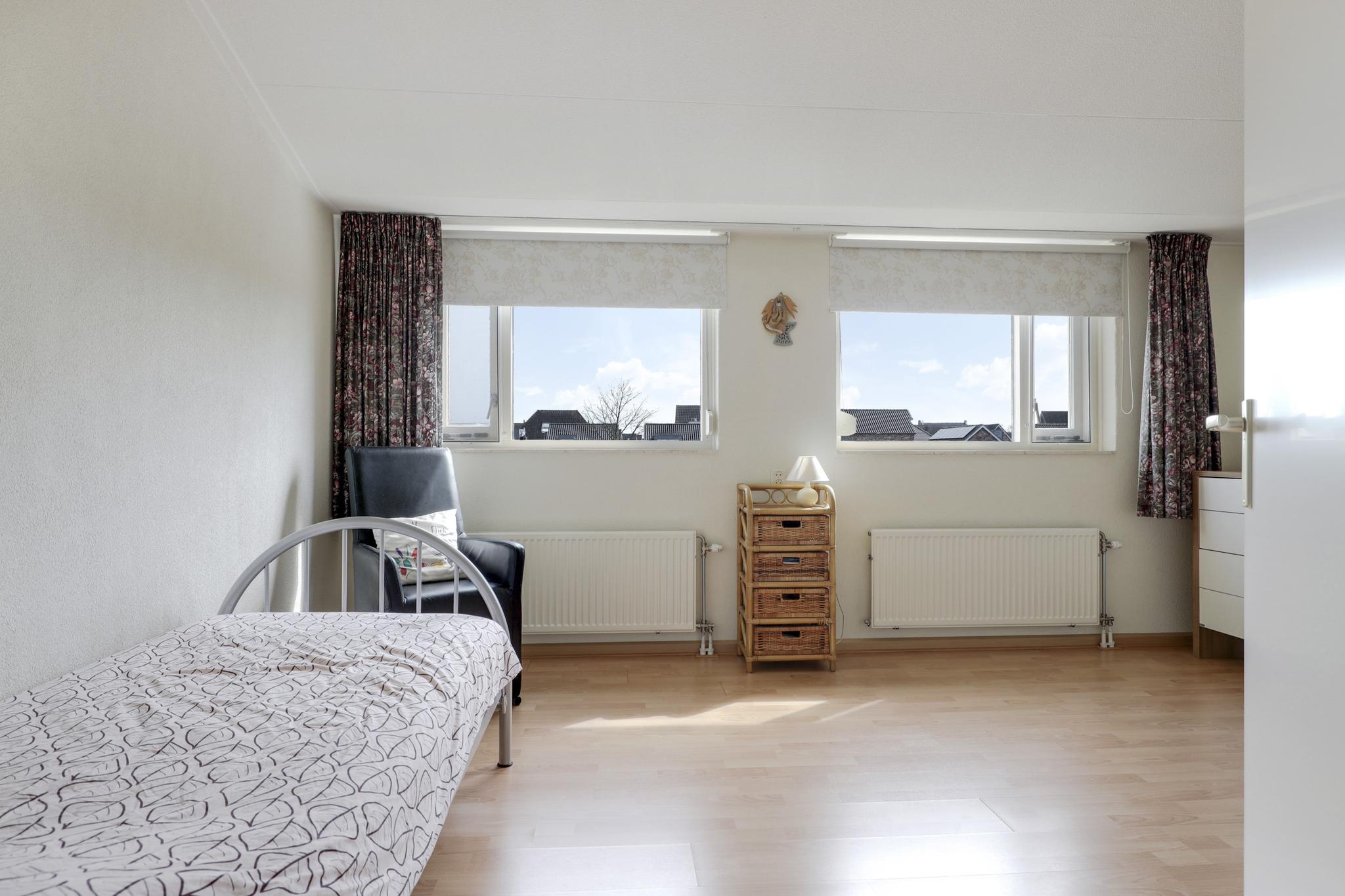 Via een vaste trap is de 2e verdieping te bereiken. Deze volwaardige woonlaag is opgedeeld in een overloop, een slaapkamer en een berging. De slaapkamer doet met ca. 14m² grootte niet onder ten opzichte van de andere 2 slaapkamers. Een dakraam biedt de kamer extra lichtinval. De berging is ruim opgezet en biedt veel praktische opbergruimte. Ook tref je hier de opstelling van de cv-ketel aan.