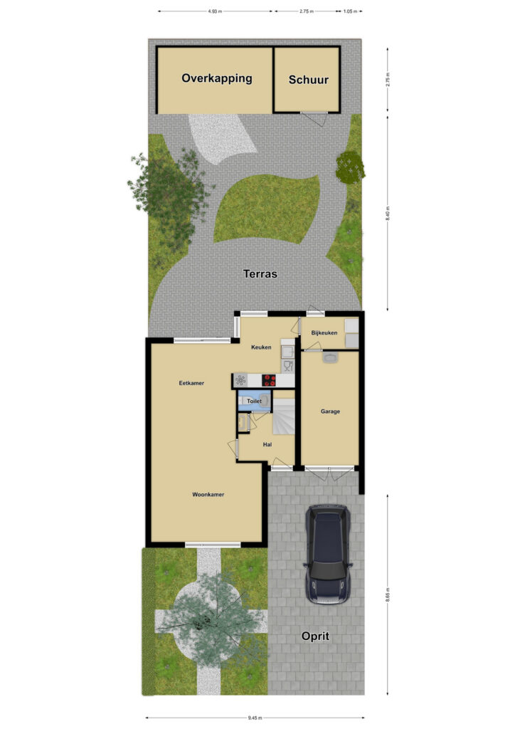 De achtertuin heeft een mooi rechthoekig formaat en is aangelegd met meerdere terrassen. Achter in de tuin staat nog een veranda met schuur. De garage is binnendoor bereikbaar en hiervoor kan je gemakkelijk op eigen terrein parkeren. De woning heeft een centrale ligging in het dorp met alle voorzieningen op loopafstand.