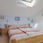 Op de 1e verdieping verbindt de overloop de 2 slaapkamers, de badkamer en de inloopkast met elkaar. Oorspronkelijk werden deze woningen gebouwd met 3 slaapkamers, hier is gekozen voor 2 grote slaapkamers en een inloop kast. De slaapkamers zijn respectievelijk 16m² en 14m² groot. De slaapkamers aan de voorzijde heeft een schuin dakvlak wat door het hoge plafond een ruimtelijk gevoel geeft. De slaapkamer aan de voorzijde heeft screens, de slaapkamer aan de achterzijde is voorzien van een rolluik. De inloopkast tussen de slaapkamers biedt extra opbergruimte.
