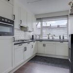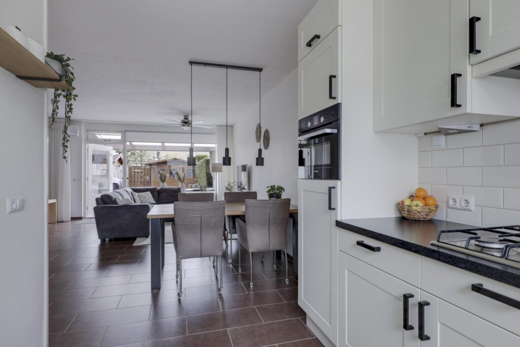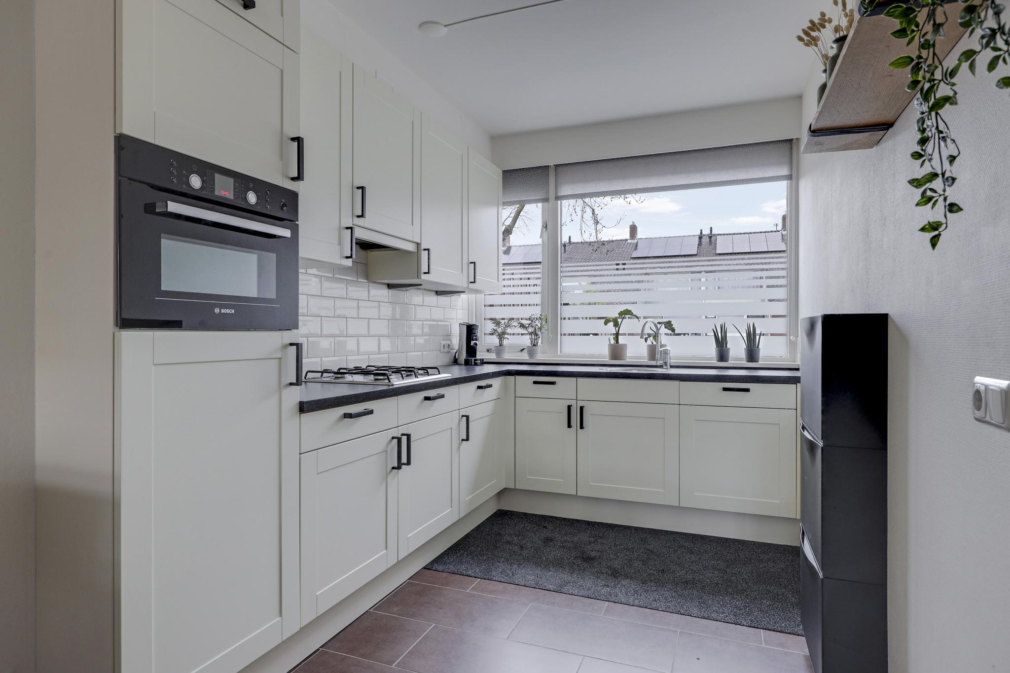 Bij deze woning hoort een open keuken, waardoor deze in verbinding staat met de woonkamer. Het keukenblok is in een hoekopstelling geplaatst en voorzien van een trendy kleurstelling. Alle wenselijke inbouwapparatuur is aanwezig, zijnde een vaatwasser, een 4-pits gaskookplaat, een afzuigkap, een combi-oven/magnetron en een koelkast. Mocht je nog opbergruimte te kort komen, dan is er altijd nog de naast gelegen trapkast waar je de nodige voorraad kwijt kunt.