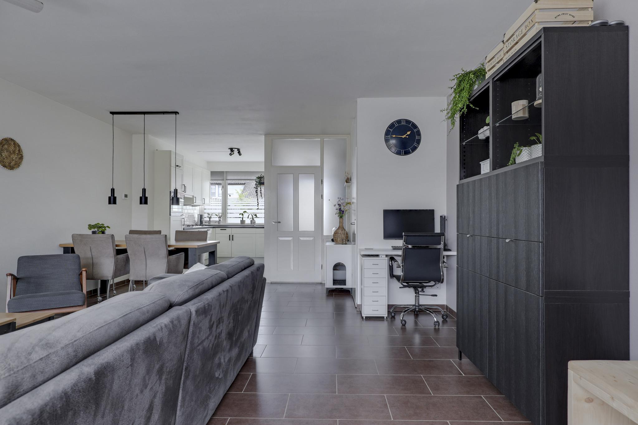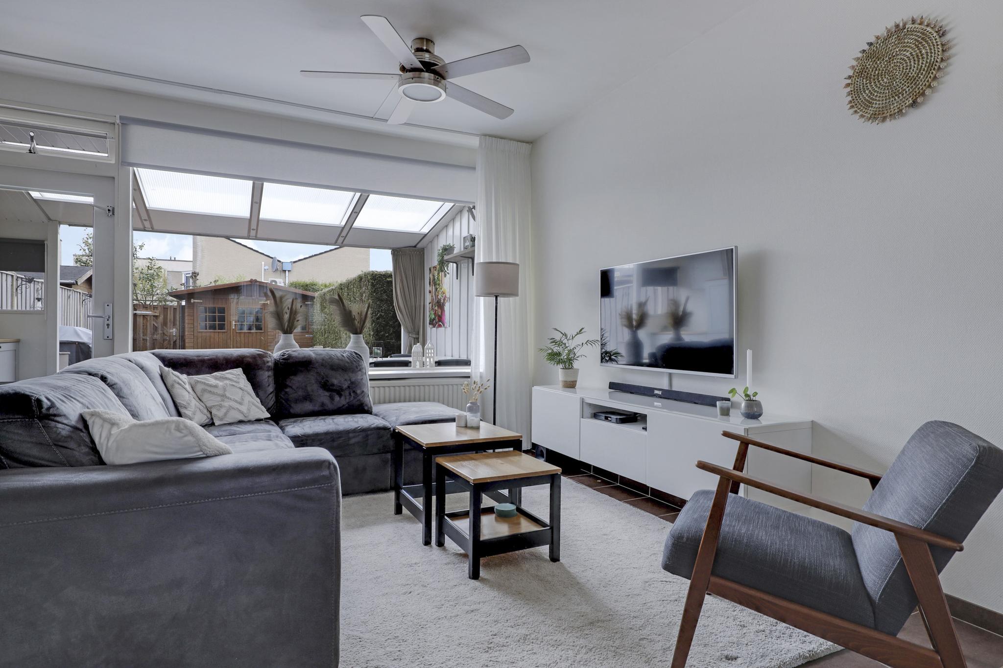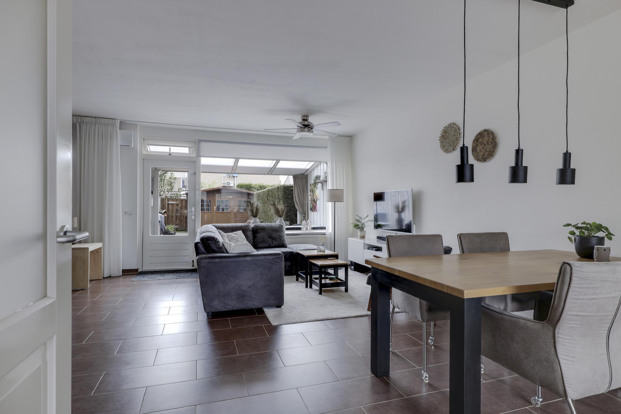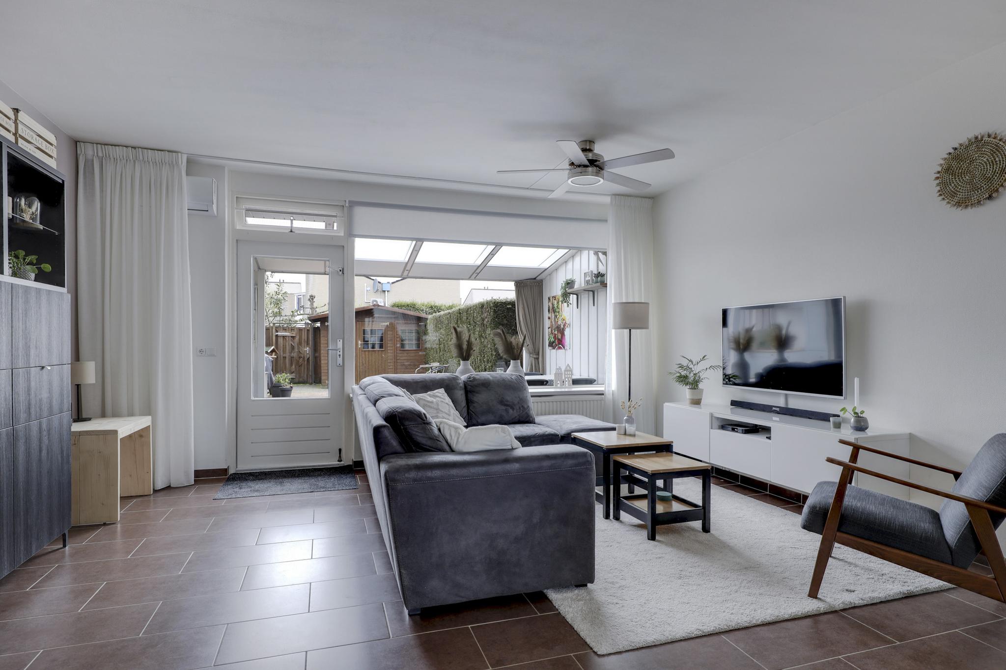 De woonkamer bevindt zich aan de achterzijde van de woning en is daarmee tuingericht. Een grote raampartij biedt hier veel lichtinval. De ruimte heeft een praktische indeling waardoor je deze gemakkelijk in kunt richten. Op de vloer liggen plavuizen welke aangenaam aanvoelen door de aanwezige vloerverwarming (bijverwarming). In de woonkamer is airconditioning aanwezig waardoor je de kamer heerlijk koel houdt in de zomer. Extra opbergruimte vind je in de trapkast. Een groot pluspunt is dat je hierbij in de zomerdag direct de tuin in loopt.