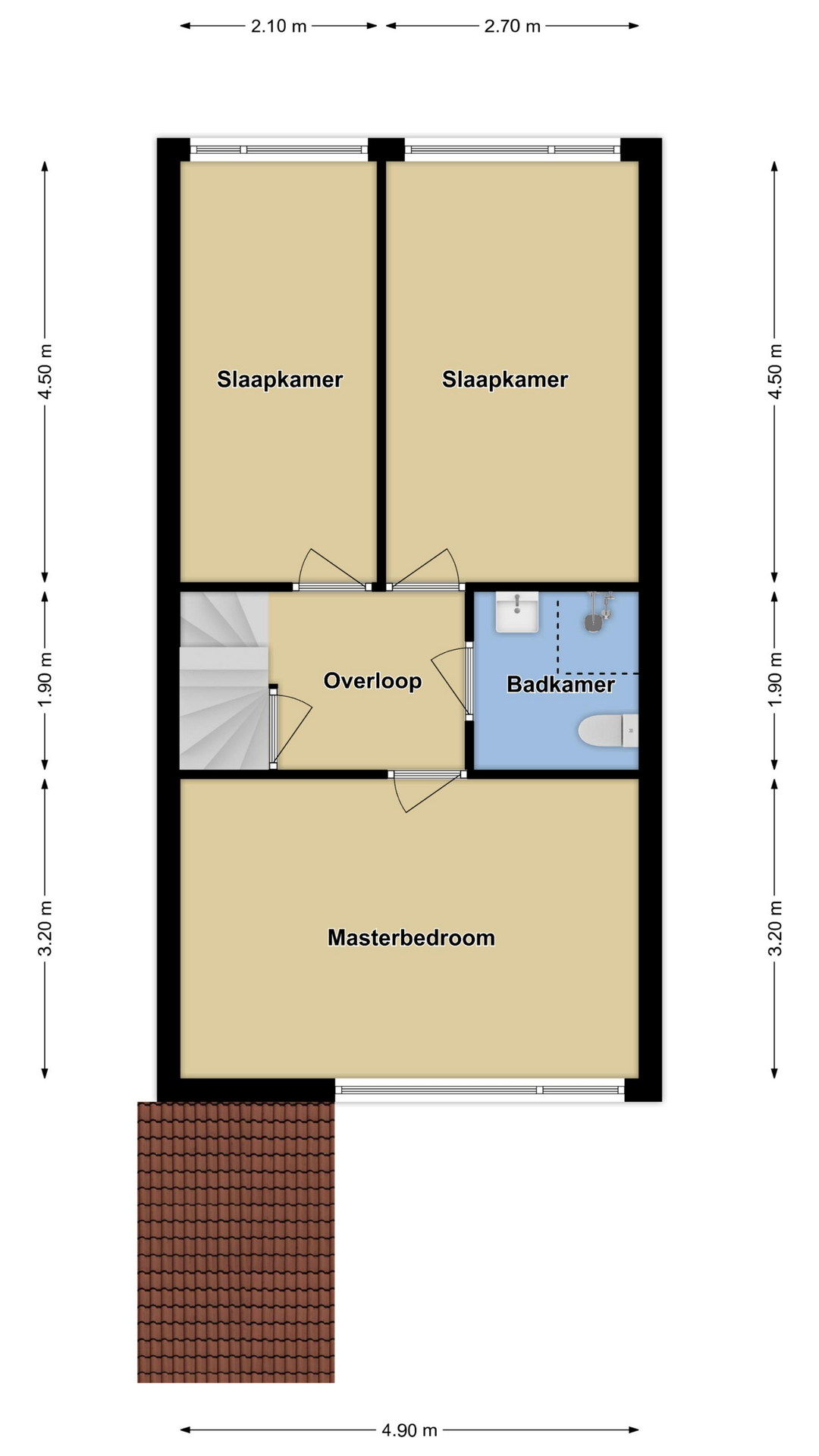 Via de trapopgang in de hal komen we op de 1e verdieping terecht. Hier schakelt de overloop 3 slaapkamers en de badkamer aan elkaar. Aan voorzijde van de woning tref je de masterbedroom welke over de hele breedte van de woning is geplaatst. Deze kamer is tevens voorzien van airconditioning. Aan de achterzijde van de woning zijn nog 2 slaapkamers aanwezig. Alle 3 de kamers zijn voorzien van een nette laminaatvloer met v-groef, grote raampartijen en rechte wanden. De kamers zijn respectievelijk 16m2, 12m2 en 9m2.