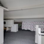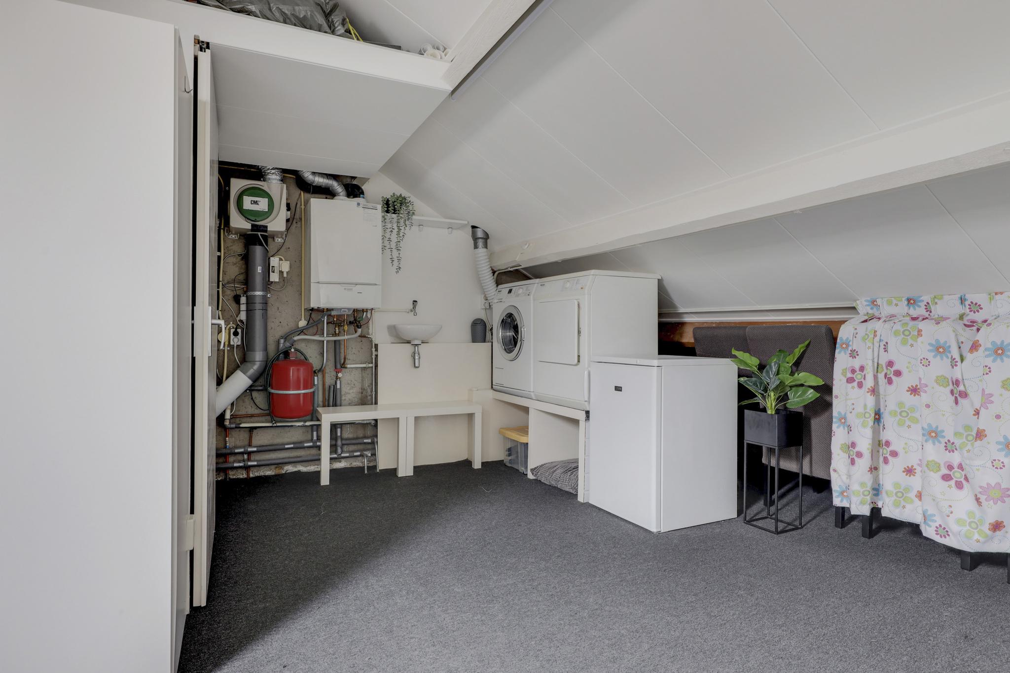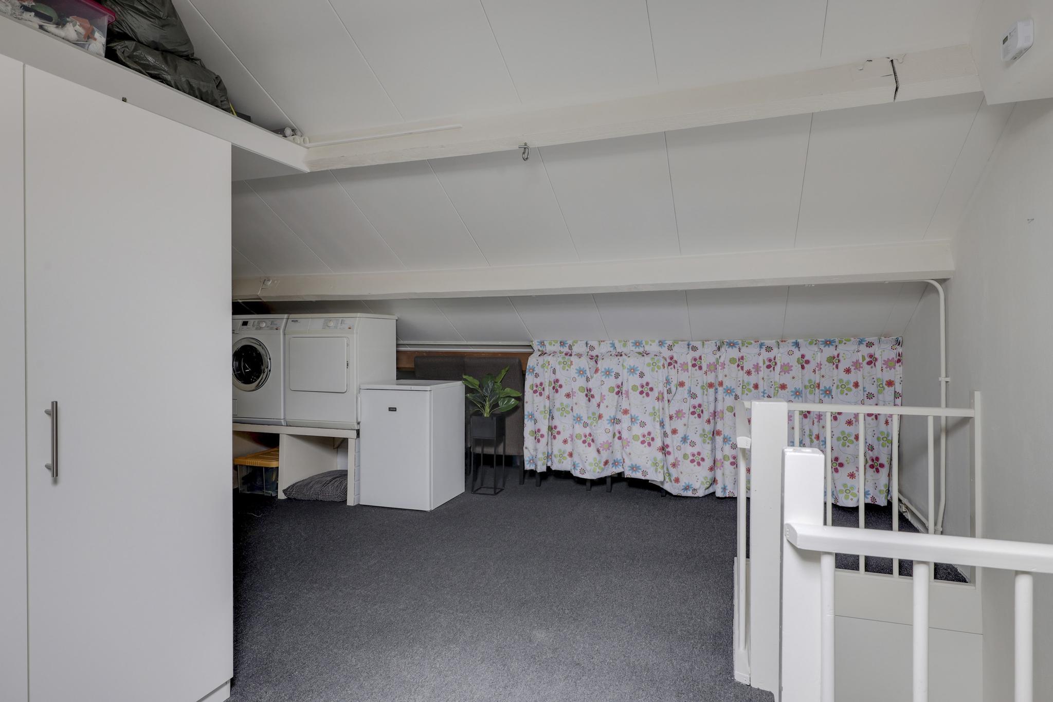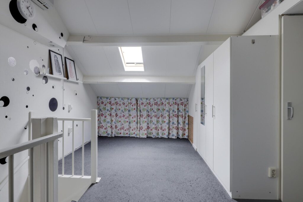 Via de vaste trapopgang bereik je de 2e verdieping. Dit is een open ruimte ingedeeld met een inloopkast. Mocht je thuis werken, dan kan je hier uitstekend een werkplek creëren. De inloopkast biedt veel opbergruimte uit het zicht. In de nok boven de inloopkast is nog meer opbergruimte gemaakt. Hierdoor wordt elk hoekje benut. Een dakraam biedt deze woonlaag daglichtinval. Aan de zijkant is een washoek te vinden waar je naast de witgoedaansluitingen ook een wastafel, de mechanische ventilatie unit en de opstelling van de cv-ketel treft.