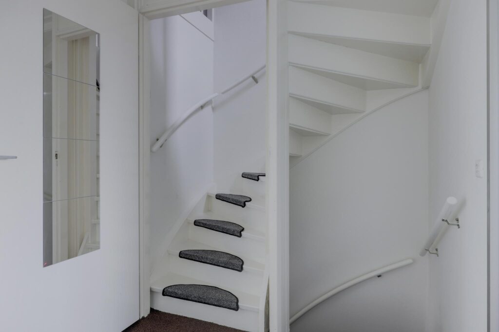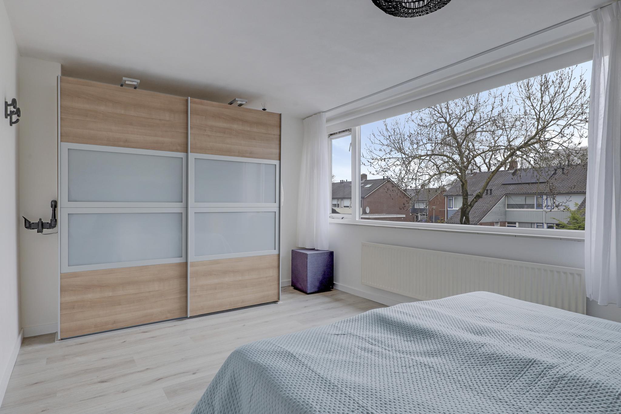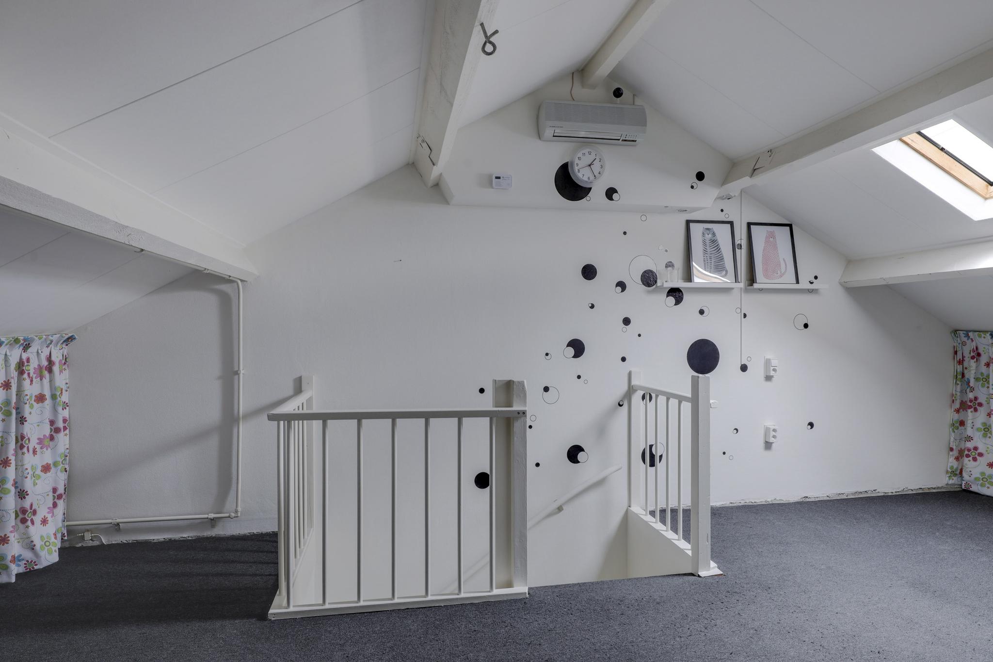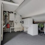 Via de vaste trapopgang bereik je de 2e verdieping. Dit is een open ruimte ingedeeld met een inloopkast. Mocht je thuis werken, dan kan je hier uitstekend een werkplek creëren. De inloopkast biedt veel opbergruimte uit het zicht. In de nok boven de inloopkast is nog meer opbergruimte gemaakt. Hierdoor wordt elk hoekje benut. Een dakraam biedt deze woonlaag daglichtinval. Aan de zijkant is een washoek te vinden waar je naast de witgoedaansluitingen ook een wastafel, de mechanische ventilatie unit en de opstelling van de cv-ketel treft.