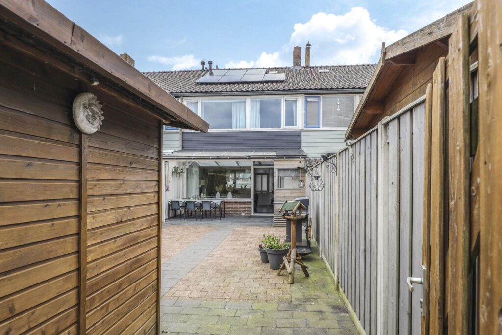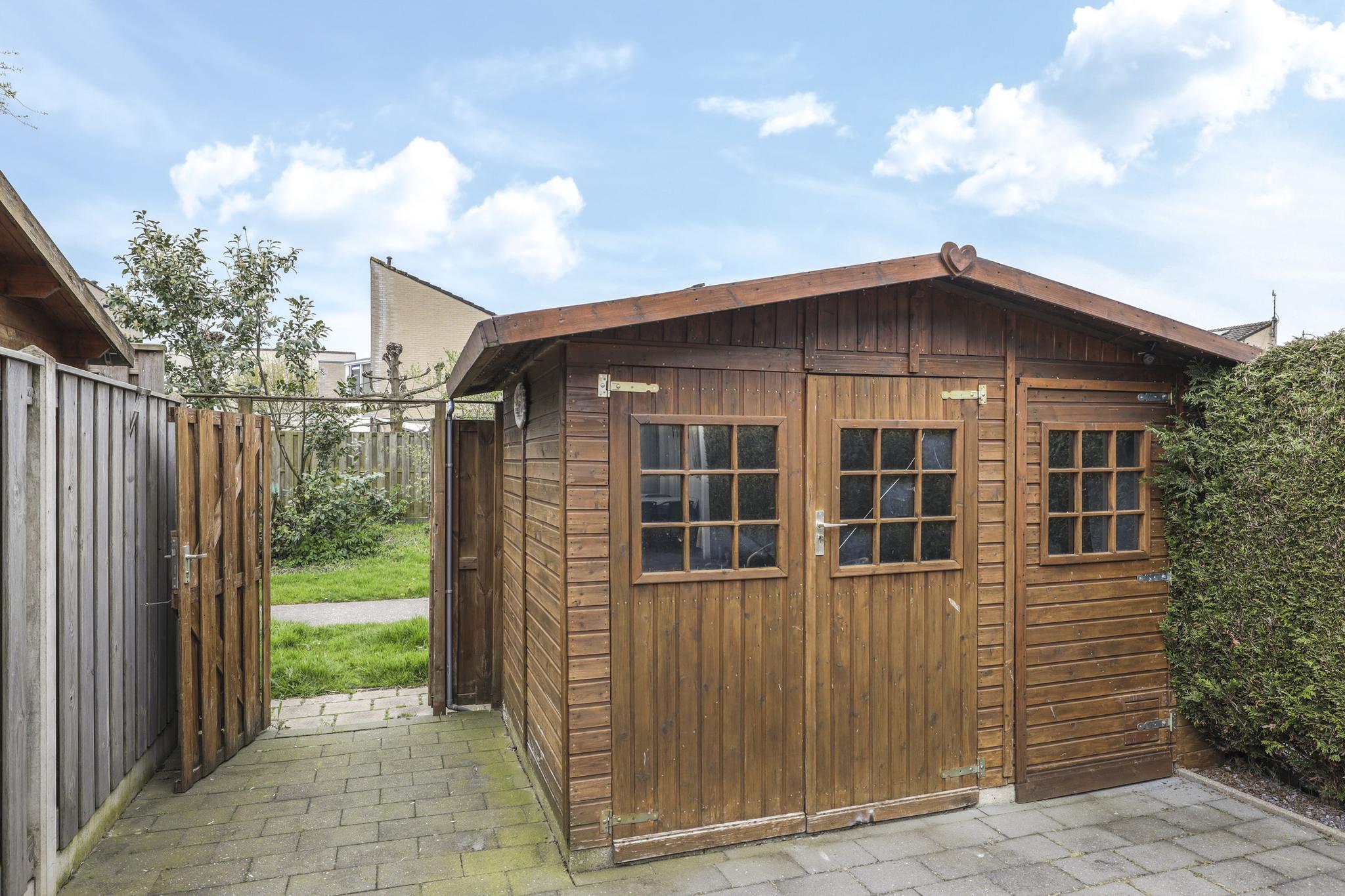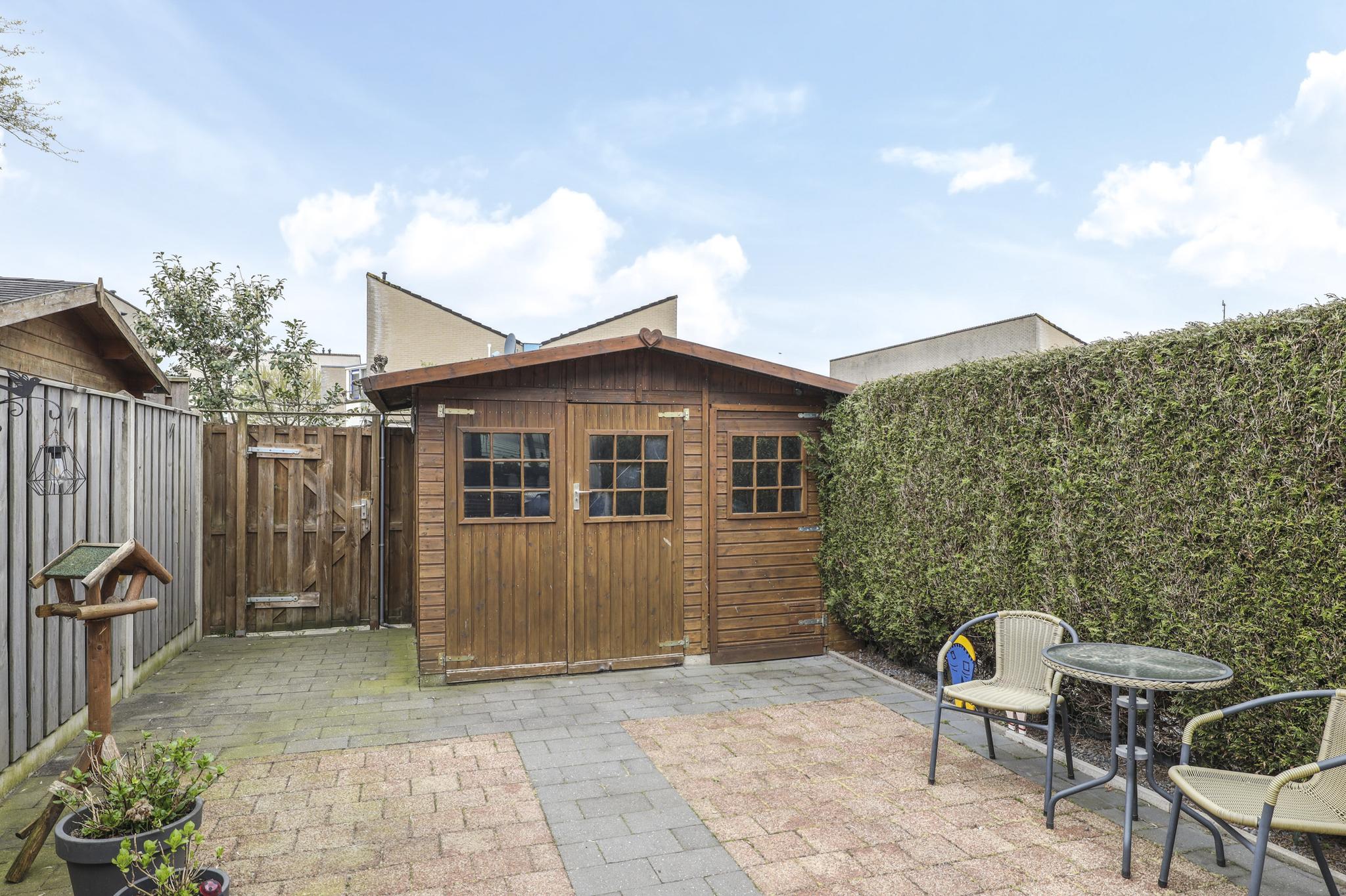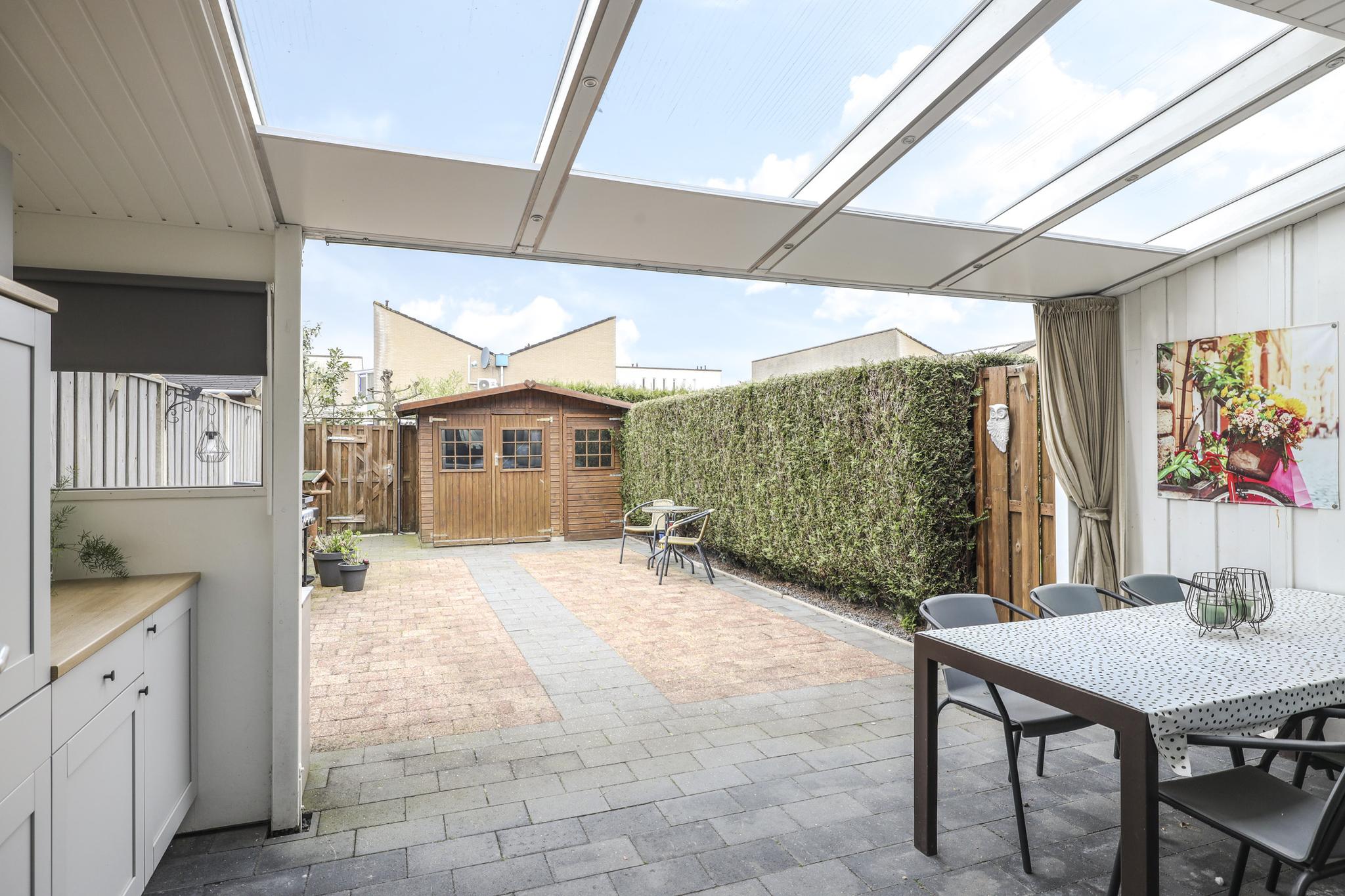Naast een diepe voortuin, is ook de achtertuin zeker de moeite waard. De achtertuin is ingericht met een groot terras waardoor het een onderhoudsvriendelijk karakter heeft. De ligging van de tuin is op het westen waardoor je van veel zon geniet. Direct aan de woning is een veranda geplaatst. Door het gebruik van licht doorlatende dakplaten is dit een lichte ruimte. Ook zijn er inbouwspots geplaatst. Erg praktisch is dat hier keukenkastjes zijn geplaatst waardoor je hier veel opbergruimte hebt. De tuin is verder onderhoudsvriendelijk aangelegd waarbij een groene erfafscheiding met de buren voor een groene uitstraling zorgt. De schuur achter in de tuin is voorzien van dubbele deuren, naast de schuur is een achterom aanwezig.